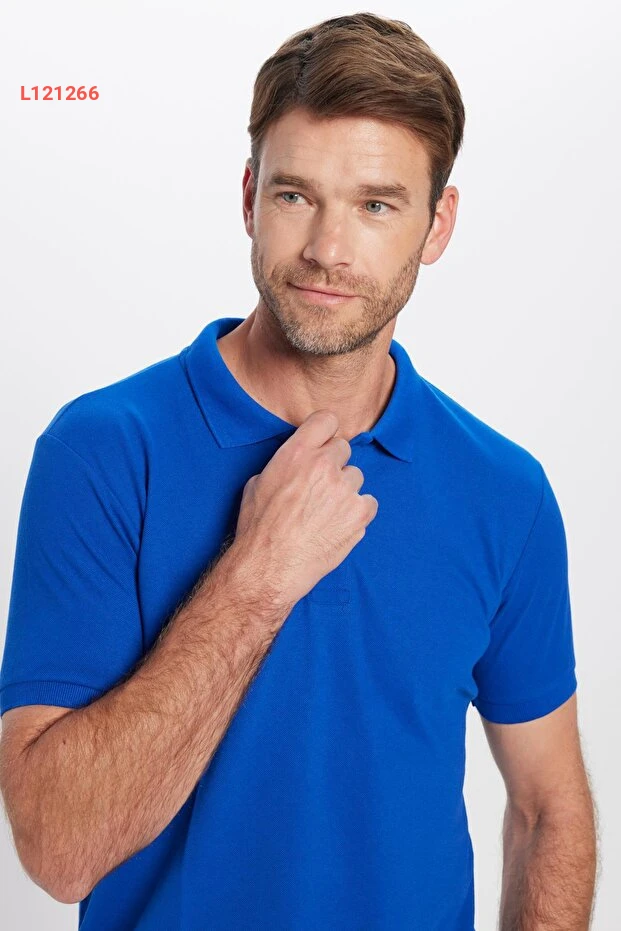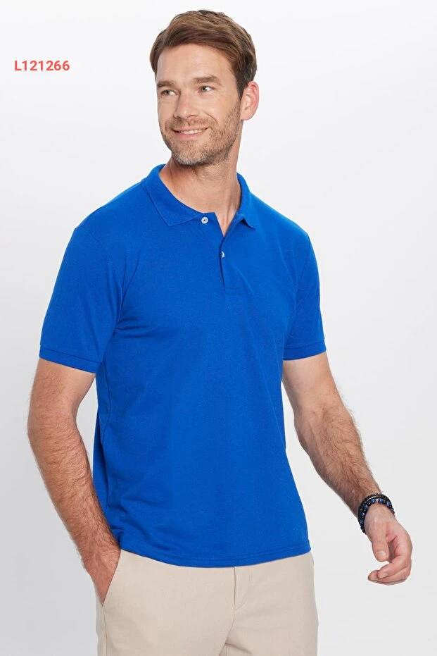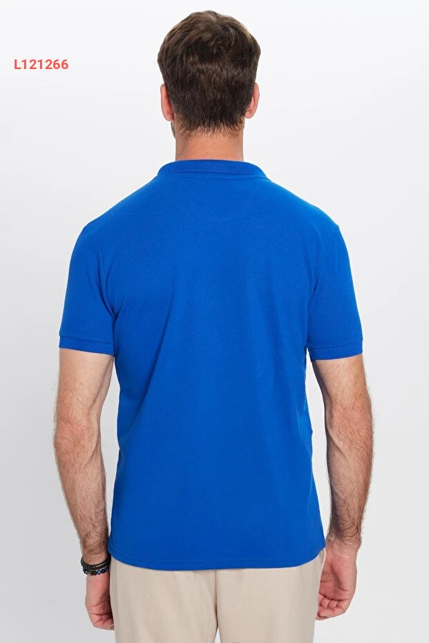 Tudors Erkek Slim Fit Dar Kesim Pamuklu Yumuşak Dokulu Serin Tutan Kumaş Düz Saks Mavi Polo Yaka Tişört