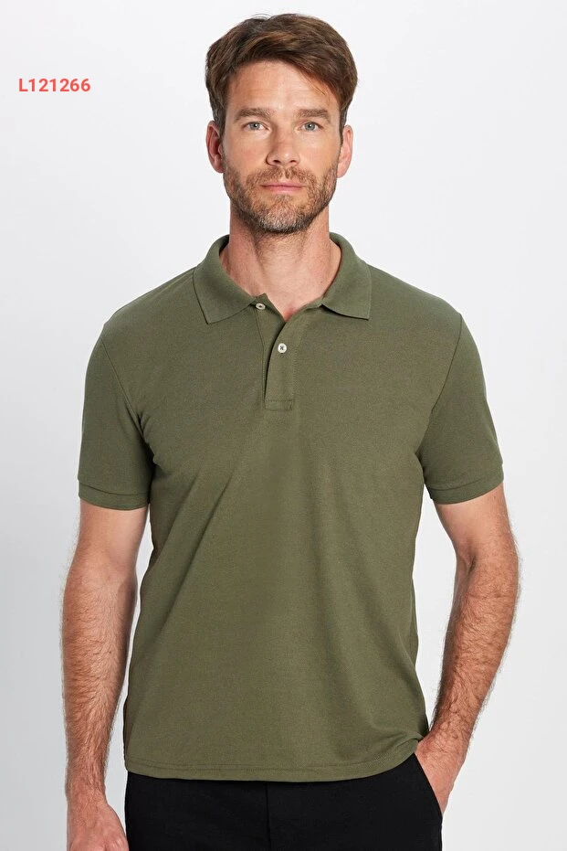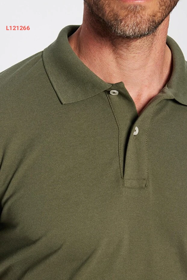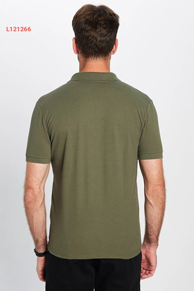 تيشيرت بولو بتصميم ضيق من القطن الناعم، نسيج مريح وقابل للتنفس - لون كاكي