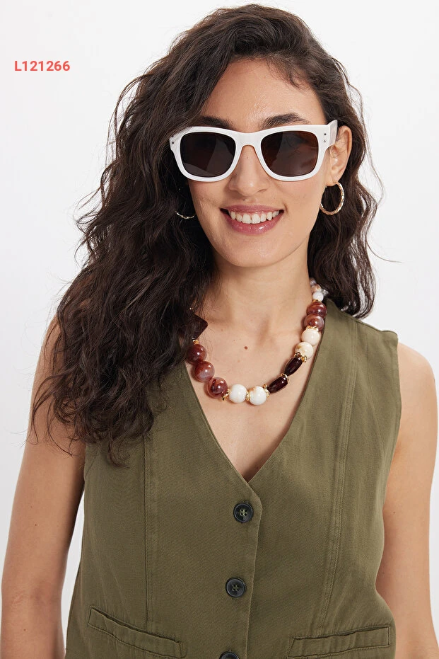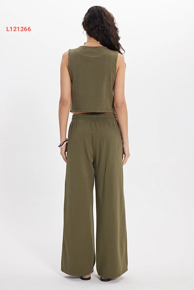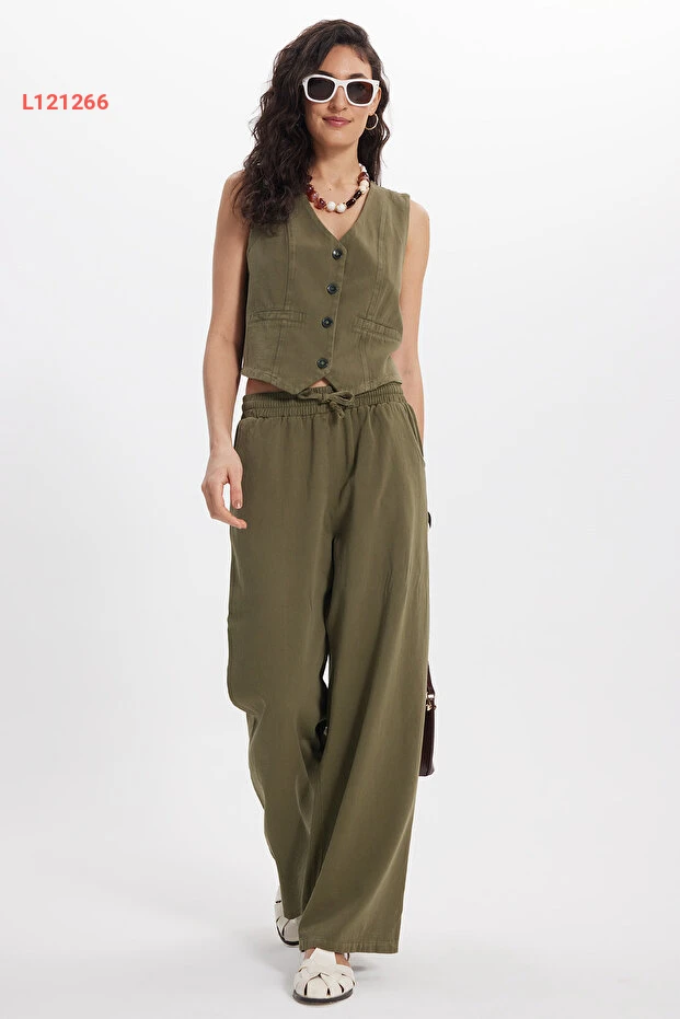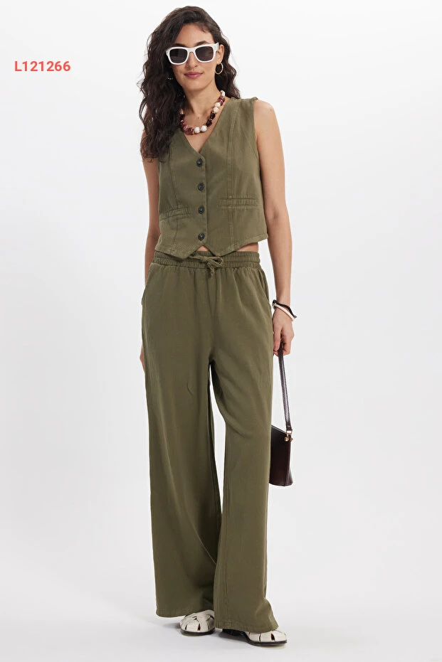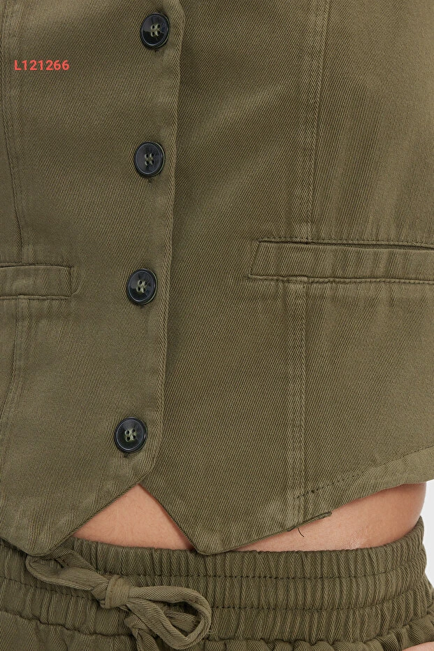 طقم يلو العصرية للسيدات بقصة نحيفة من القماش القطني 100% مع ياقة على شكل V وجيوب مزدوجة باللون الزيتي
