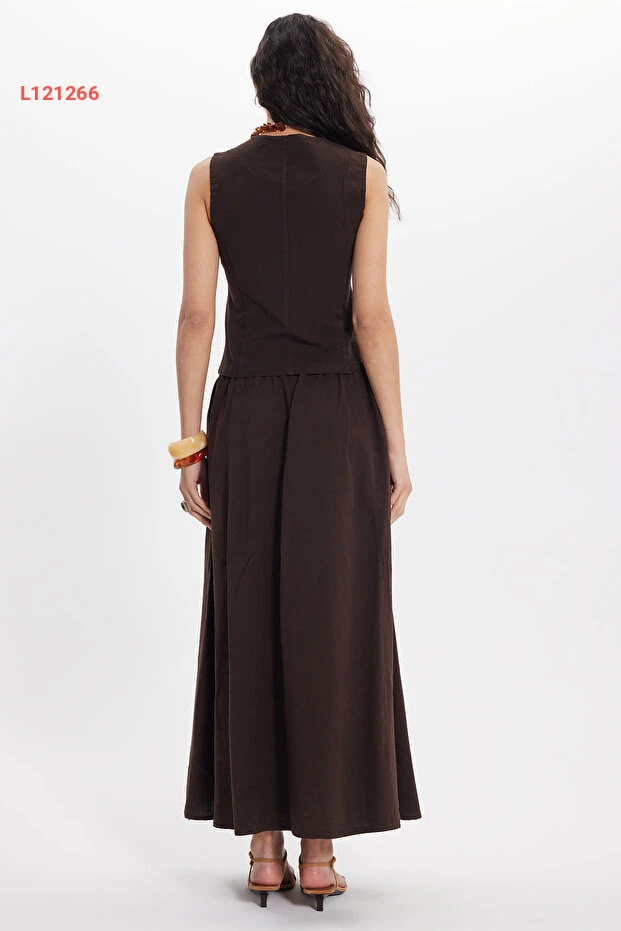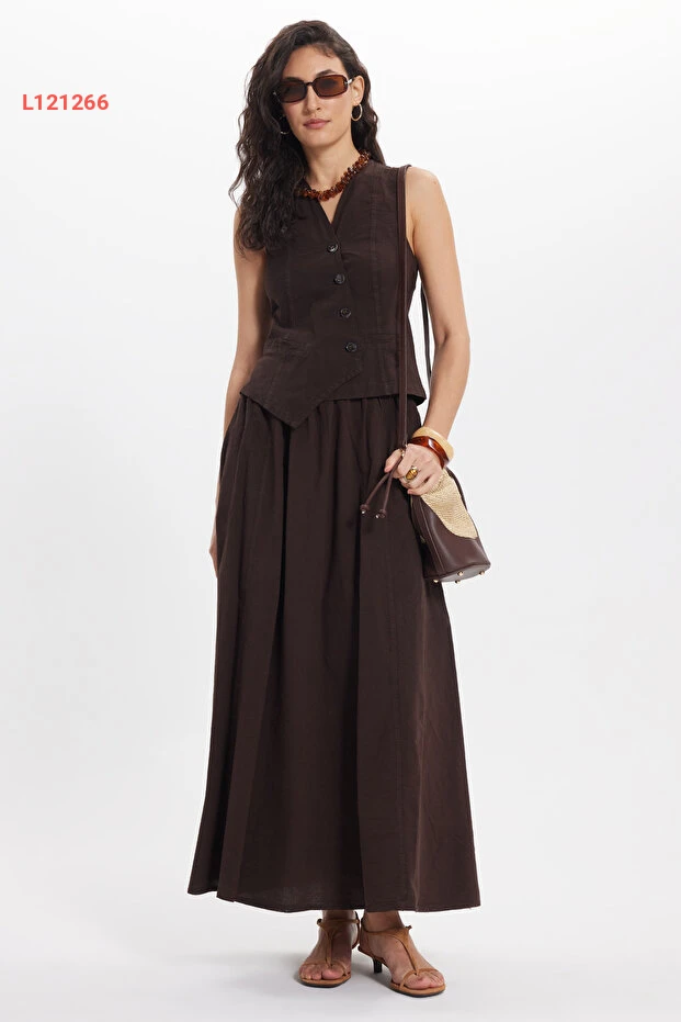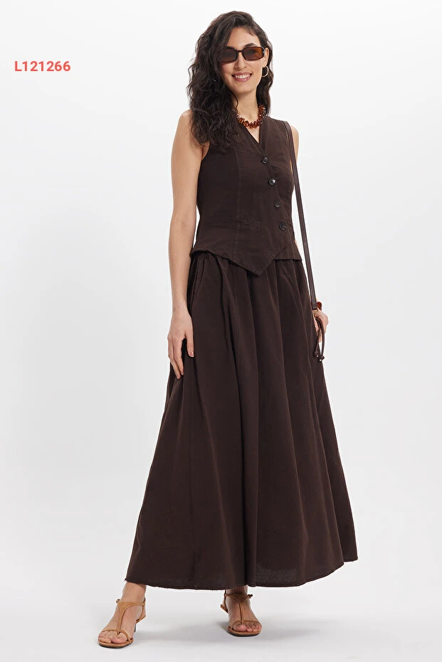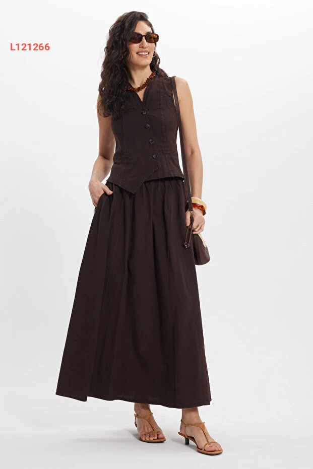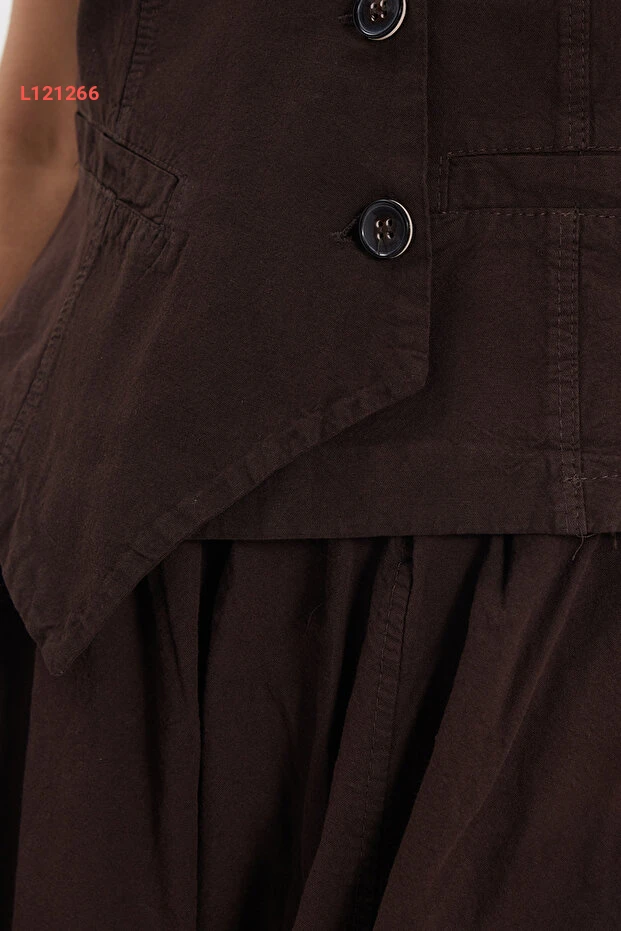 تودورز طقم تنورة صدرية بفتحة V بجيوب مزدوجة - بني، 100% قطن، قصة ضيقة