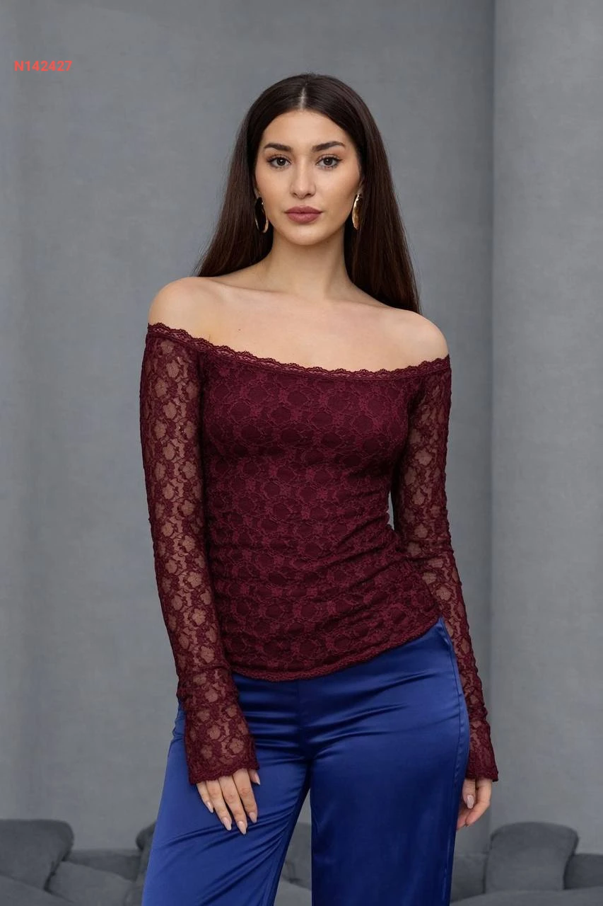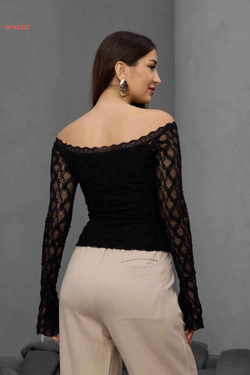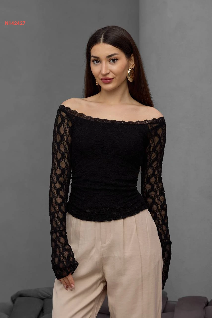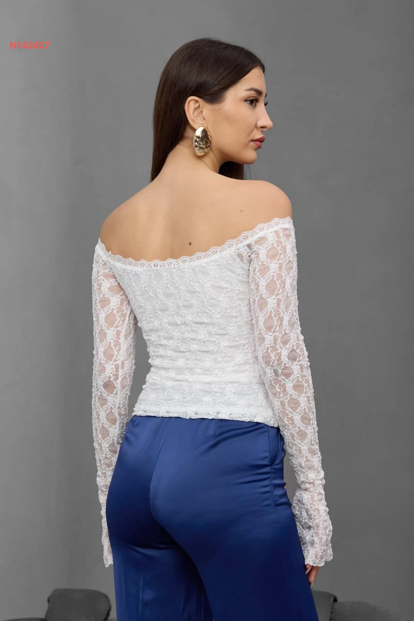 بلوزة تول بأكمام شفافة وياقة مادونا