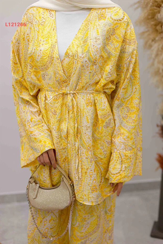 استمتعي بأناقتك مع مجموعة الكيمونو بتصميمها العصري والمريح، TSD250265 باللون الأصفر الجميل. يتميز هذا الطقم بربطة الخصر القابلة للتعديل التي تضيف لمسة من الأناقة، مما يجعله مثالياً لأي مناسبة. خاماته عالية الجودة تضمن لك الراحة طوال اليوم وتحافظ على إطلالتك العصرية.