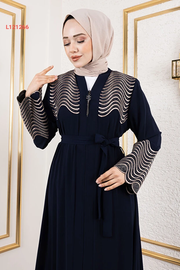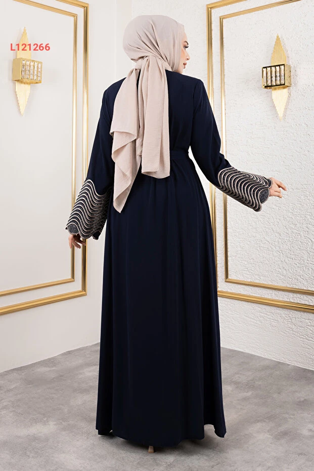 عباءة تيسيتور مع تطريز وتفاصيل أحجار لامعة - أزرق داكن