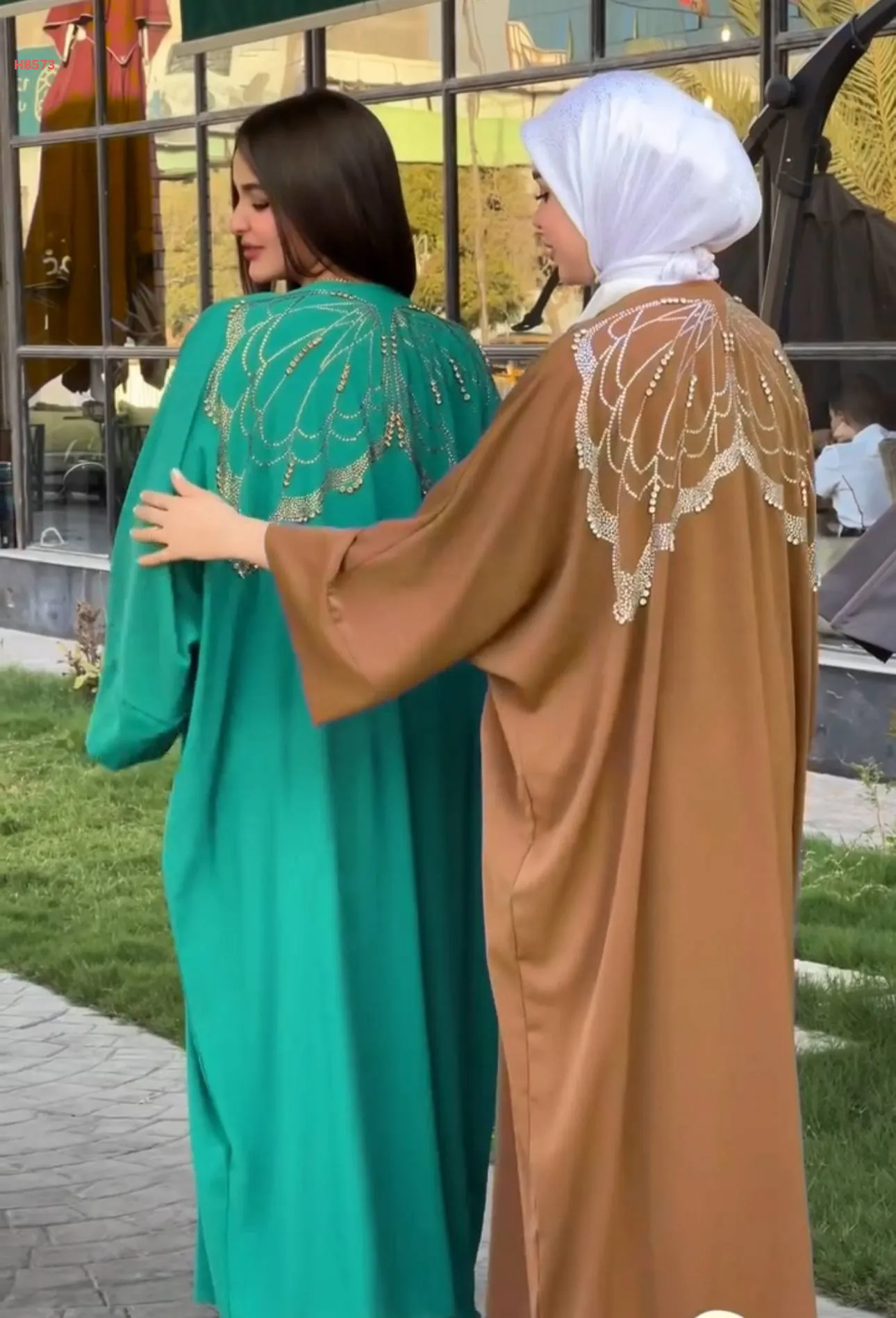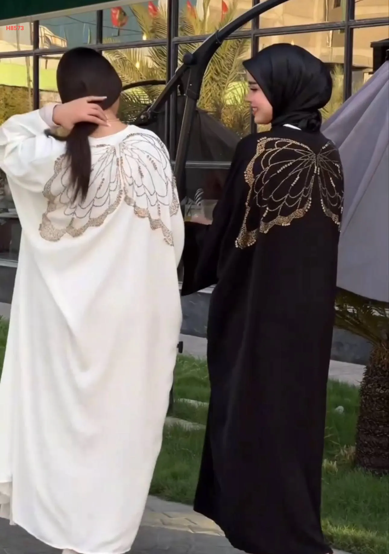 طقم عباية قطعتين ، فستان سادة ساتان ، استراس من الظهر موديل فراشة
