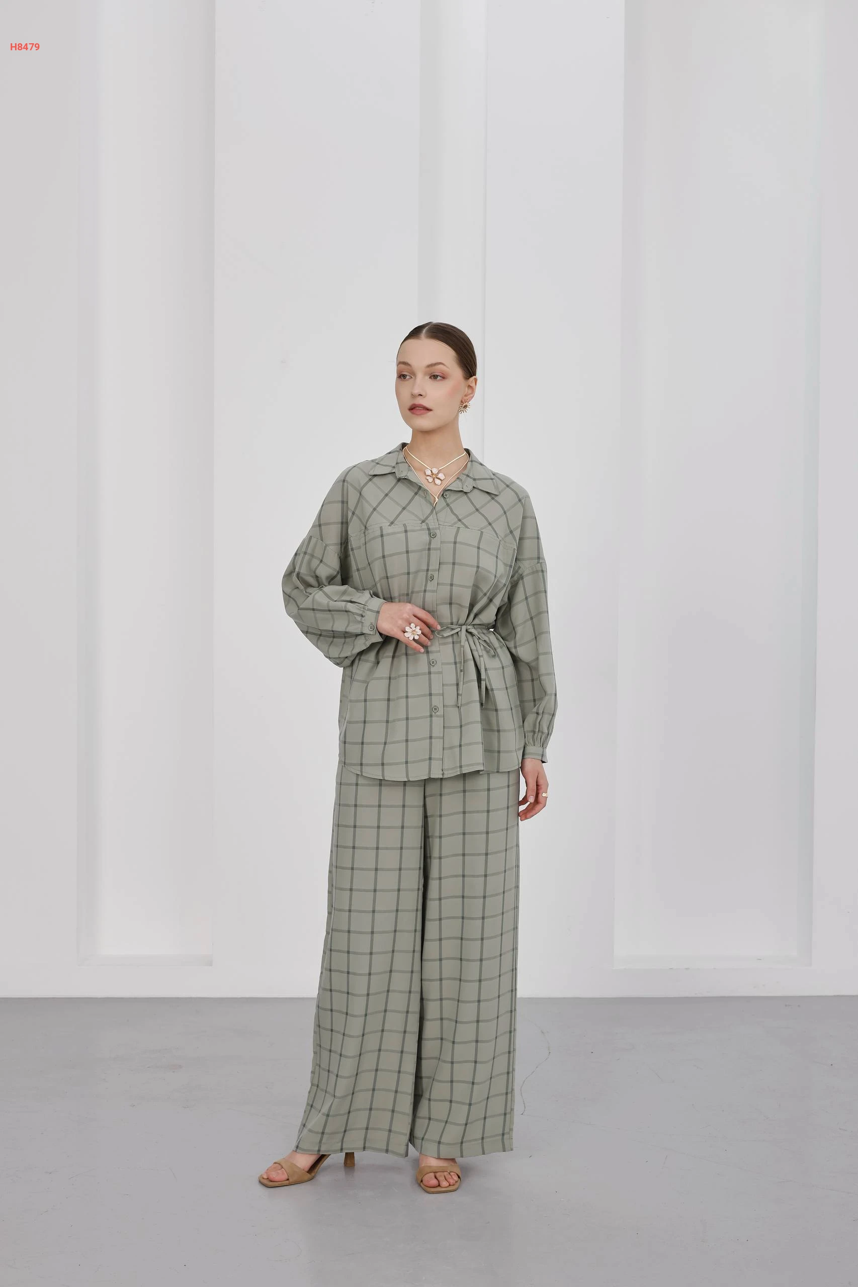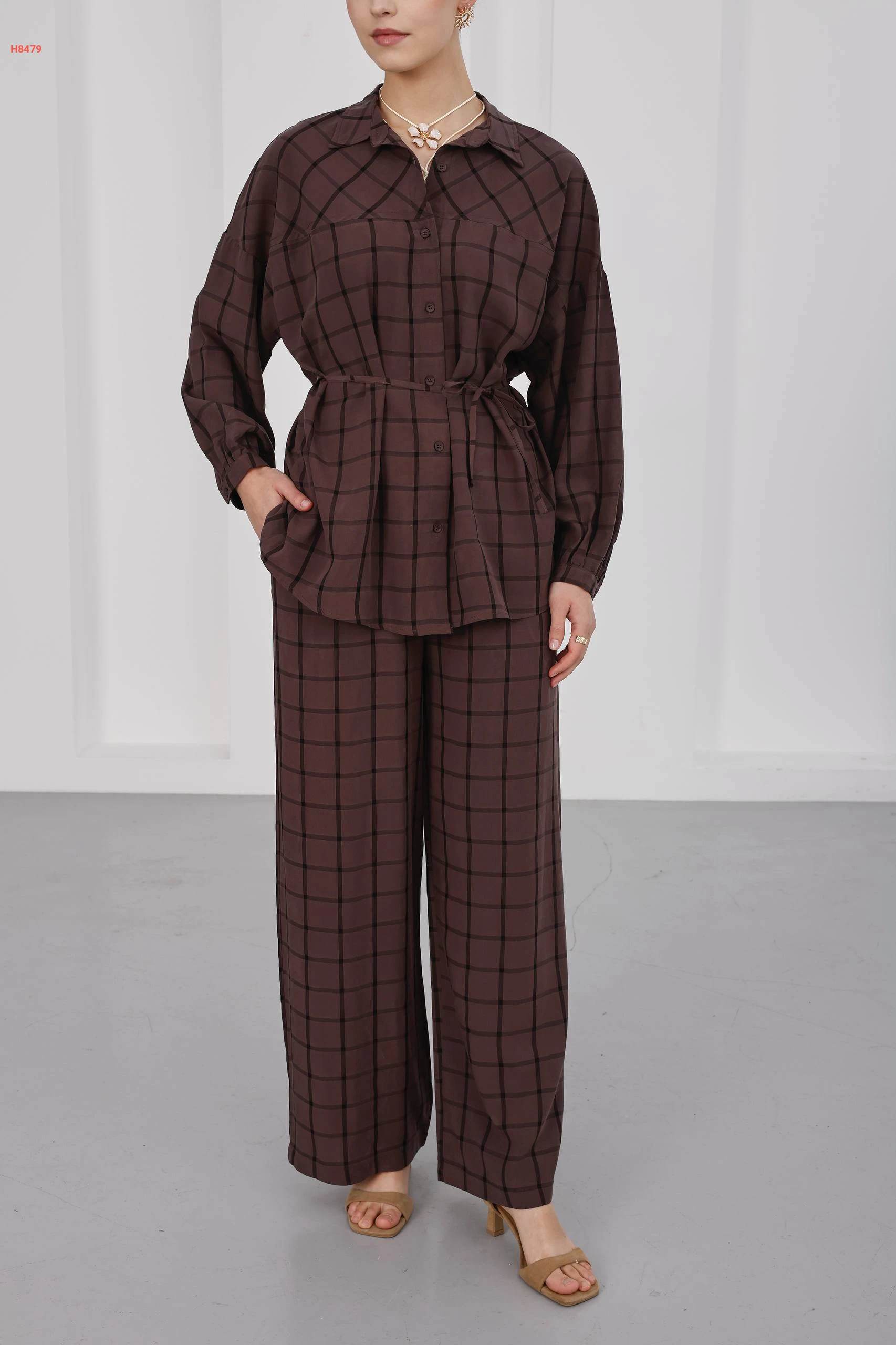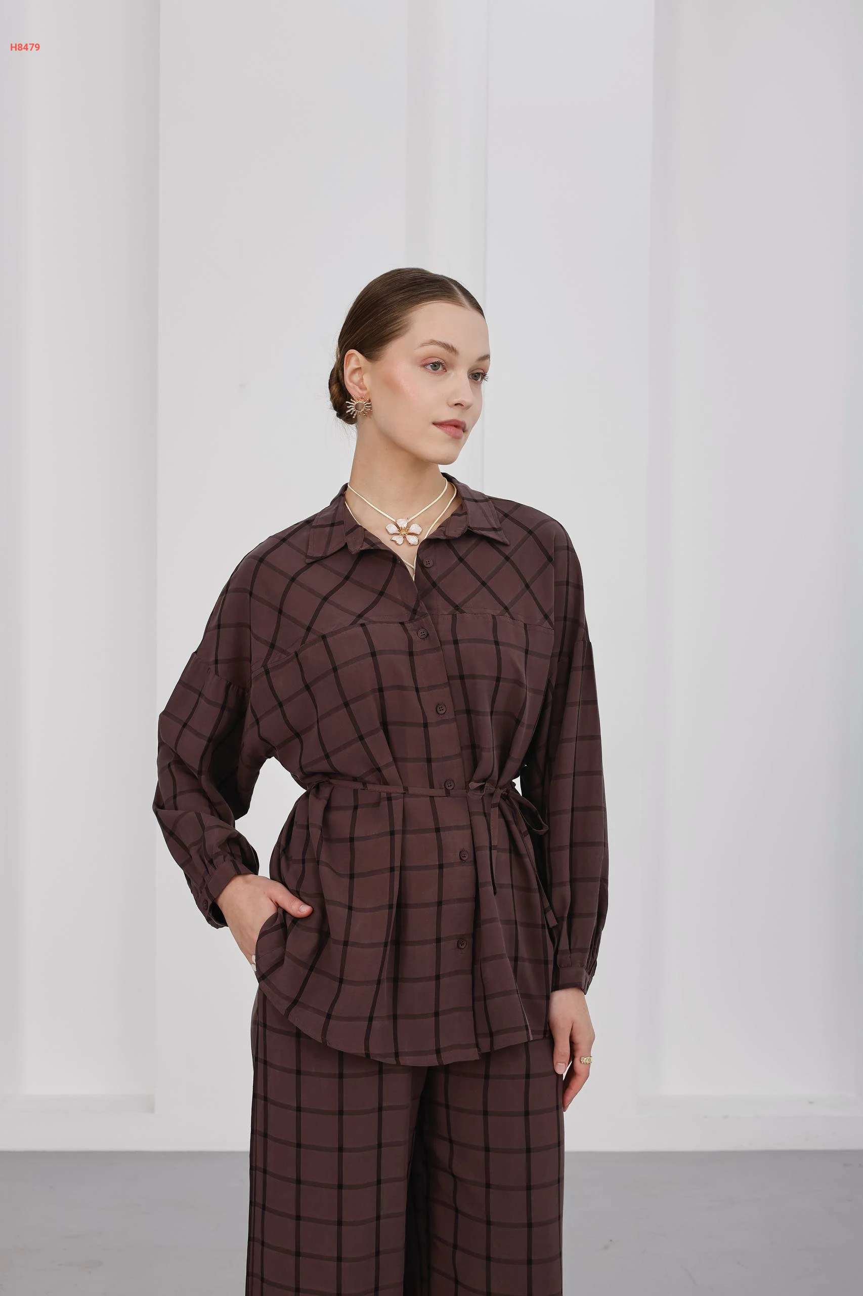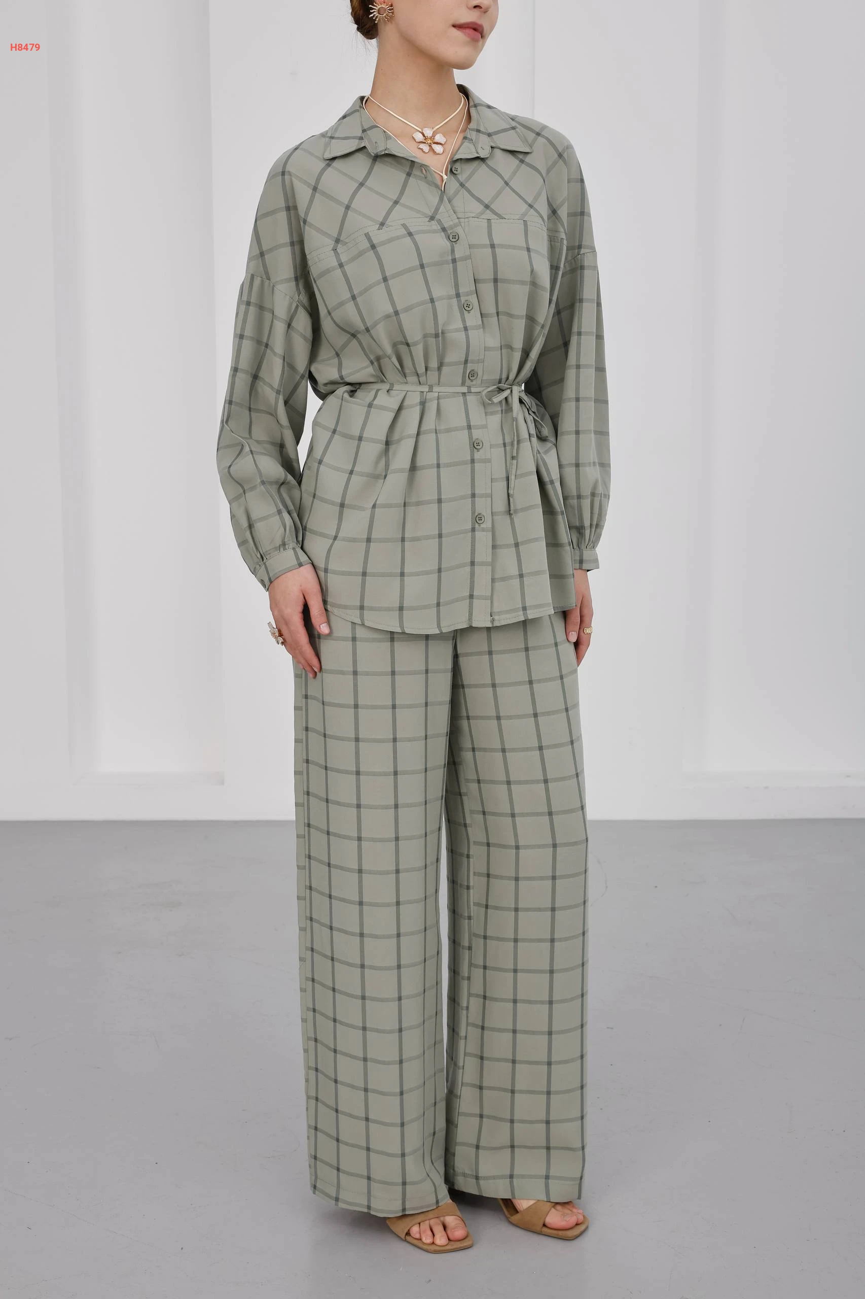 طقم بنطال قطعتين كاروهات بأزرار مع ربطة خصر