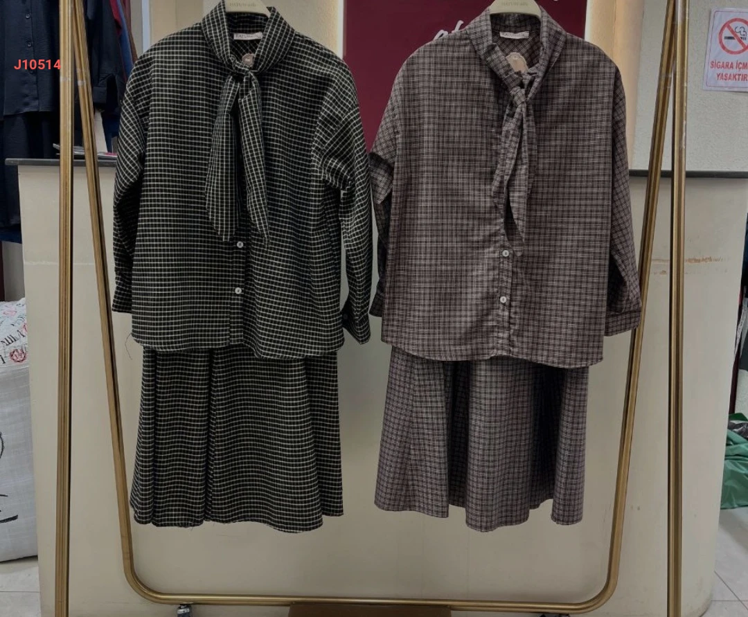 طقم تنورة كاروهات قطعتين بأزرار مع فولار