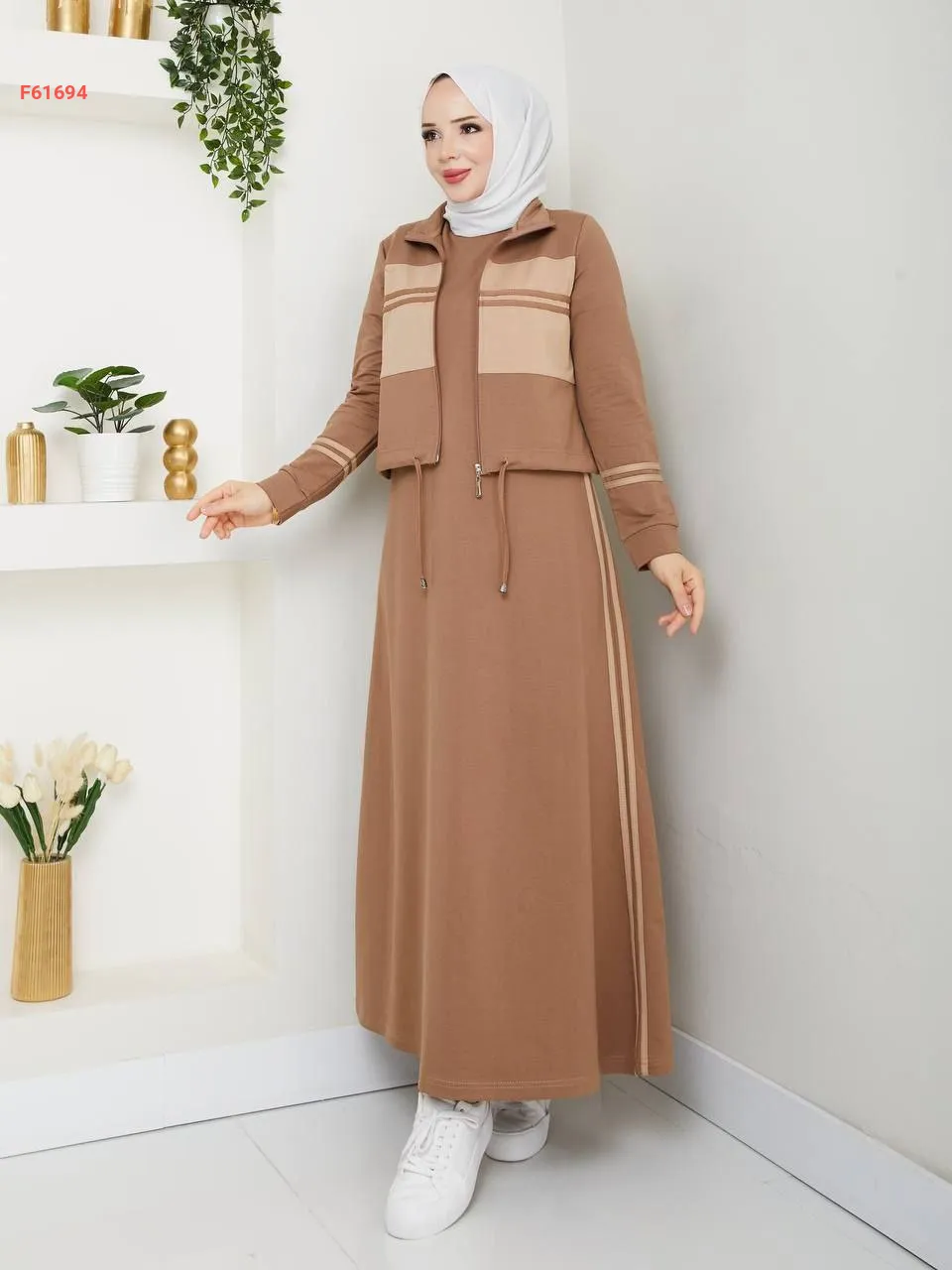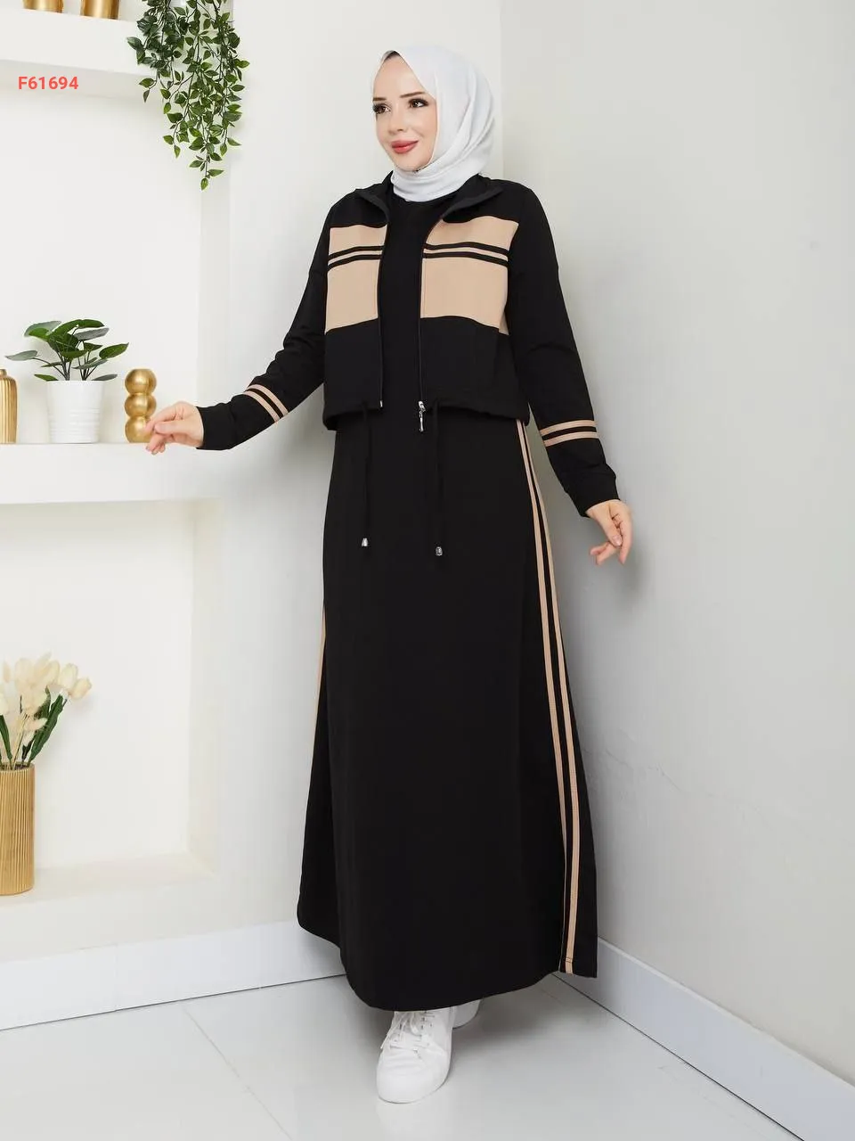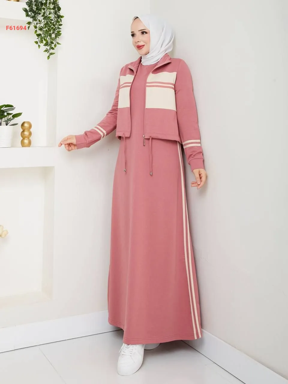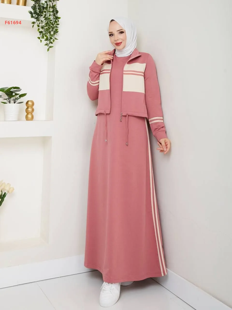 فستان قطعتين سادة مخطط من الجانب مع جاكيت بسحاب