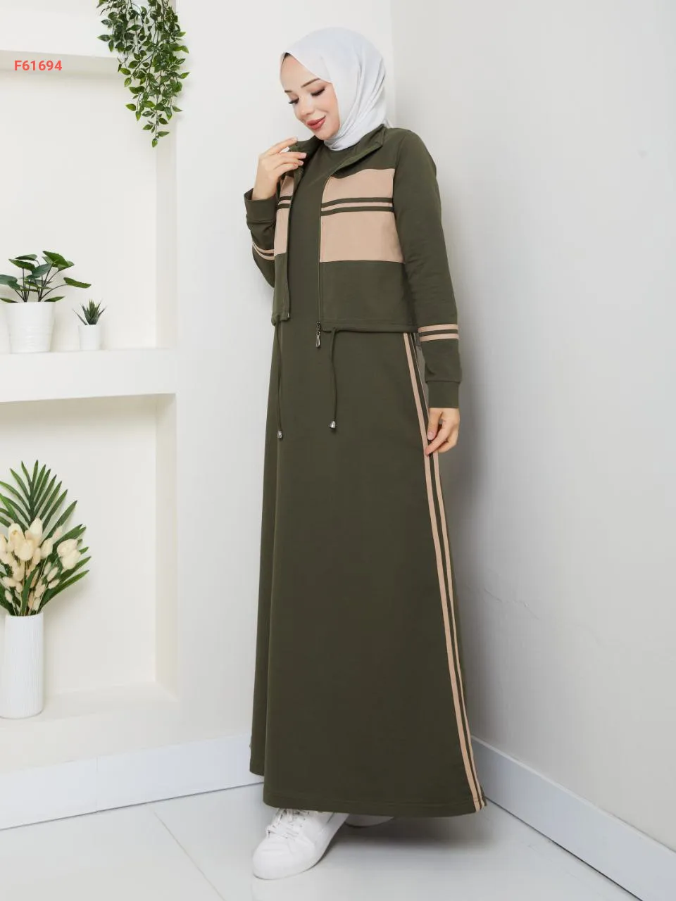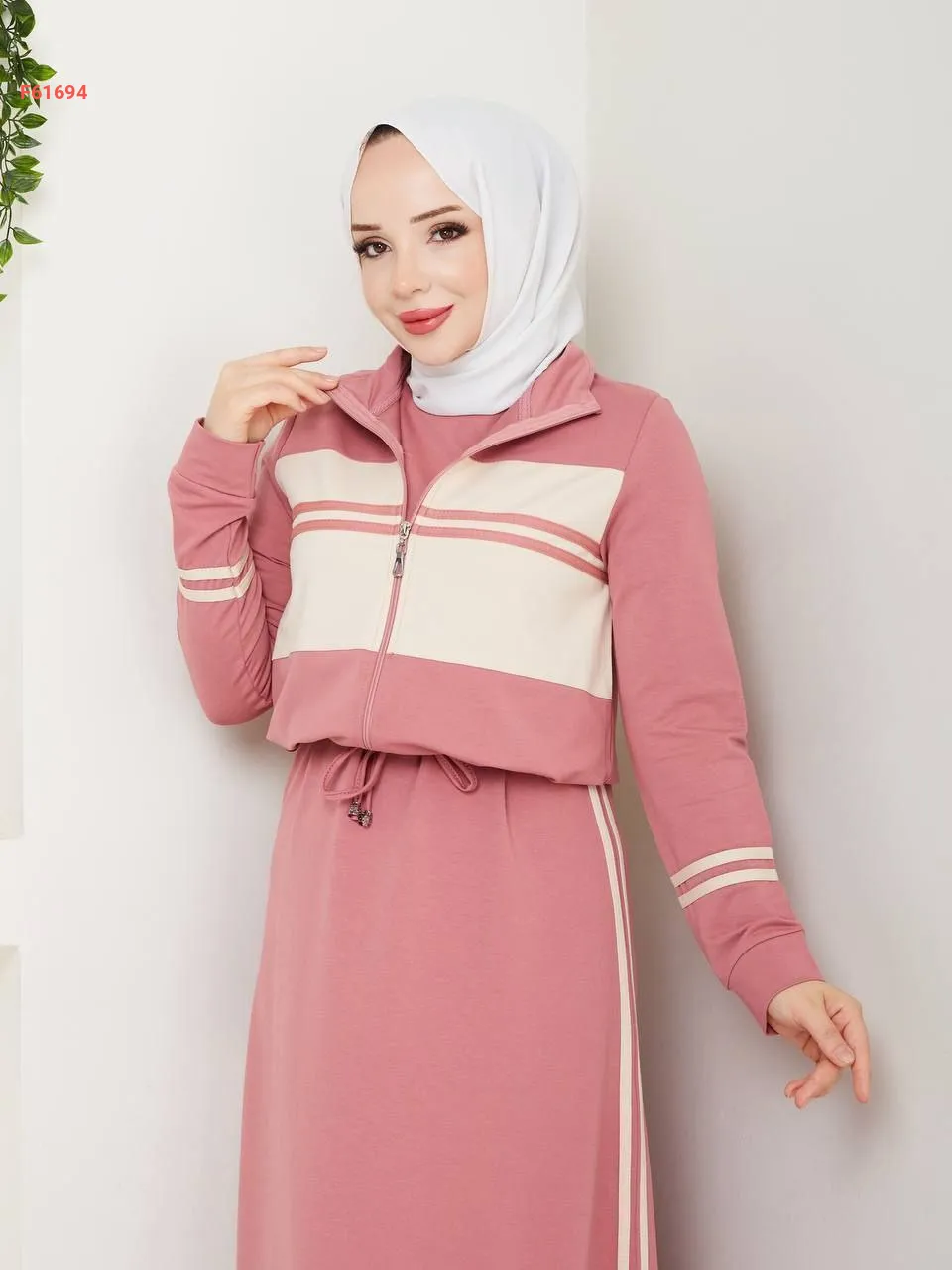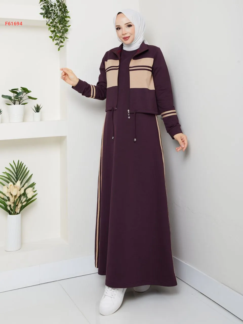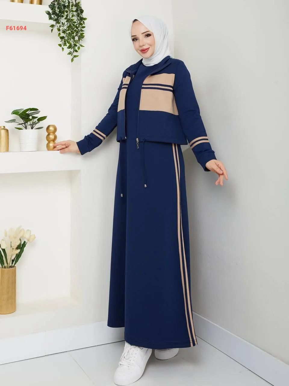فستان قطعتين سادة مخطط من الجانب مع جاكيت بسحاب