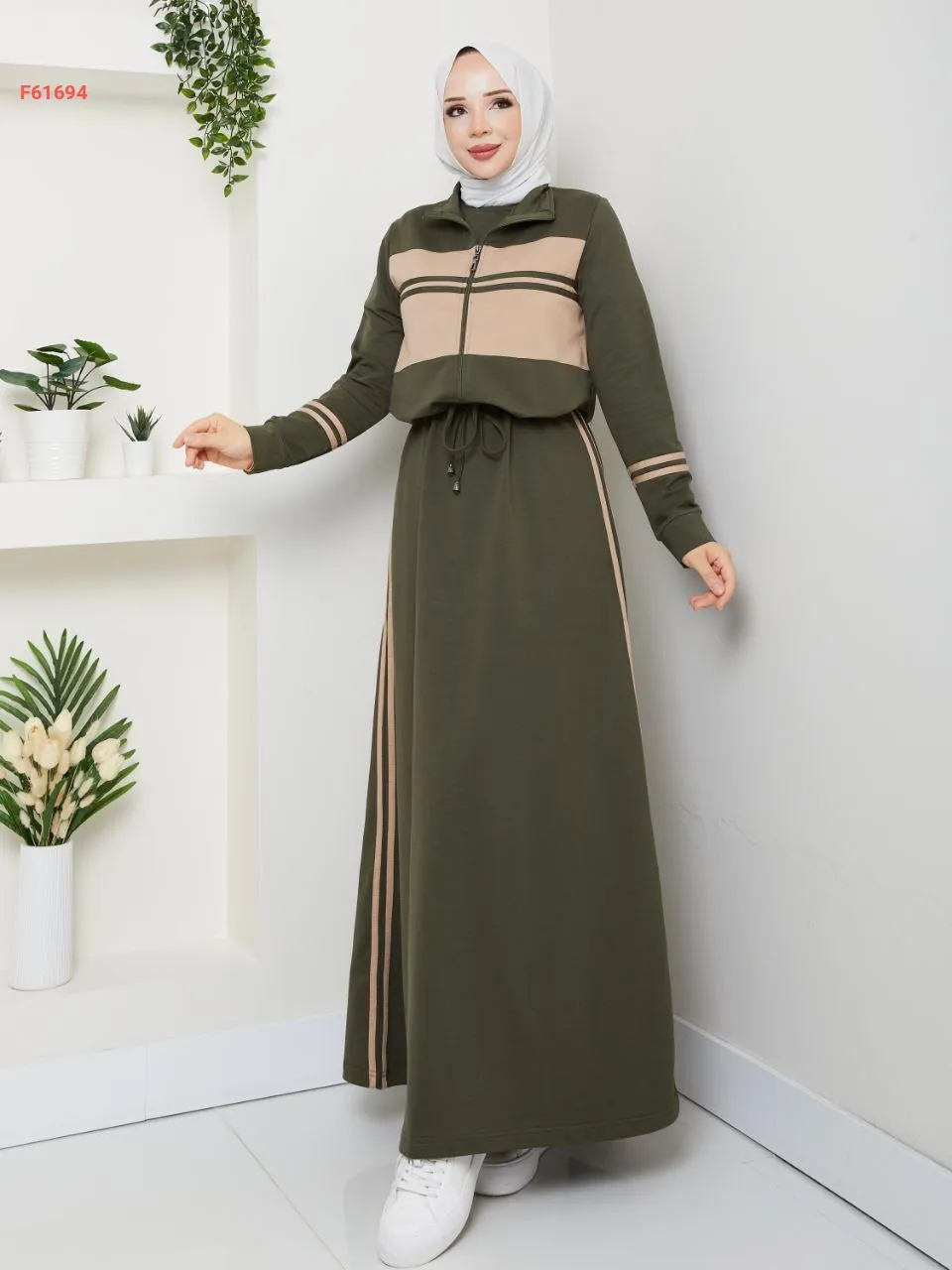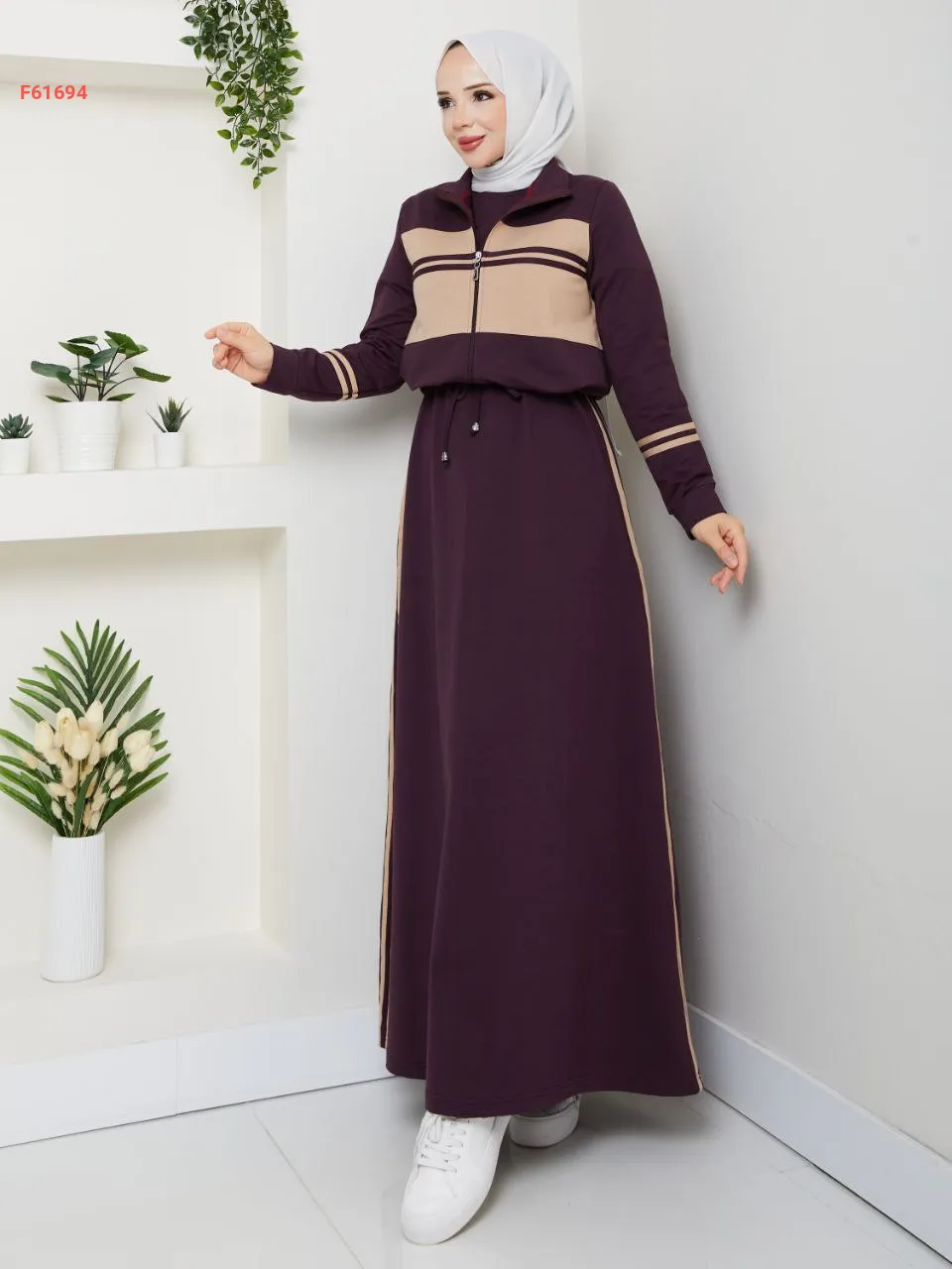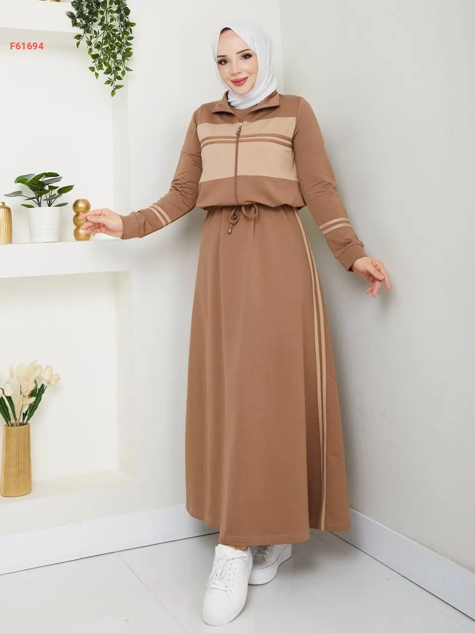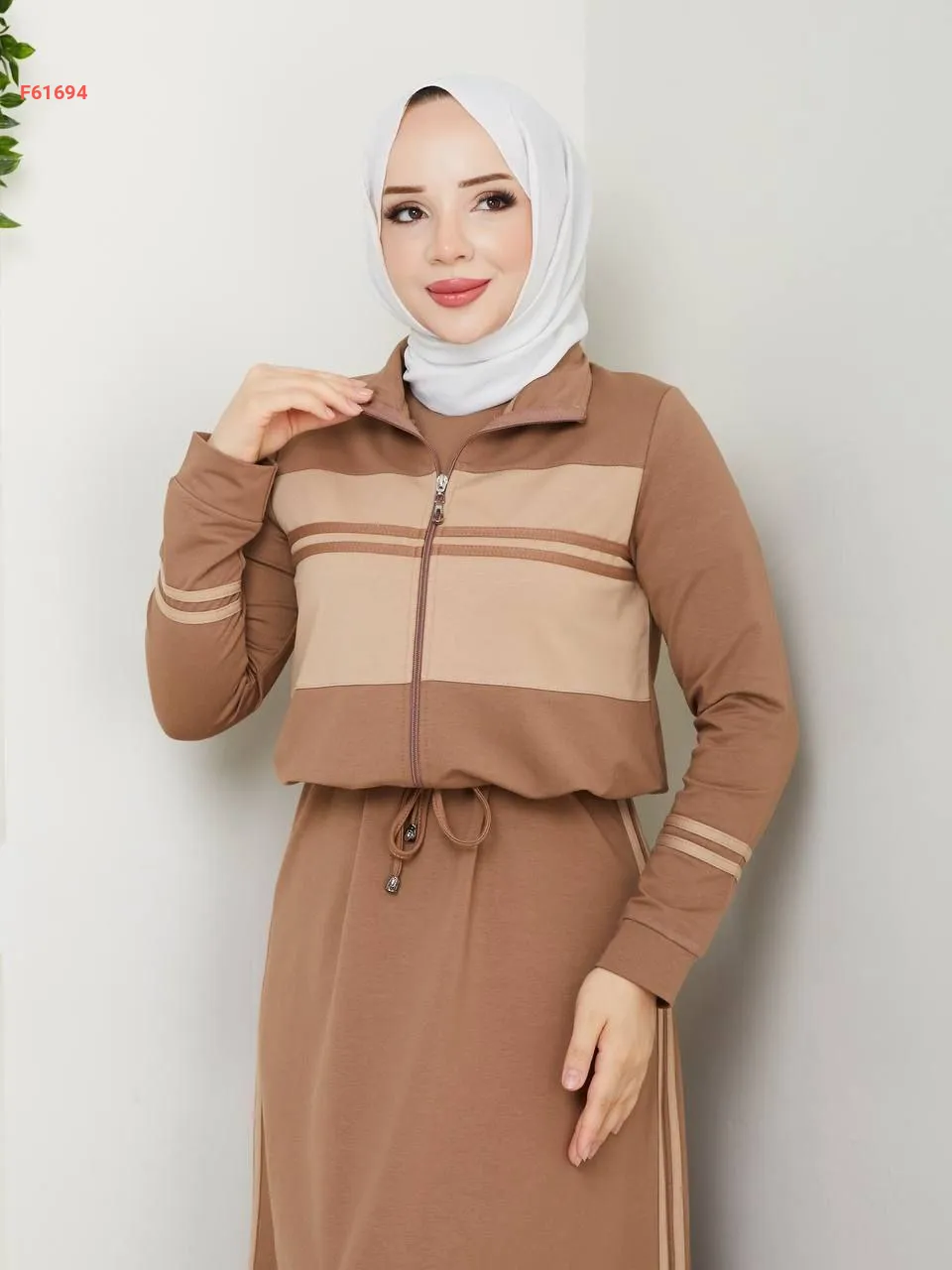 فستان قطعتين سادة مخطط من الجانب مع جاكيت بسحاب