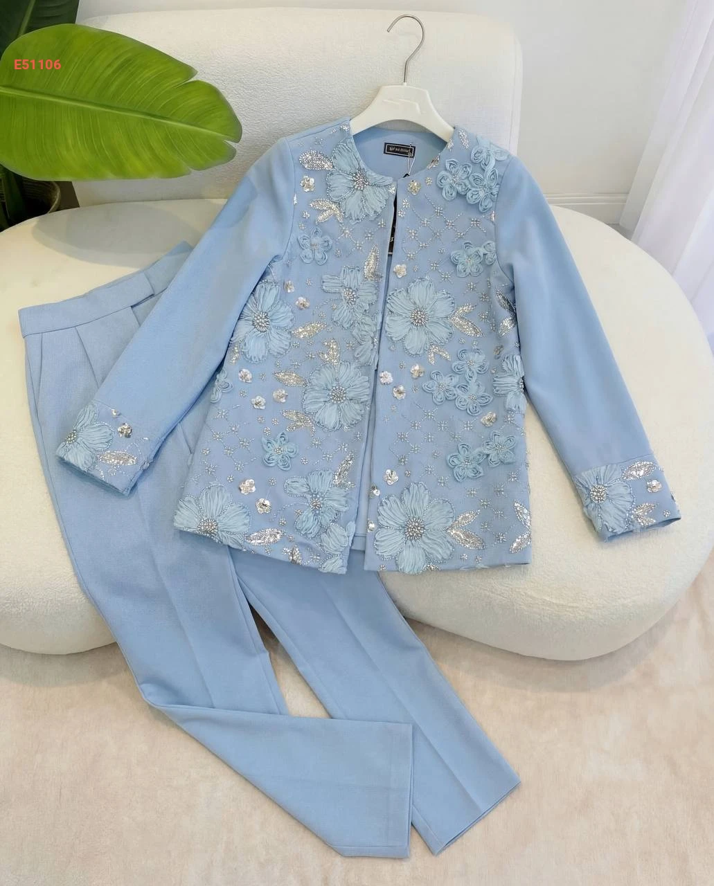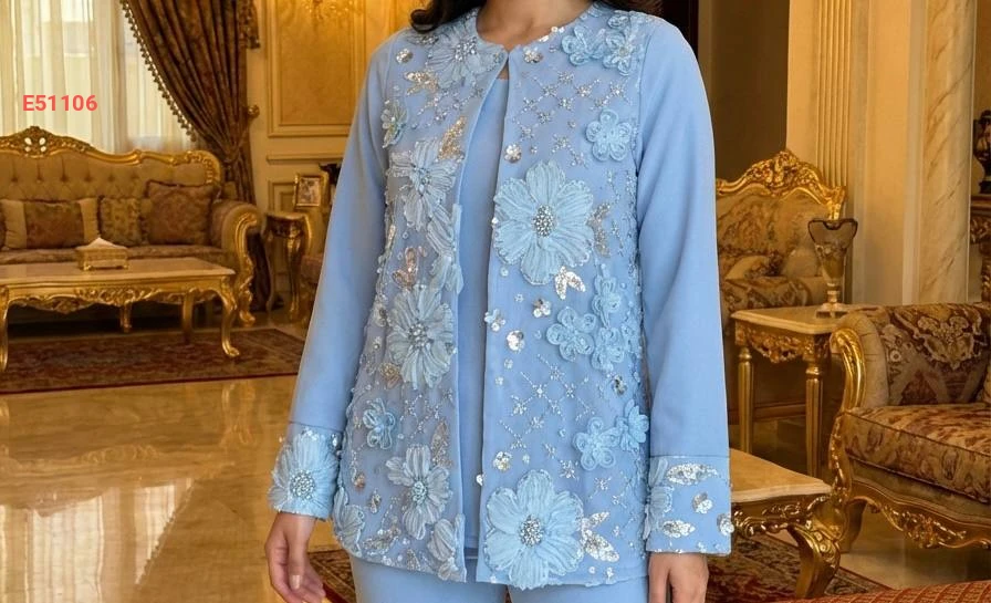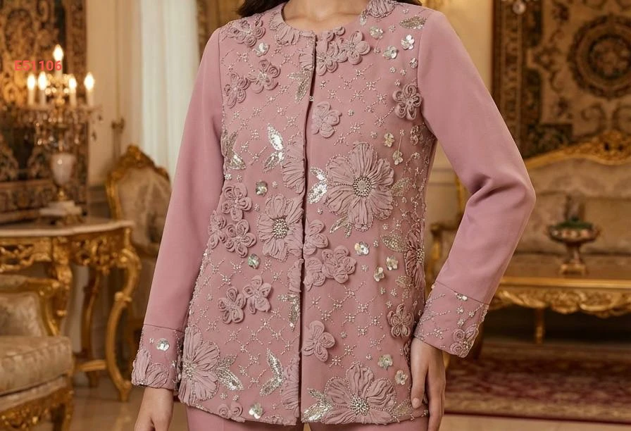 طقم سهرة قطعتين جاكيت بتطريز شك خرز بياقة دائرية مع بنطال كلاسيكي