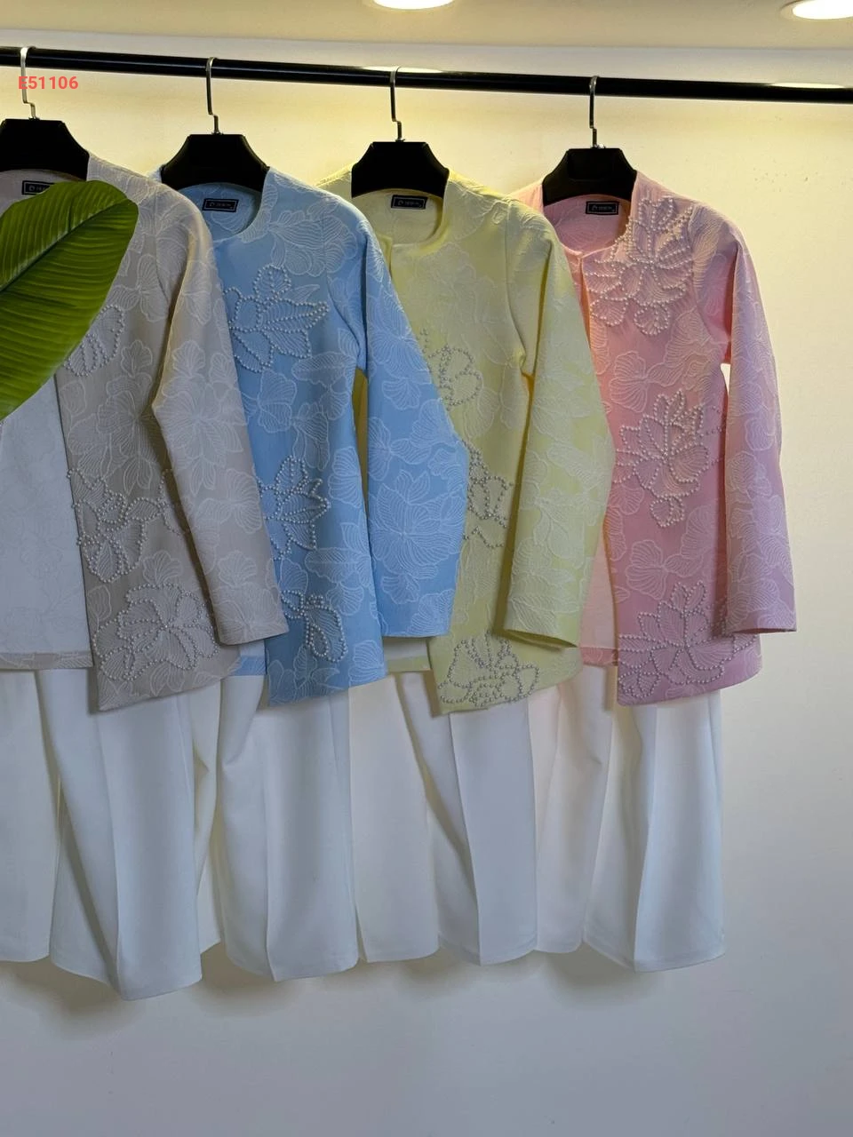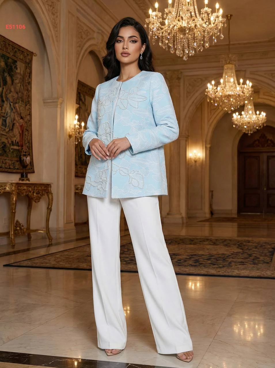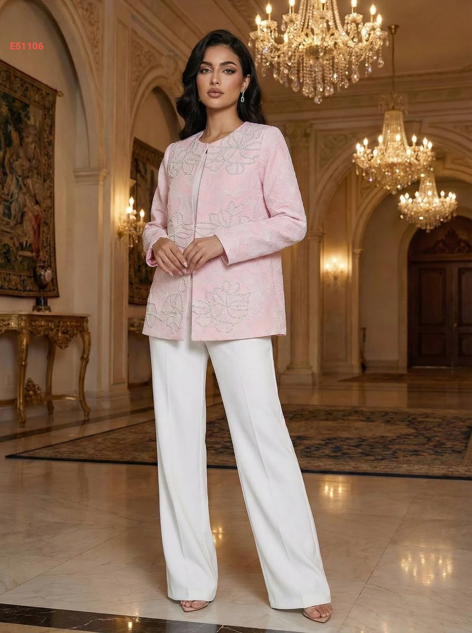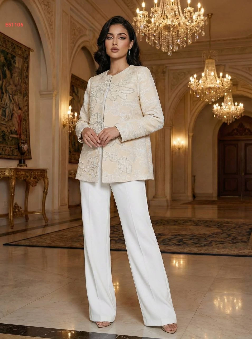 طقم سهرة قطعتين جاكيت مطرز شك لؤلؤ مع بنطال كلاسيكي