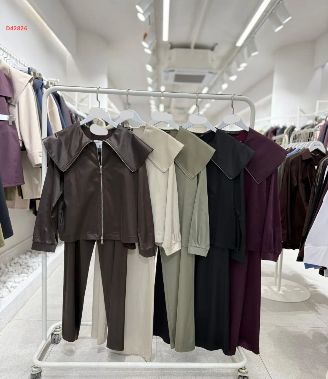 طقم قطعتين جلد بسحاب ، مع ياقة عريضة