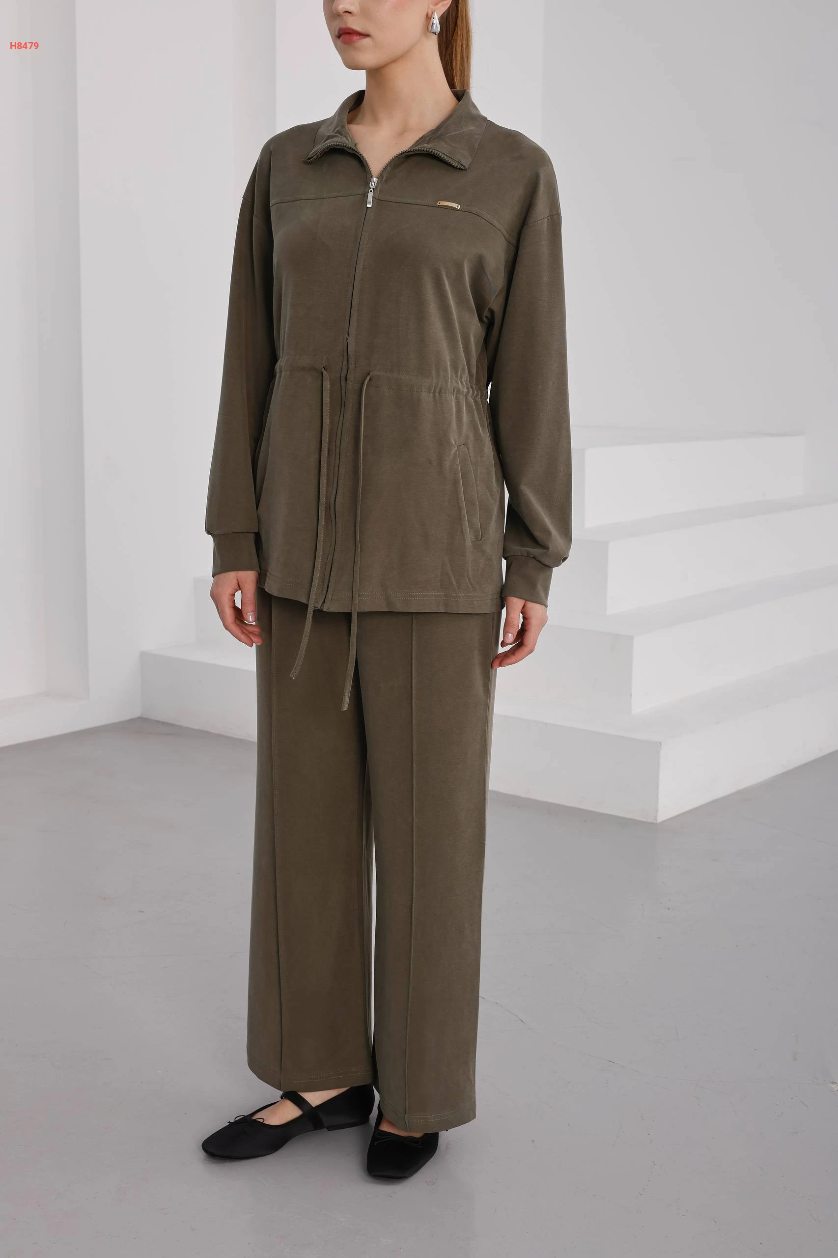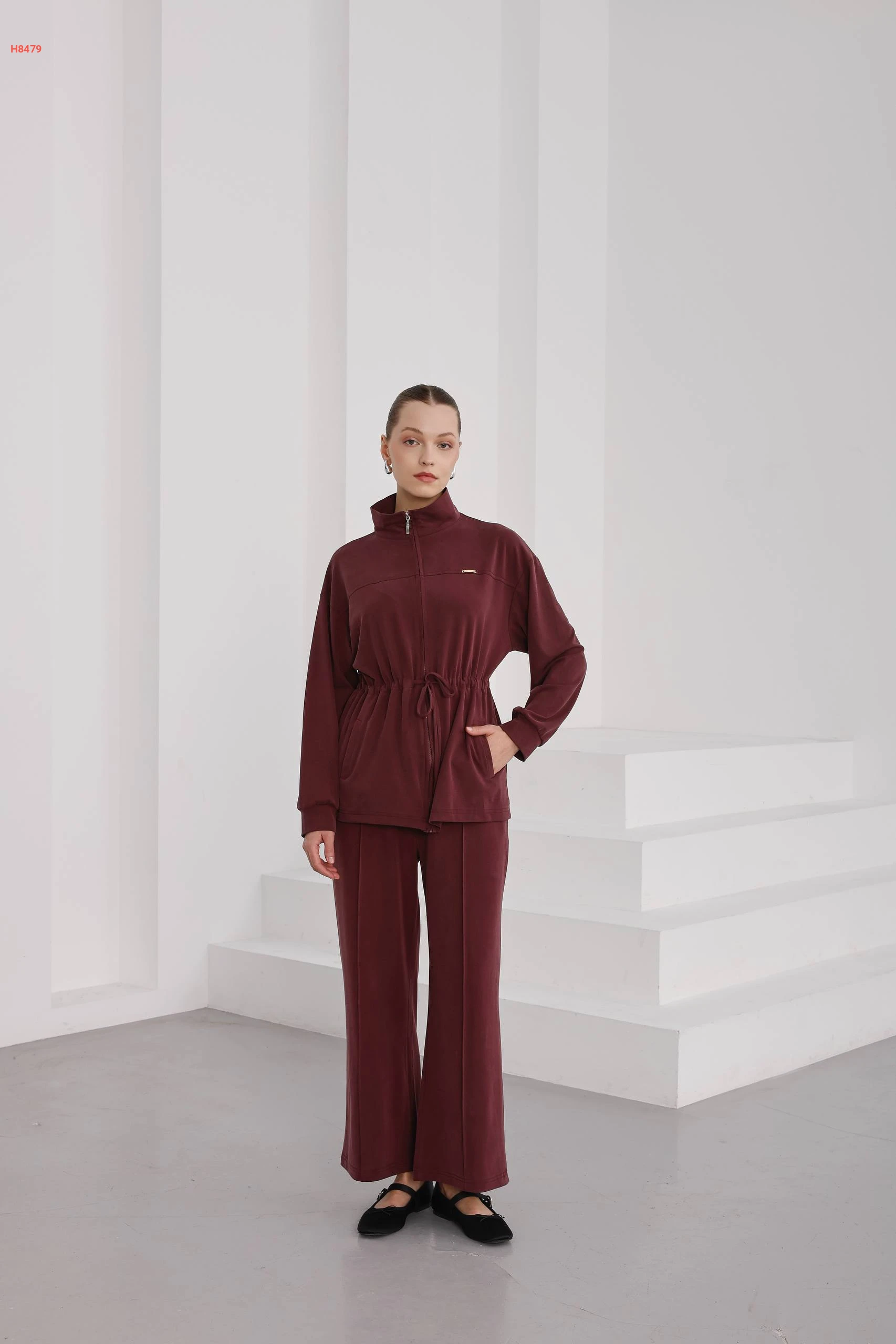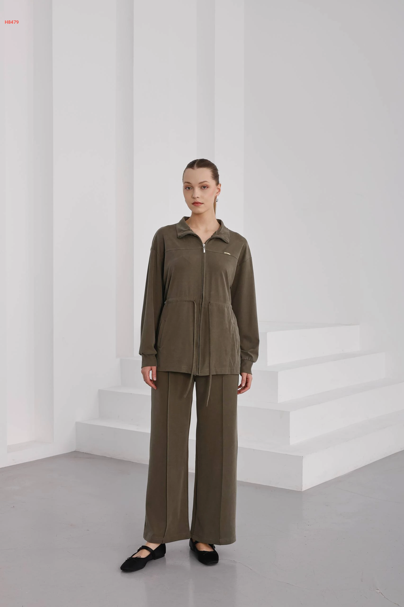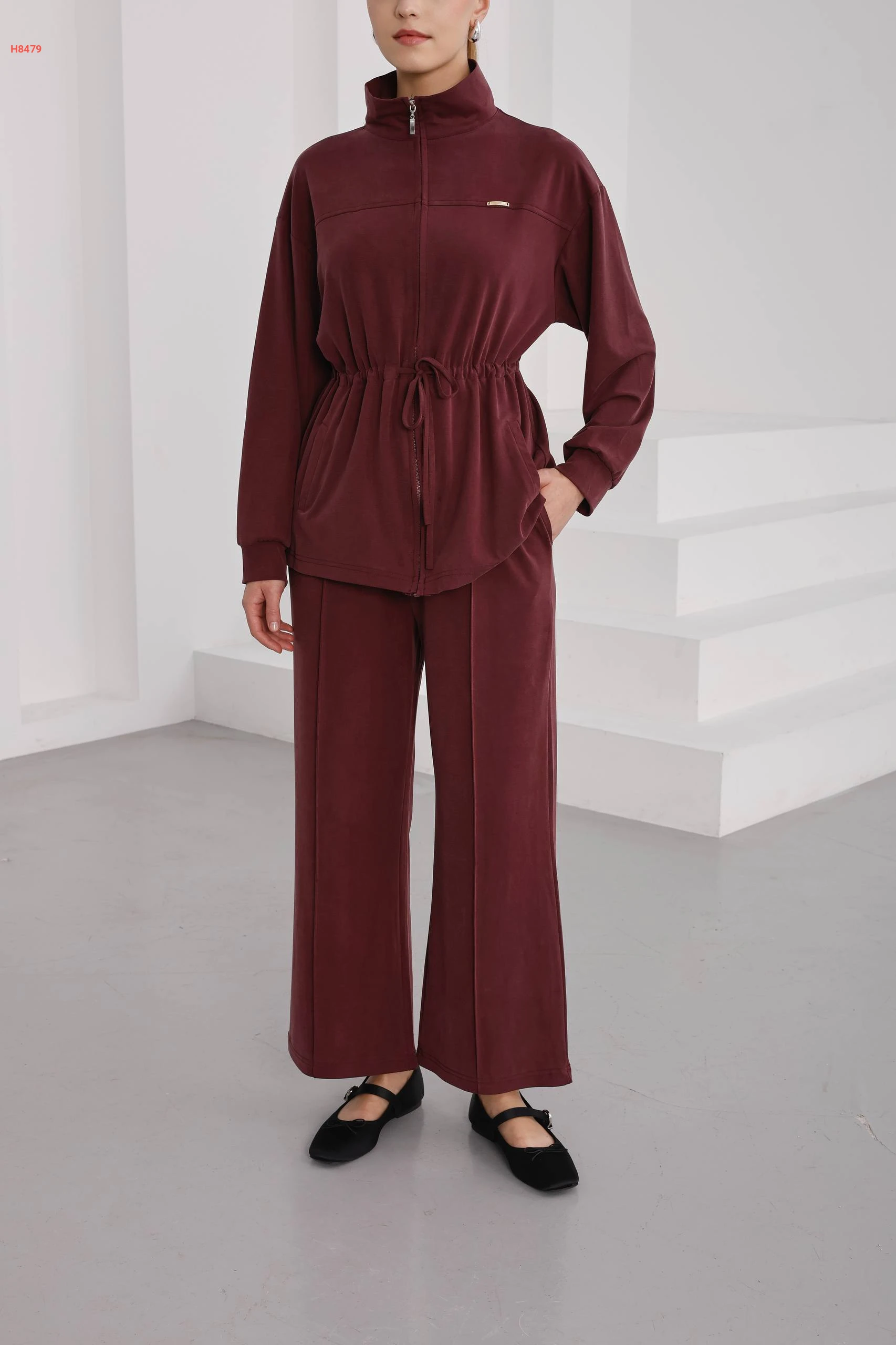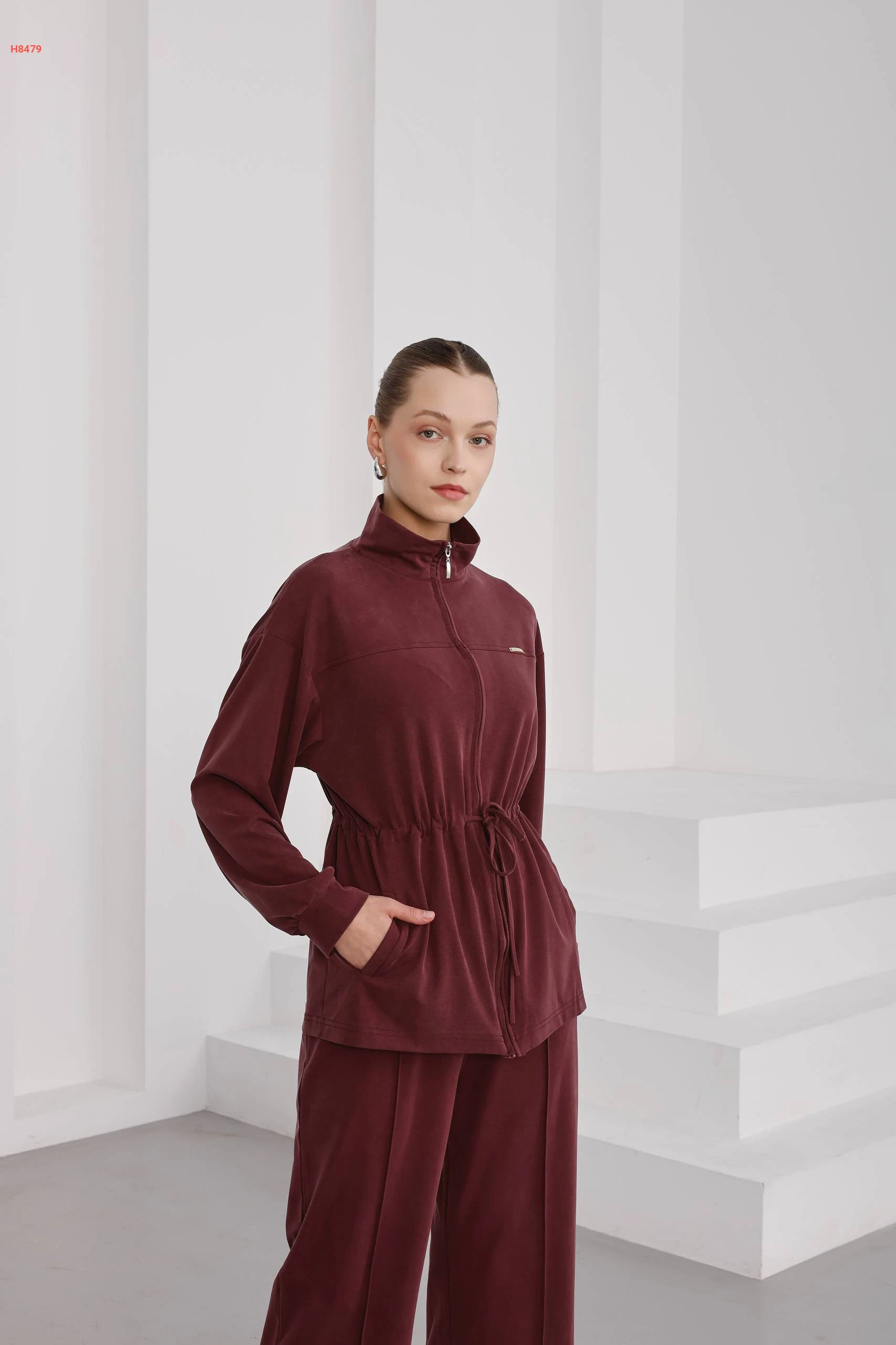 بيجامة قطعتين بسحاب سادة بياقة مرتفعة بزمة خصر وجيب