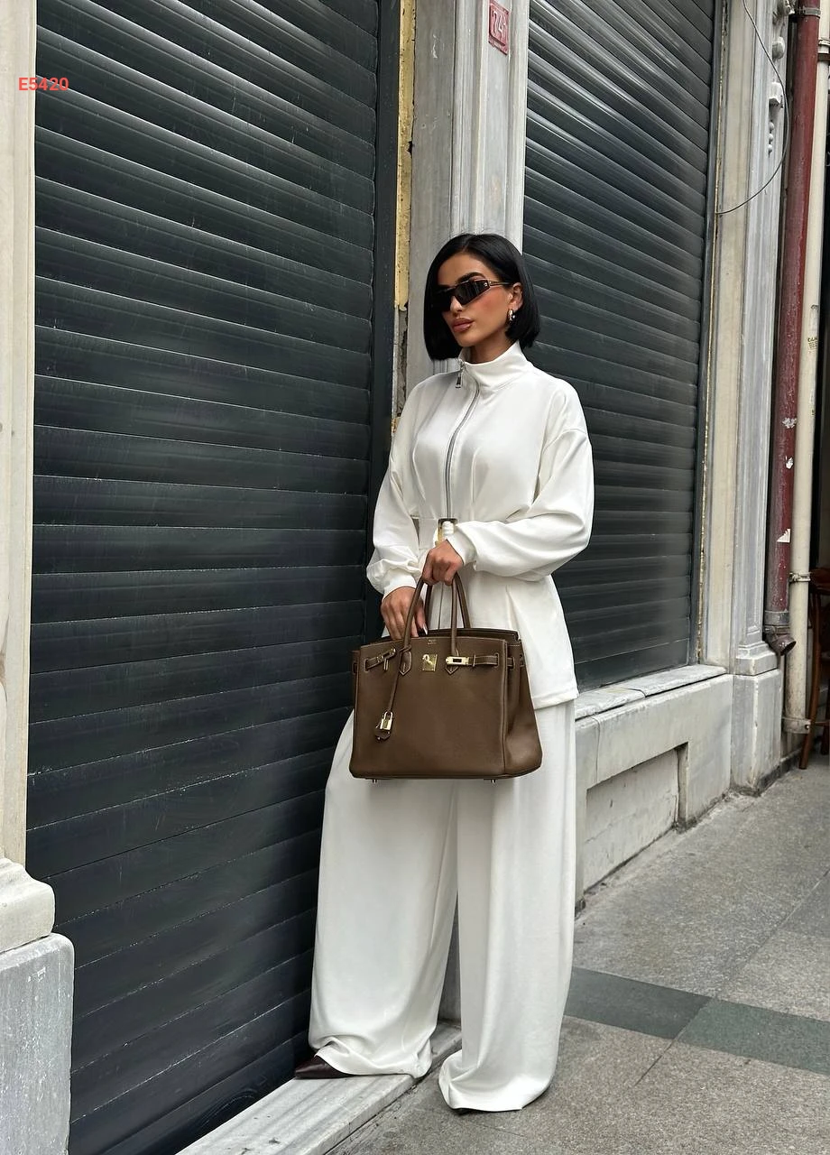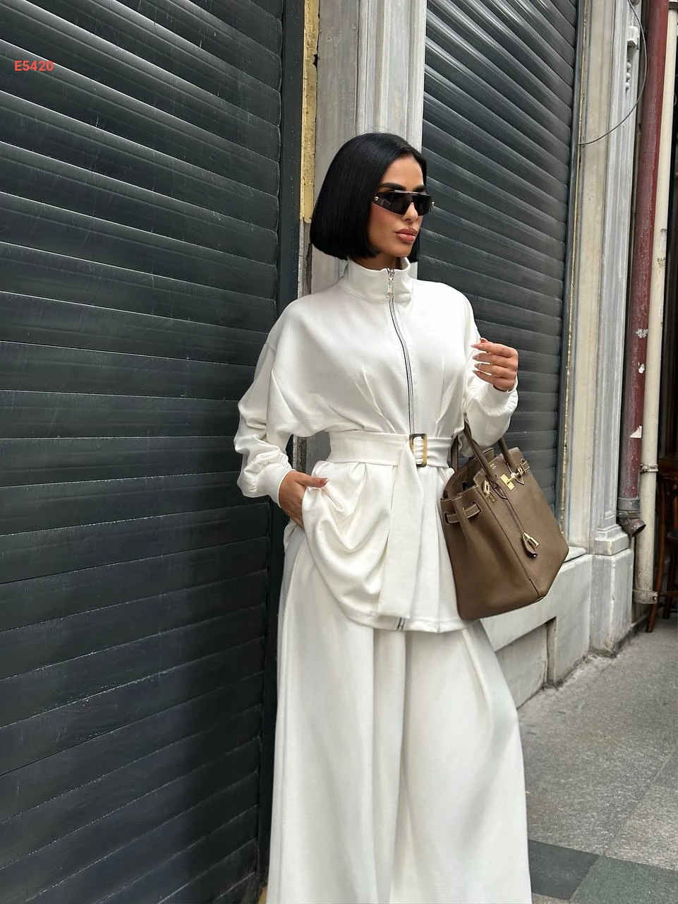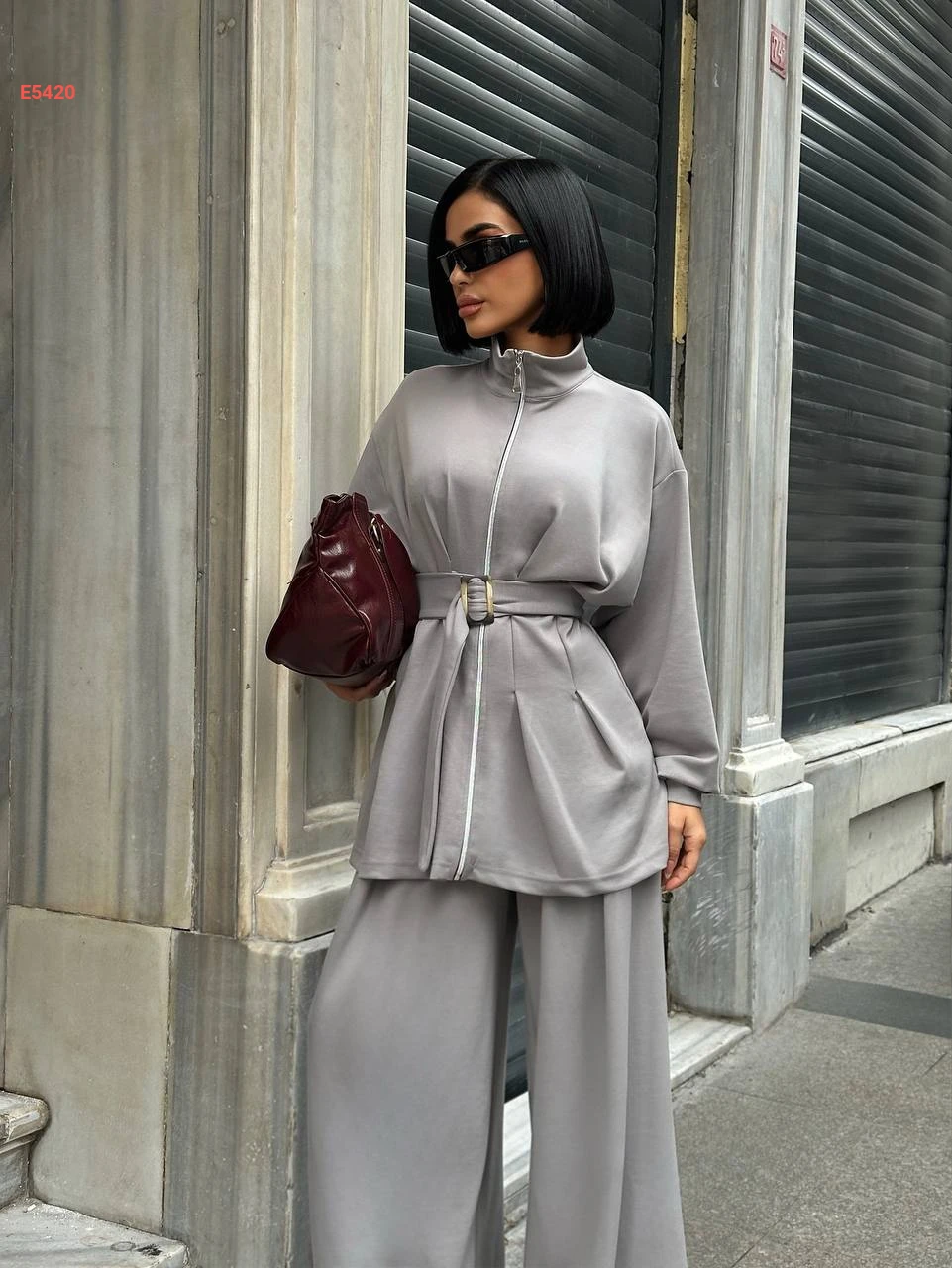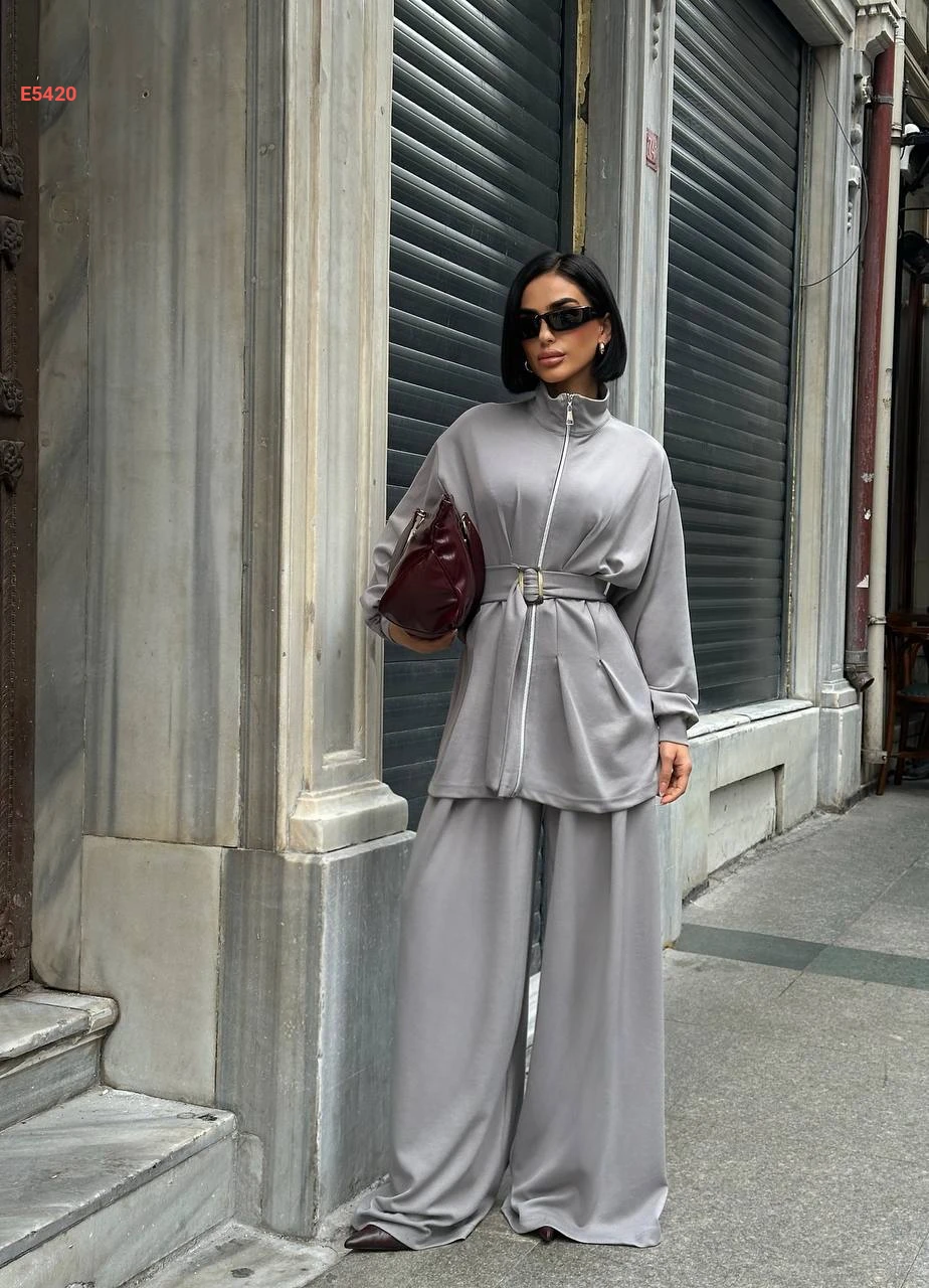 بيجامة قطعتين بسحاب مع حزام بكسرات عند الخصر