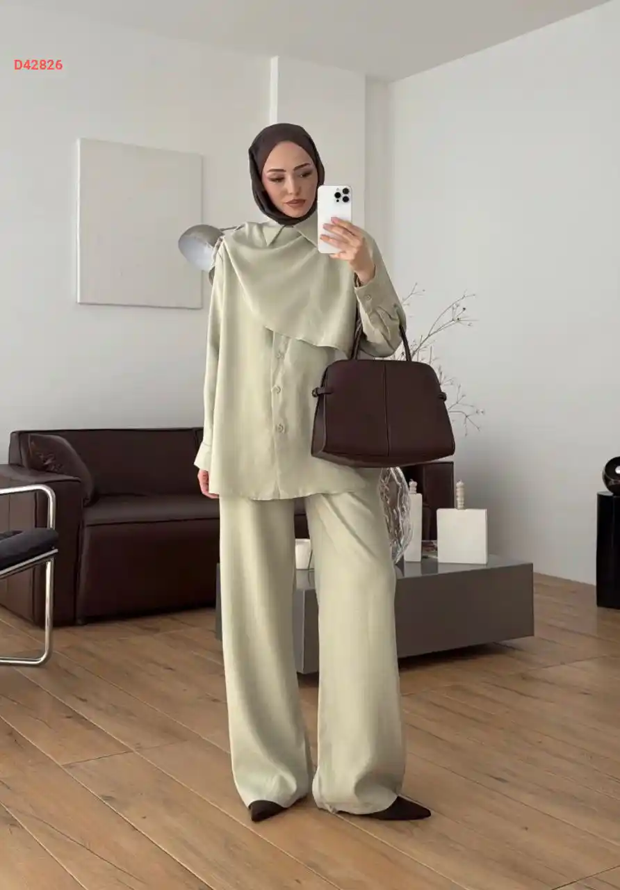 طقم بنطال قطعتين بأزرار مخفية مع فولار، مع ربطة خصر