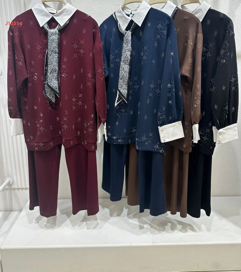 طقم بنطال قطعتين، ياقة قميص، مزين بالستراس مع فولار معرق