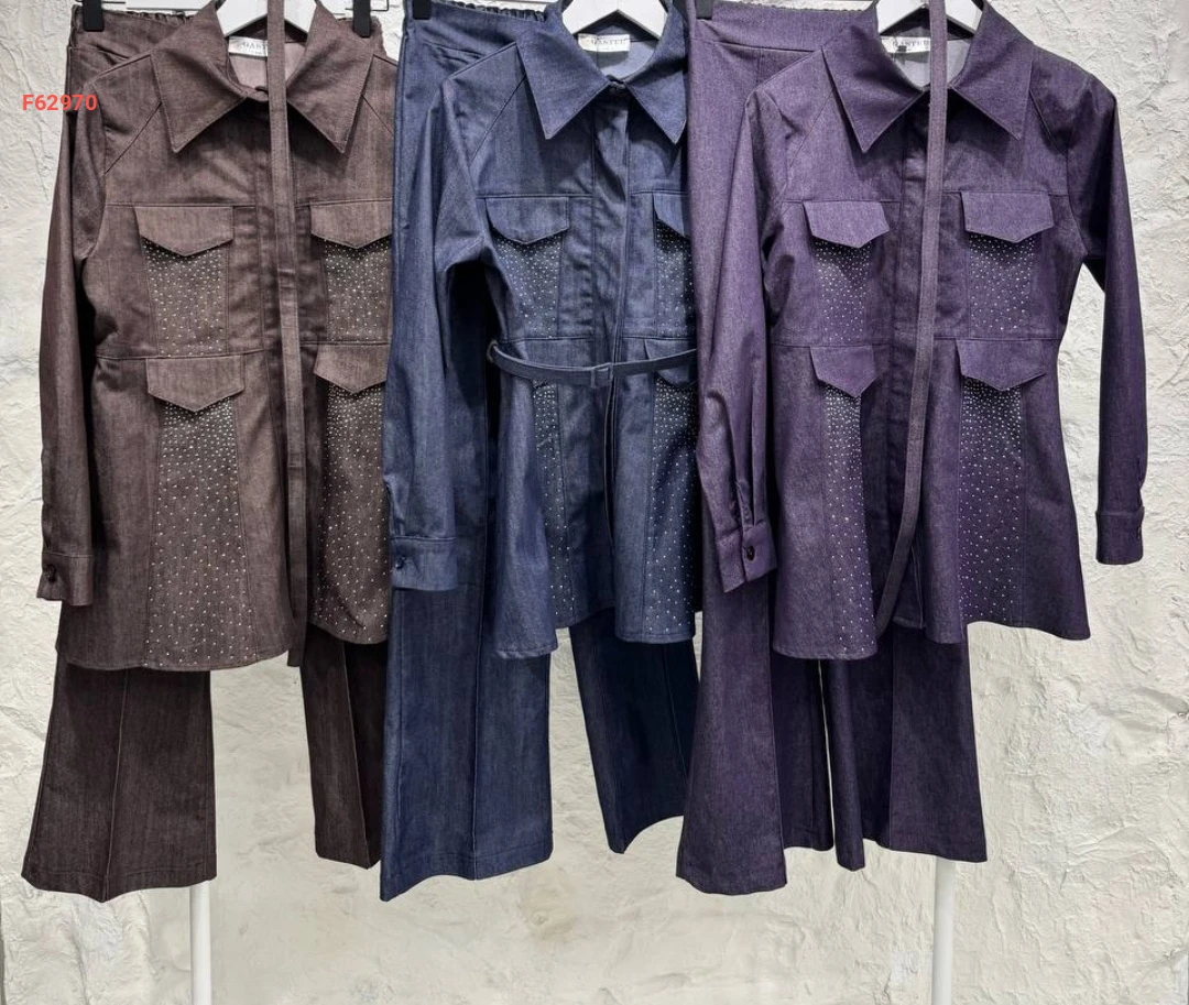 طقم بنطال قطعتين بأزرار مزين بستراس ناعم مع حزام
