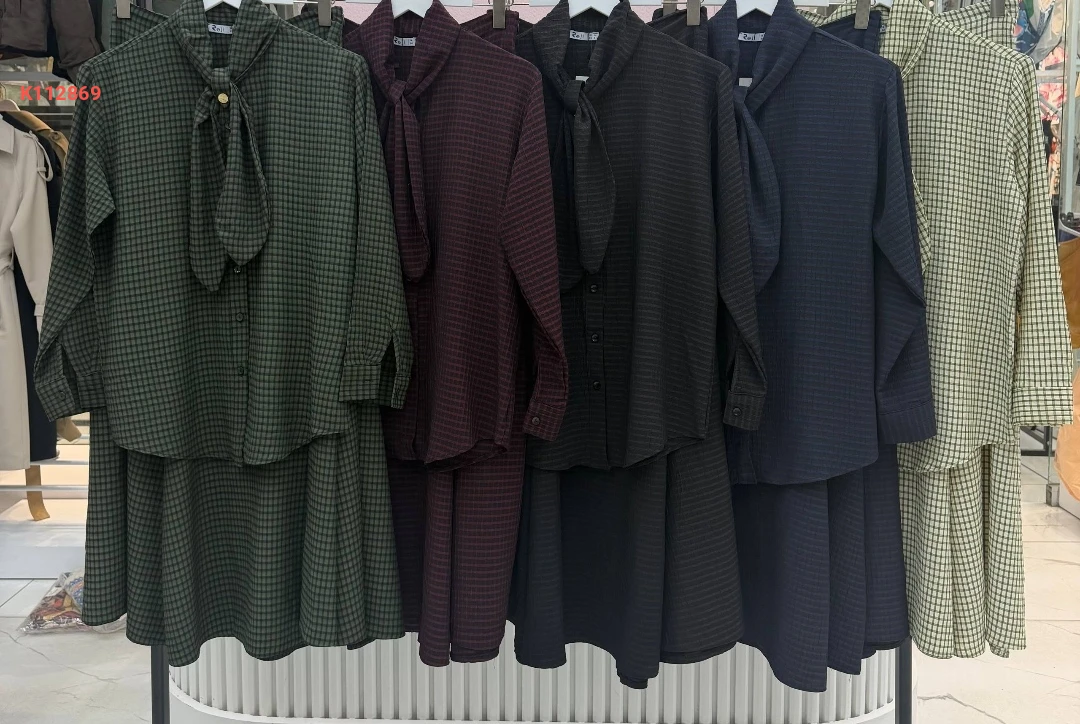 طقم تنورة كاروهات قطعتين بأزرار مع فولار