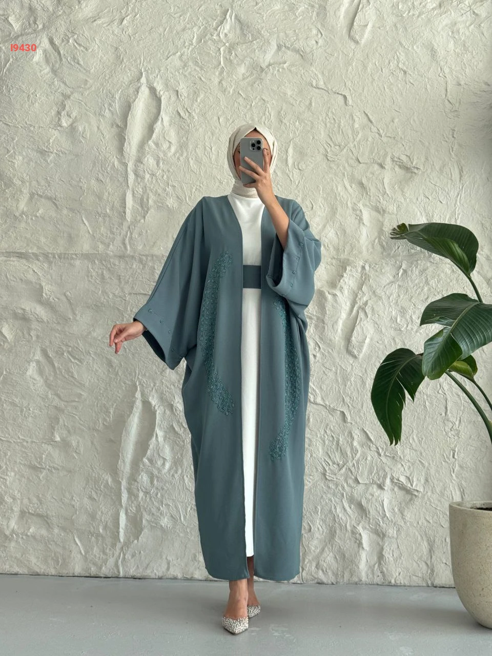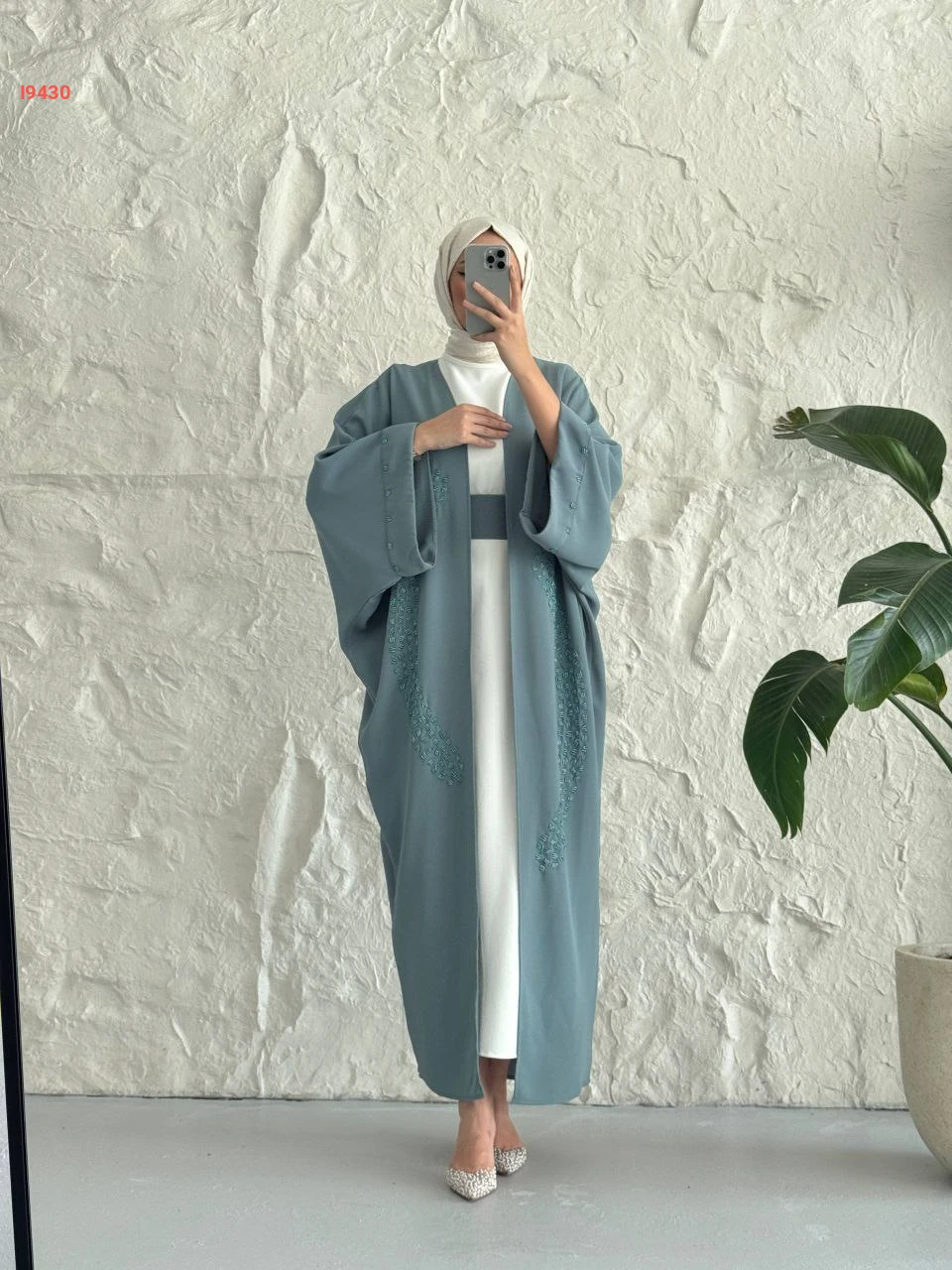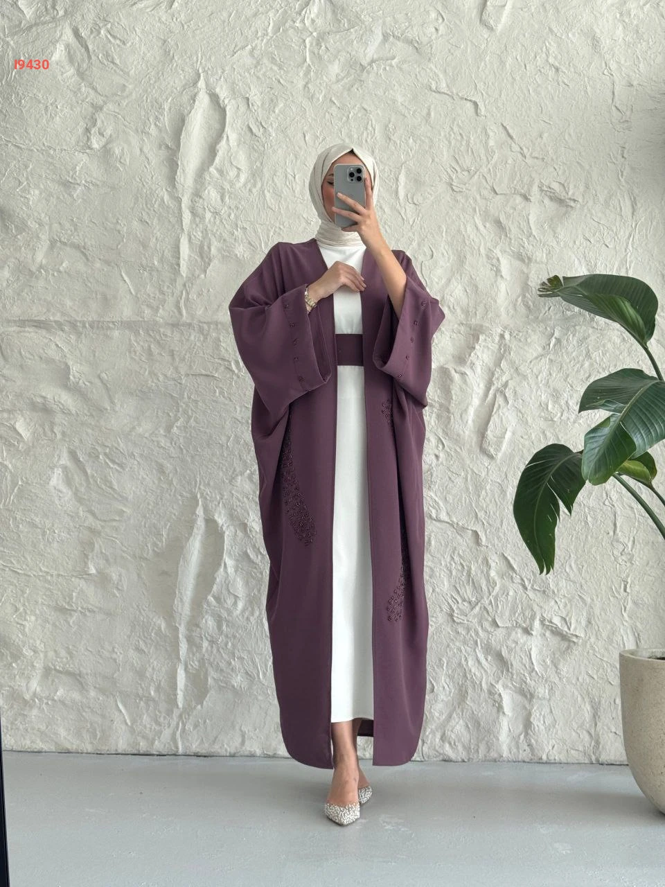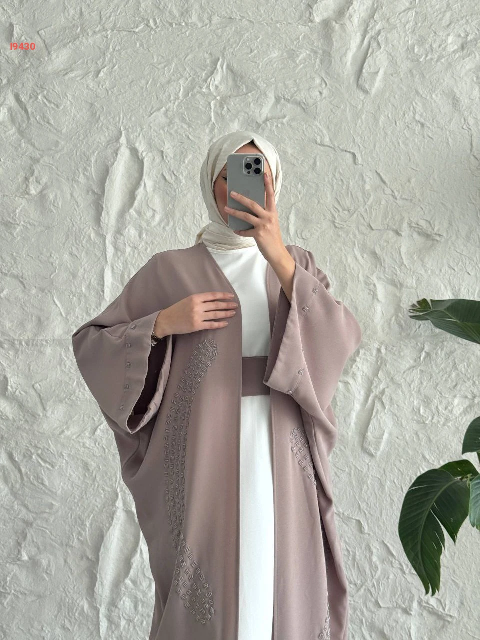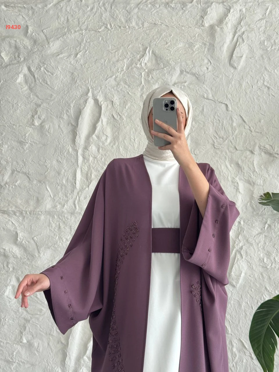 عباية قطعتين سادة بتطريز ناعم مع فستان وحزام