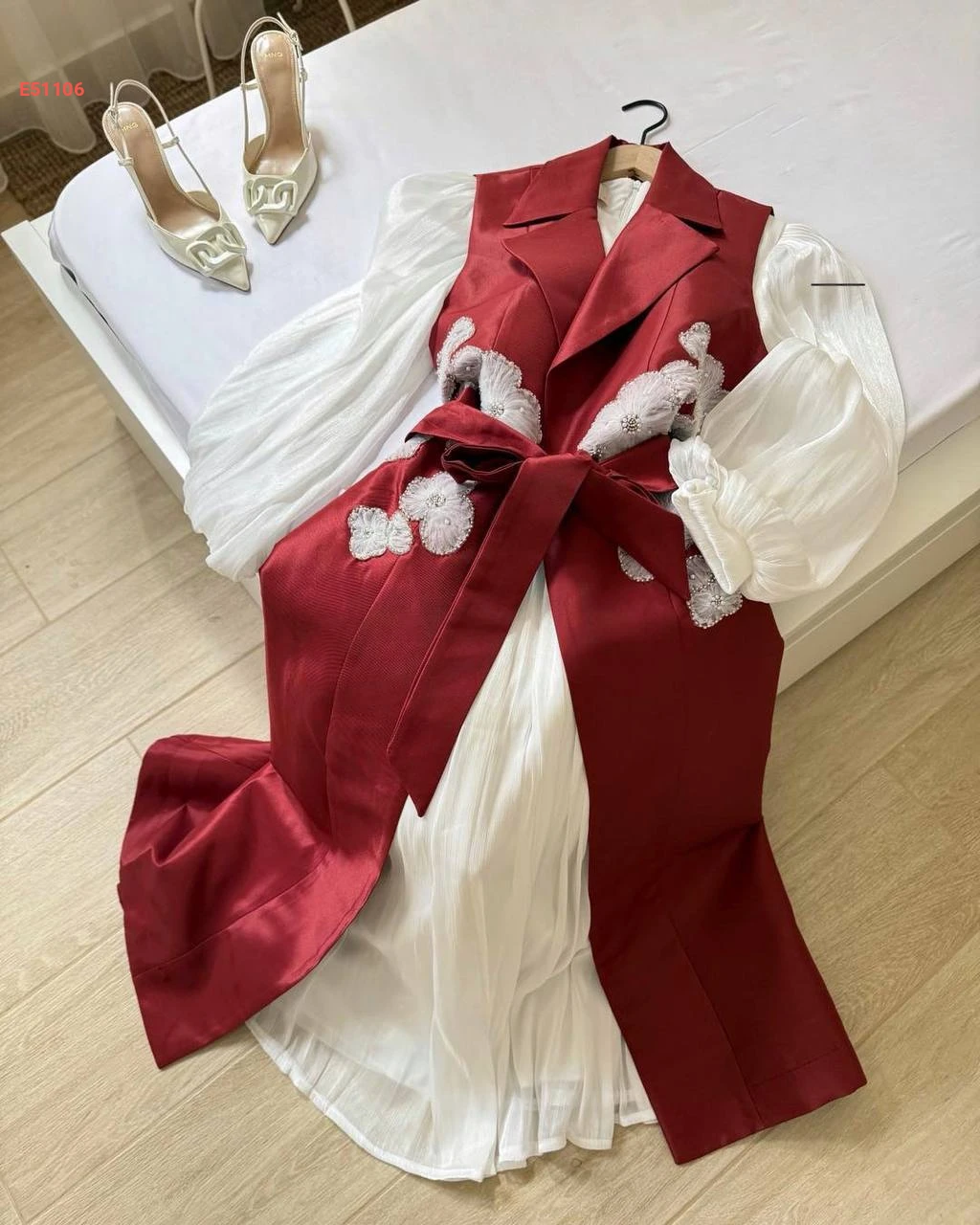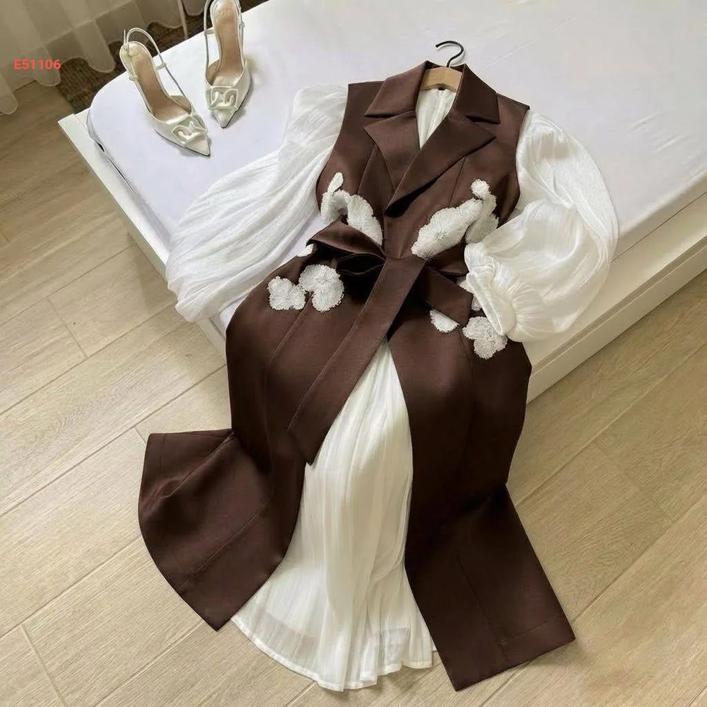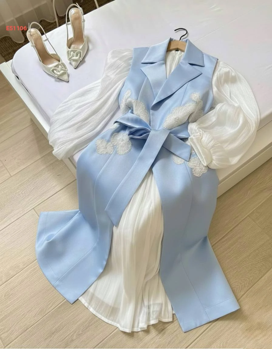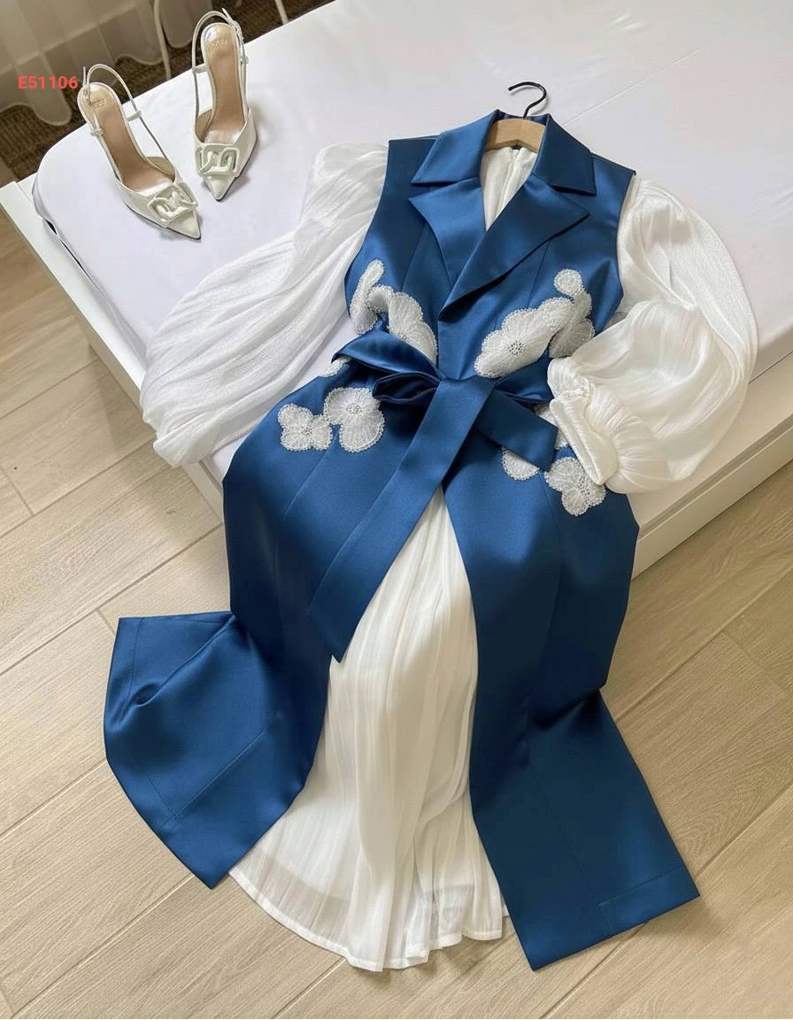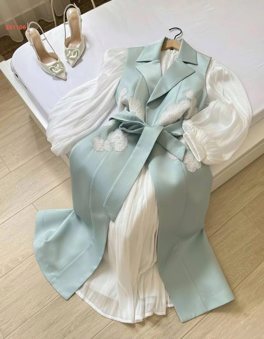 فستان قطعتين سادة دبل كلوش ، جاكيت ساتان مطرز مع حزام