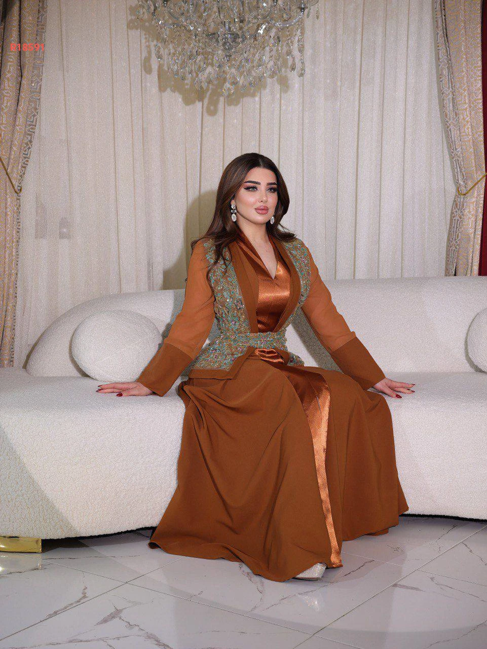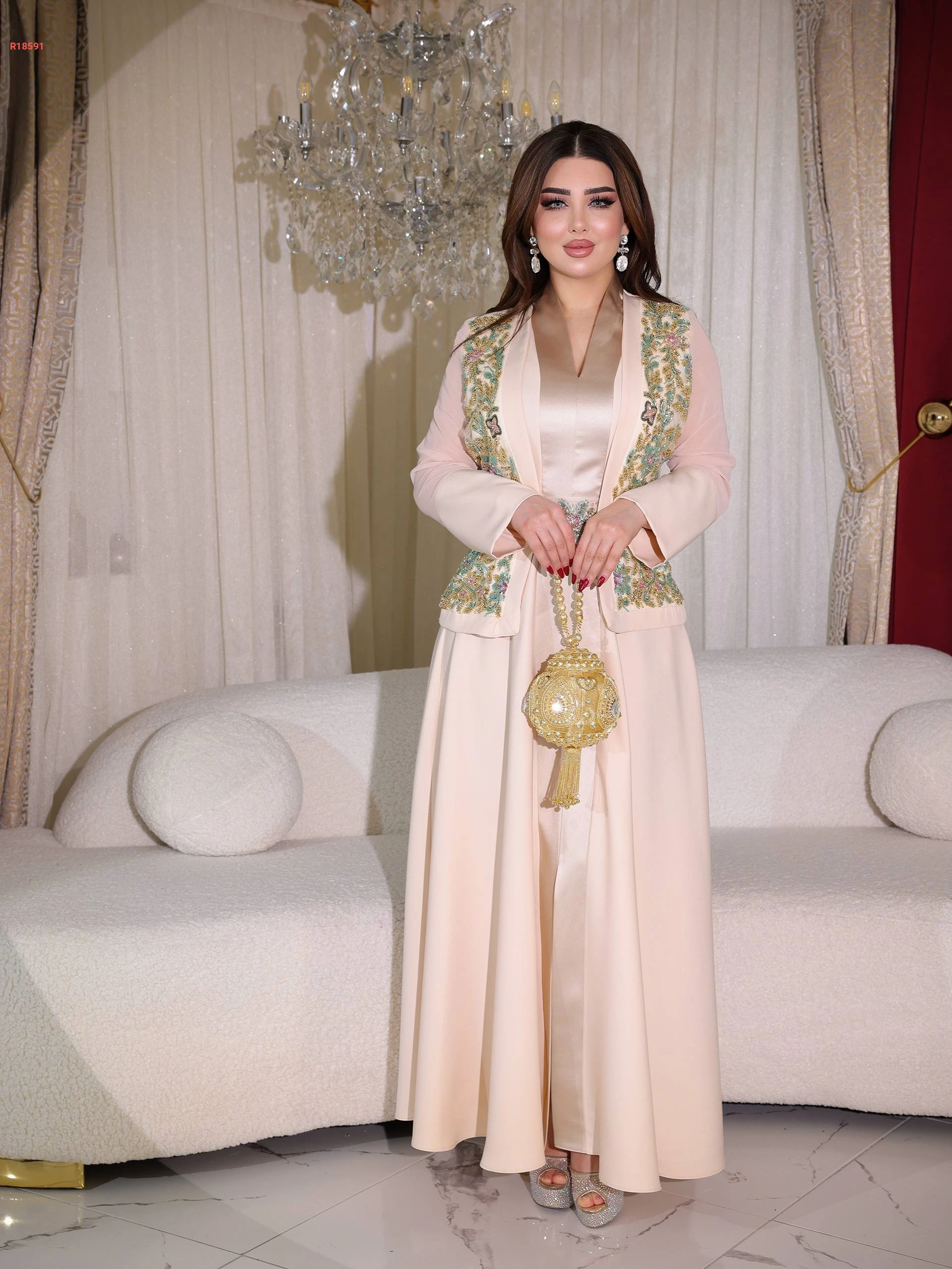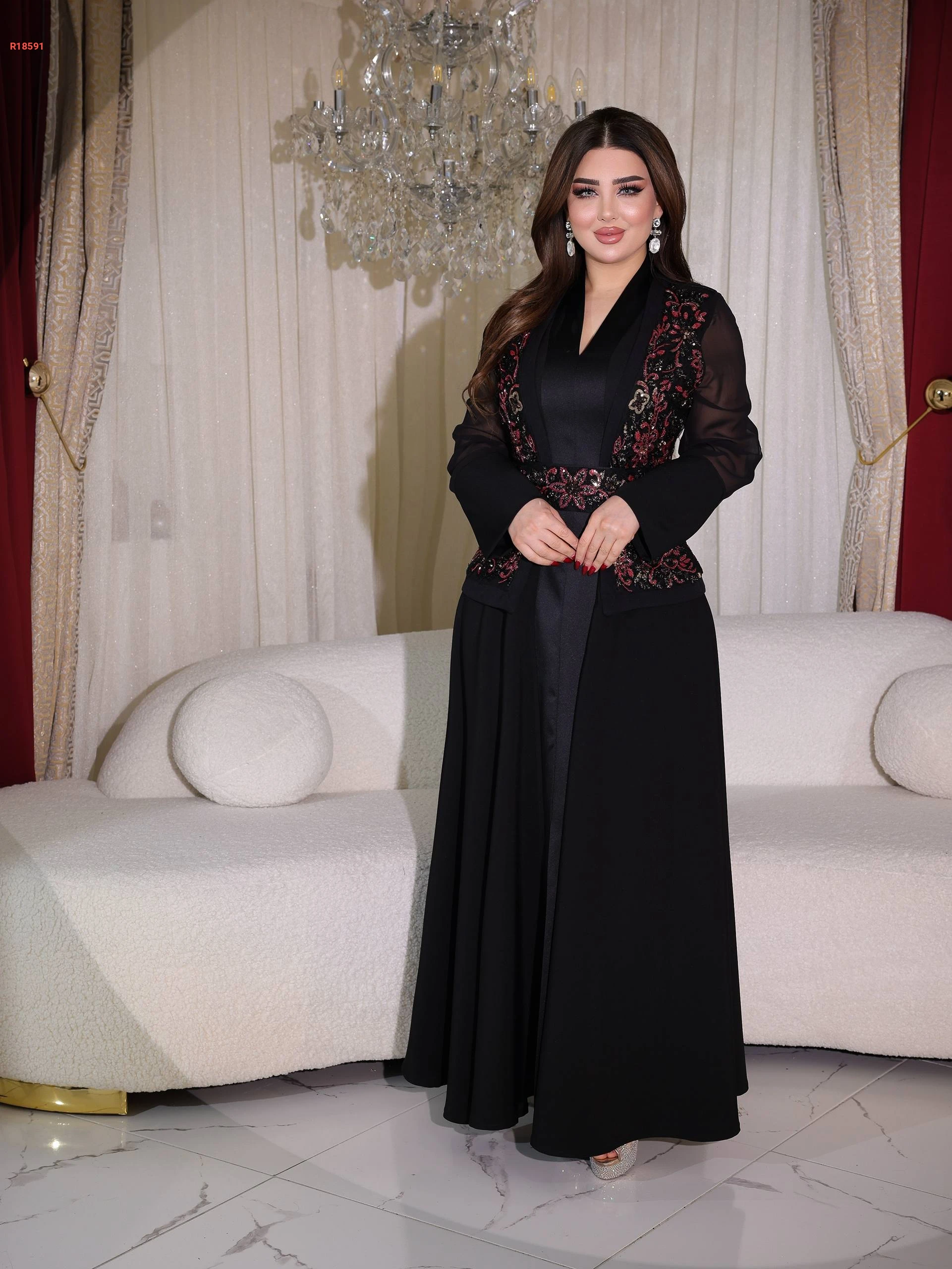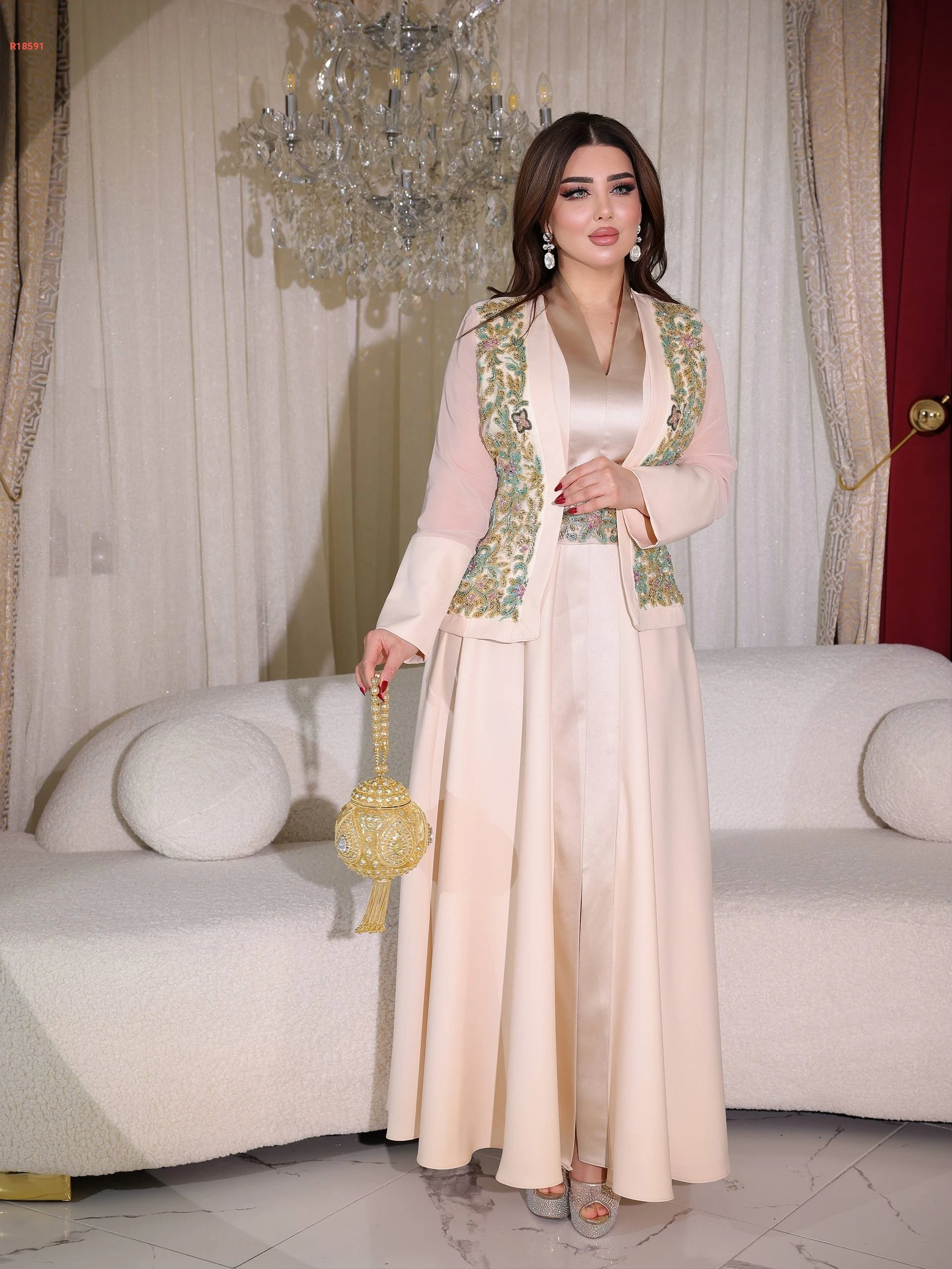 فستان سواريه قطعتين سادة مع جاكيت بتطريز شك خرز عند الصدر بأكمام شيفون مع حزام