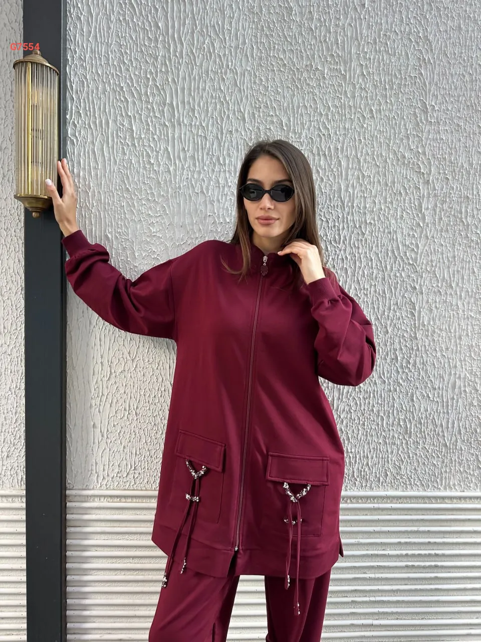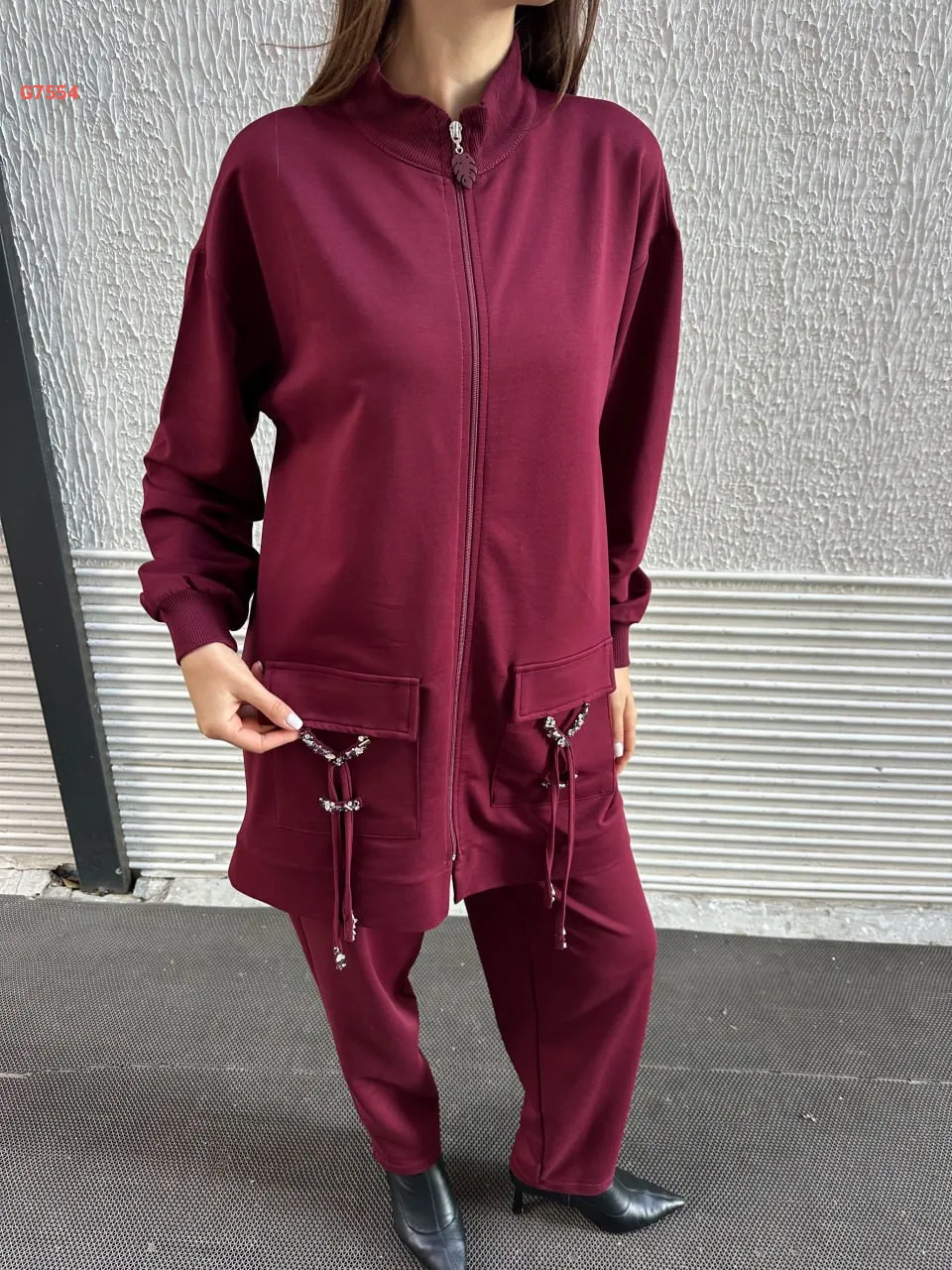 بيجامة قطعتين سادة بسحاب مع جيب عريضة