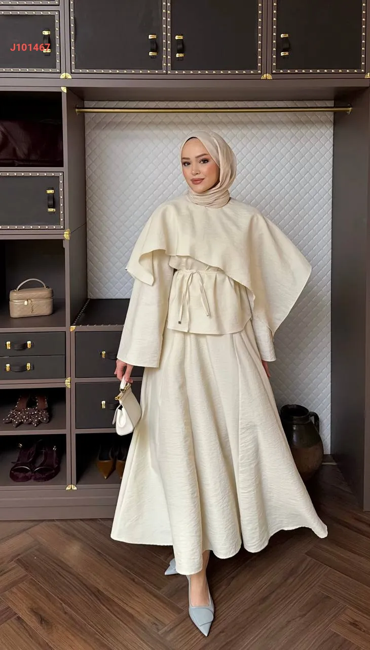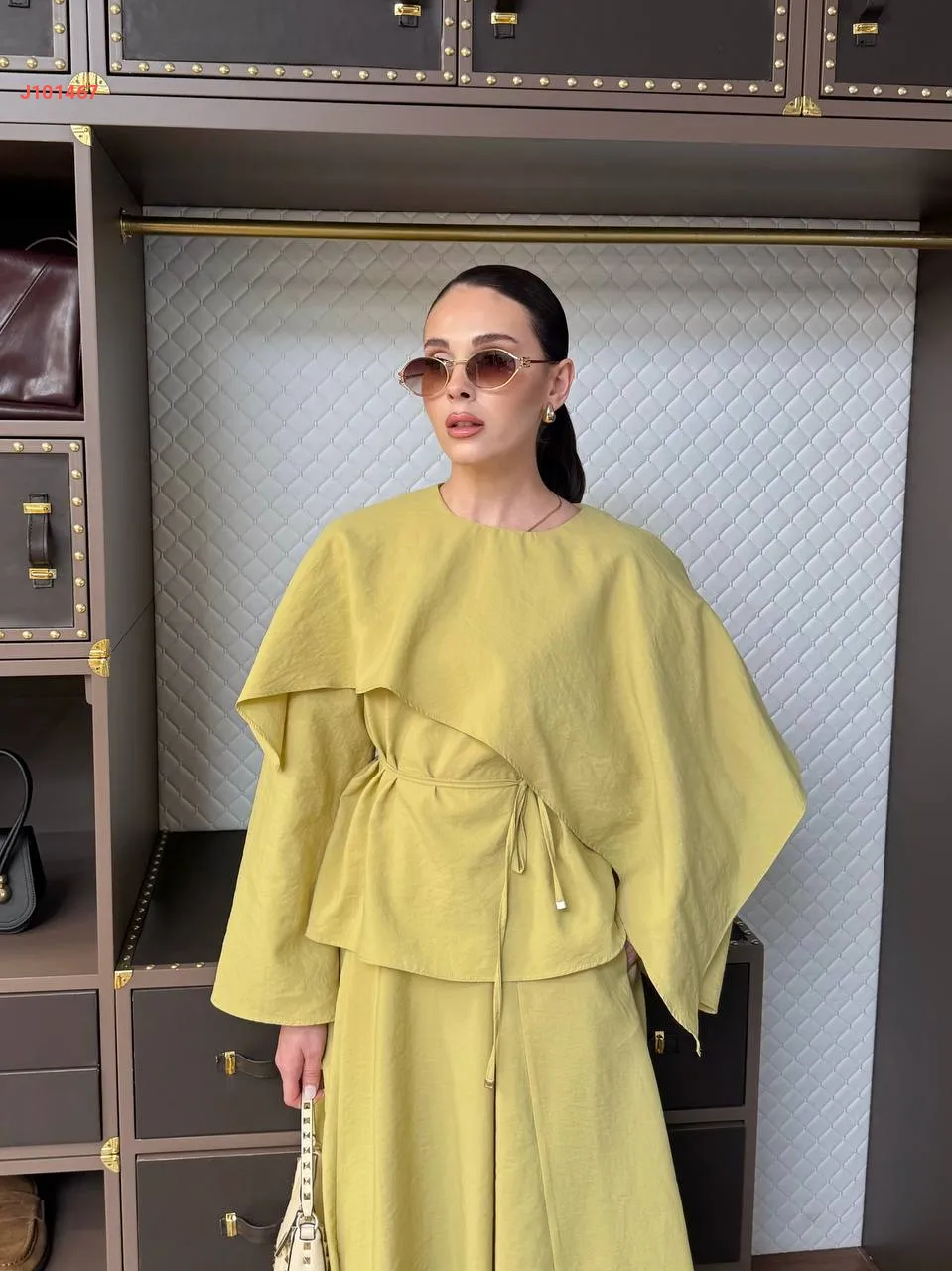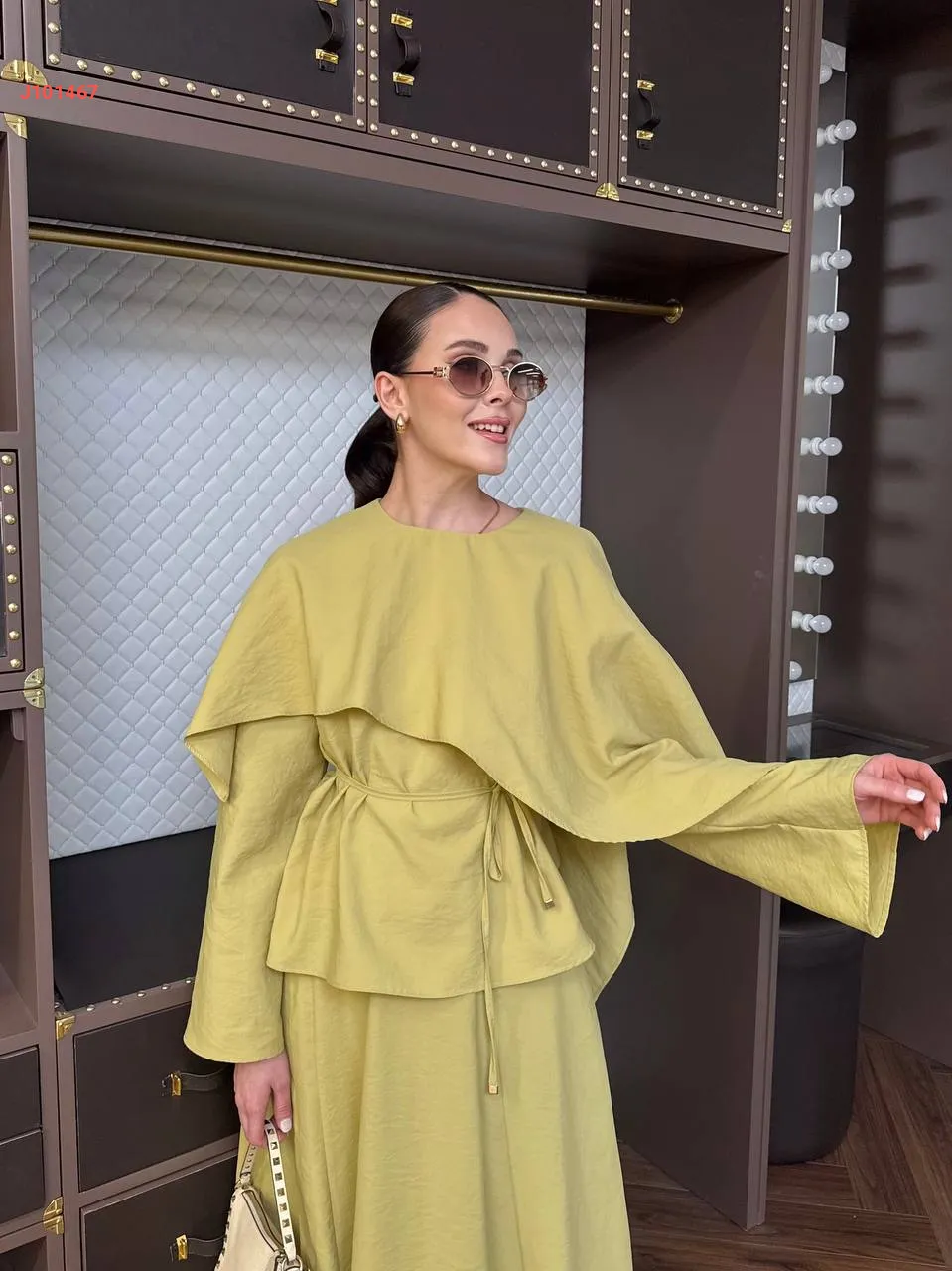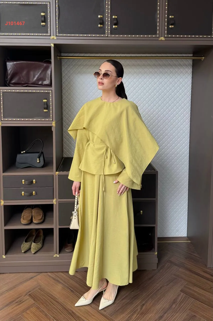 طقم تنورة قطعتين سادة ، مع ربطة خصر