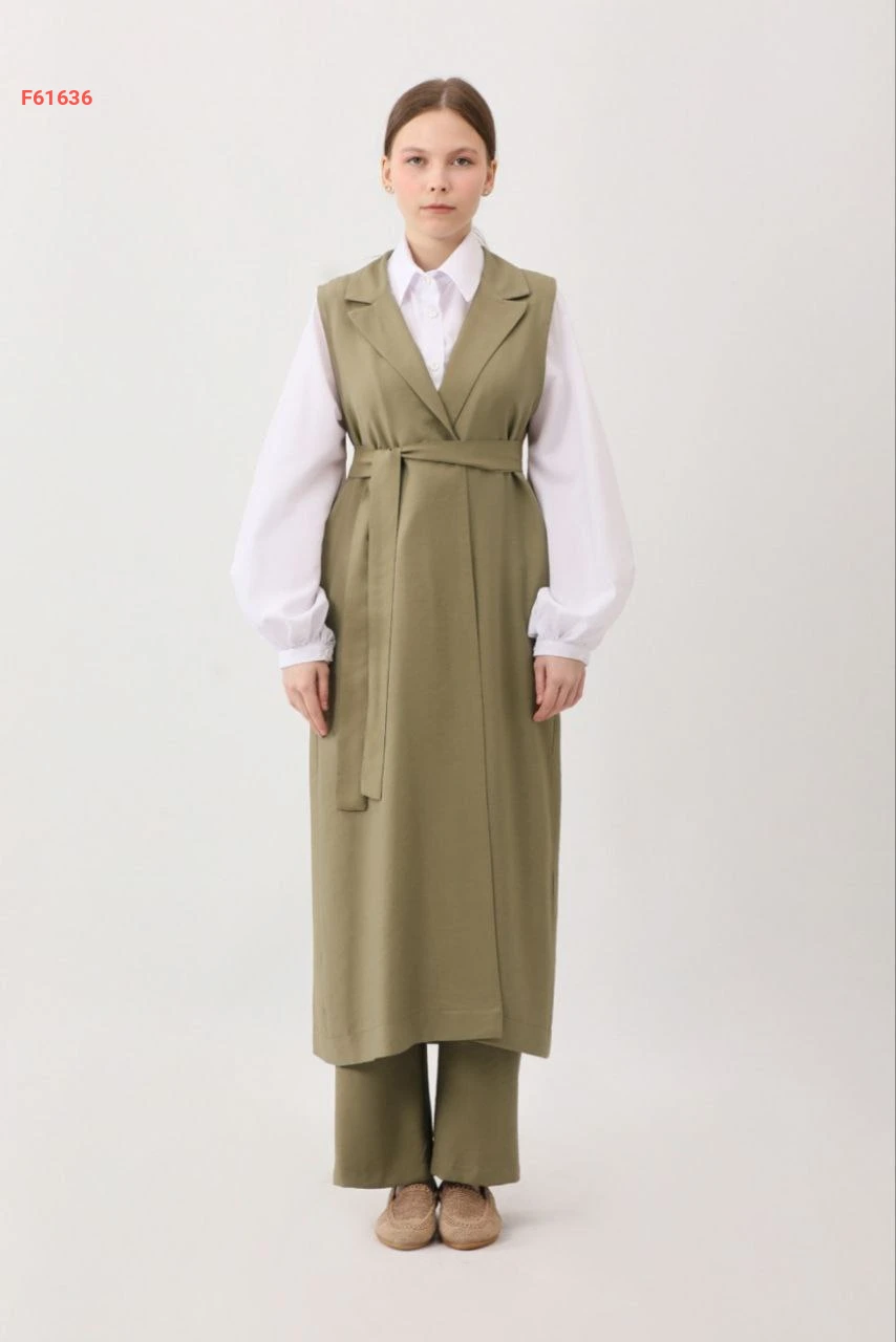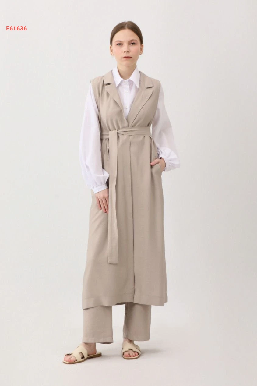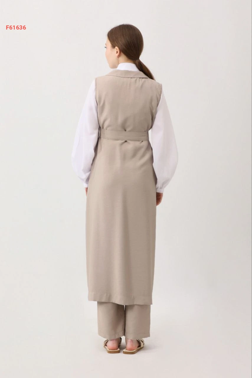 طقم بنطال قطعتين سادة حفر بأزرار مع حزام وجيب