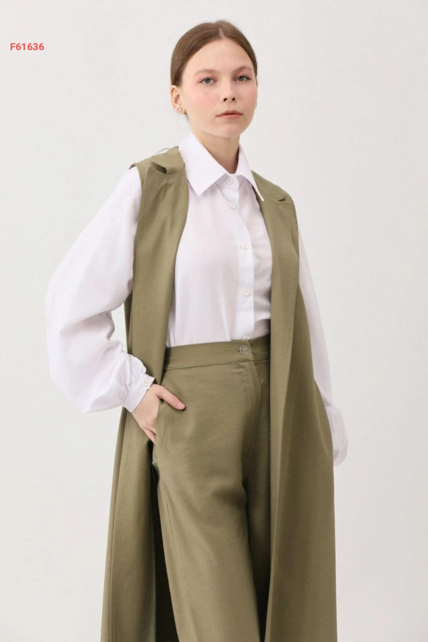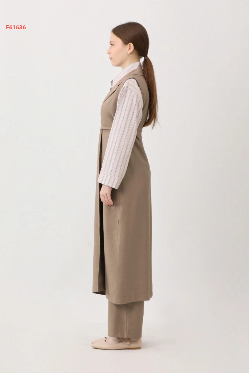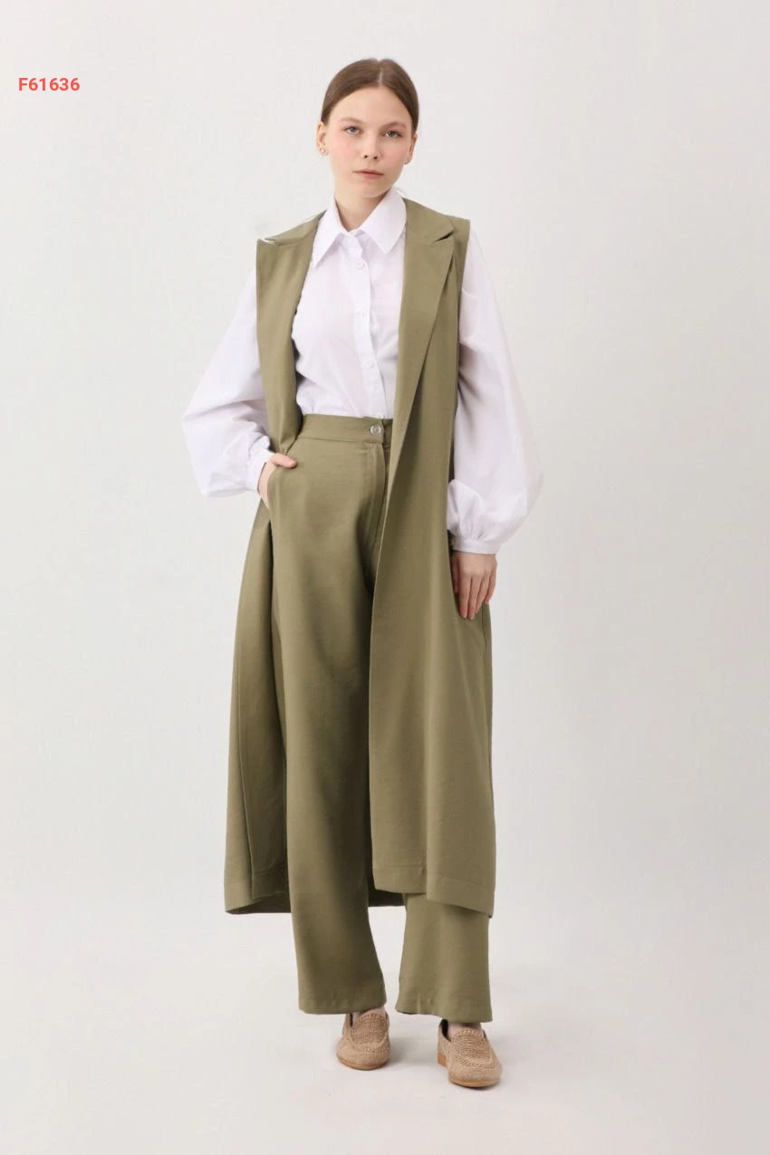 طقم بنطال قطعتين سادة حفر بأزرار مع حزام وجيب