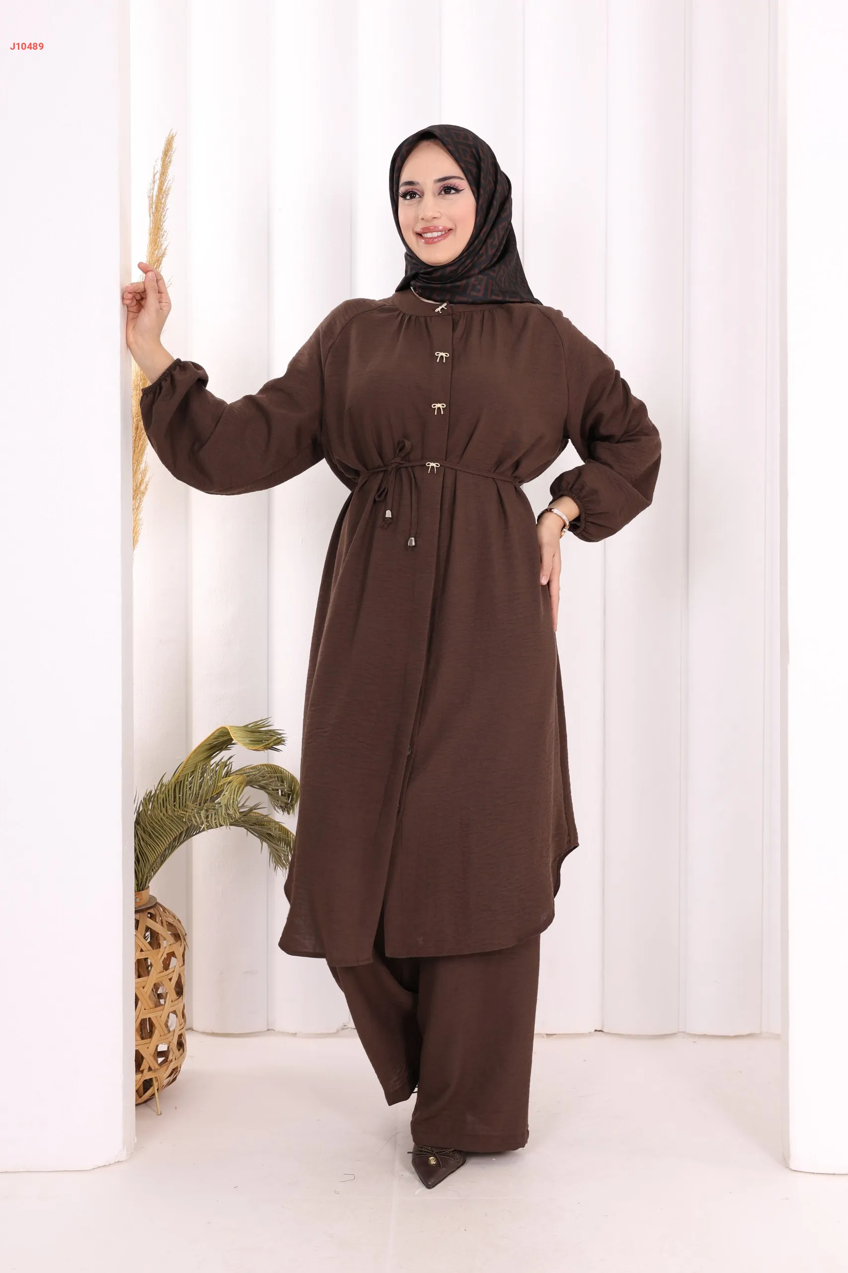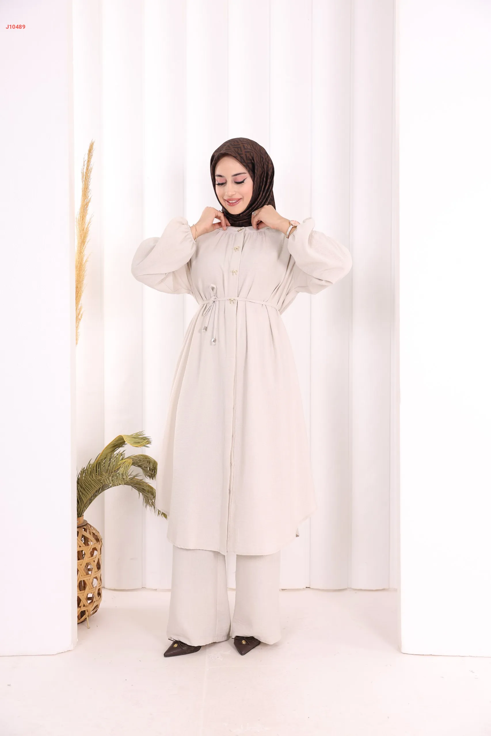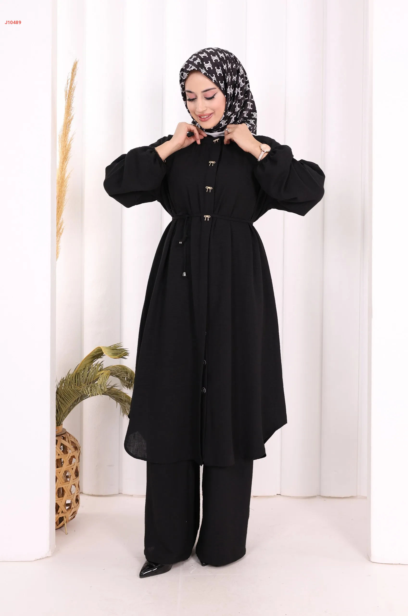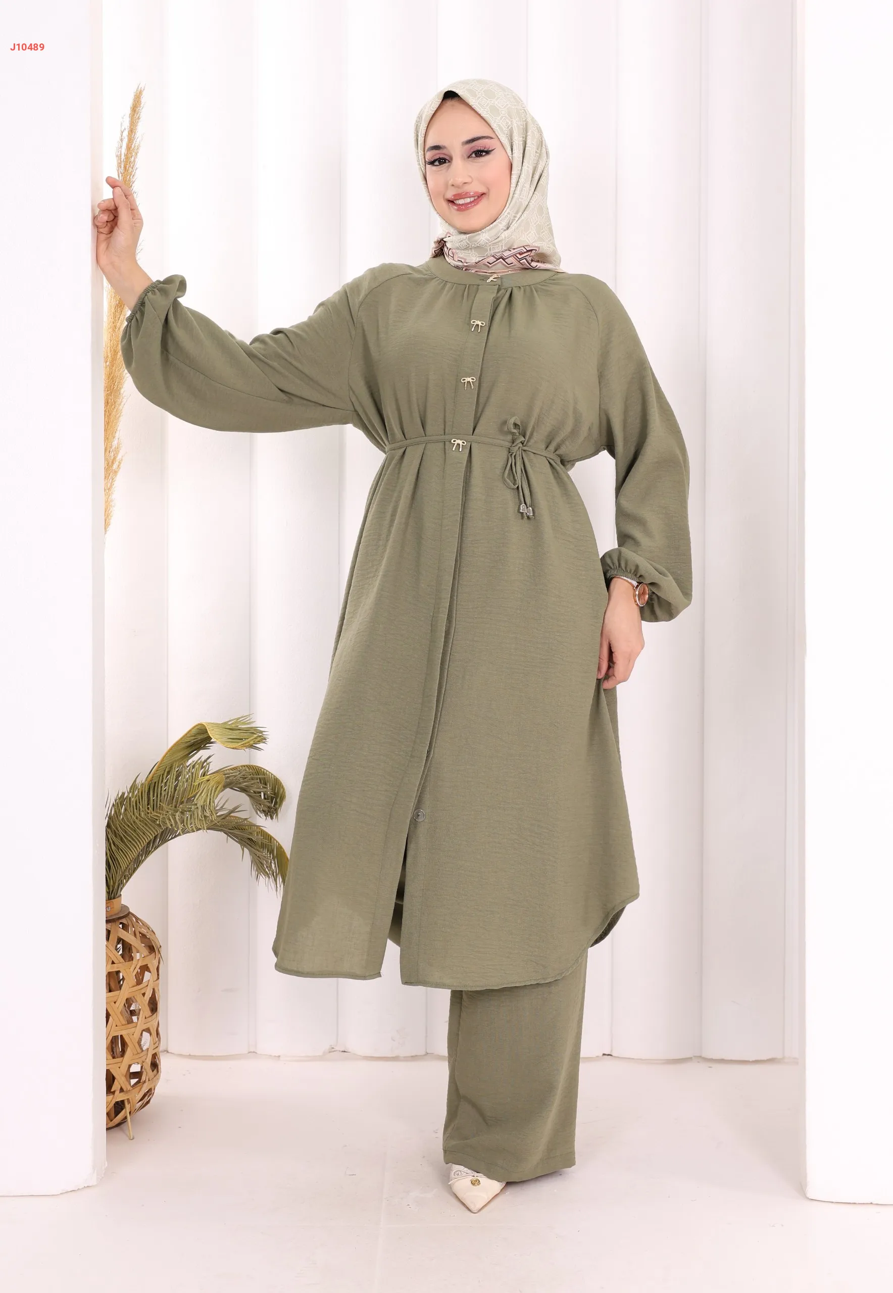 طقم تونيك قطعتين سادة بأزرار مخفية مع ربطة خصر