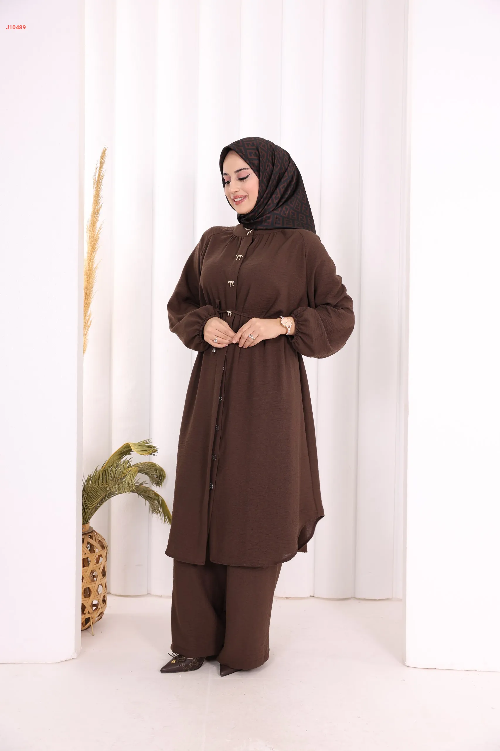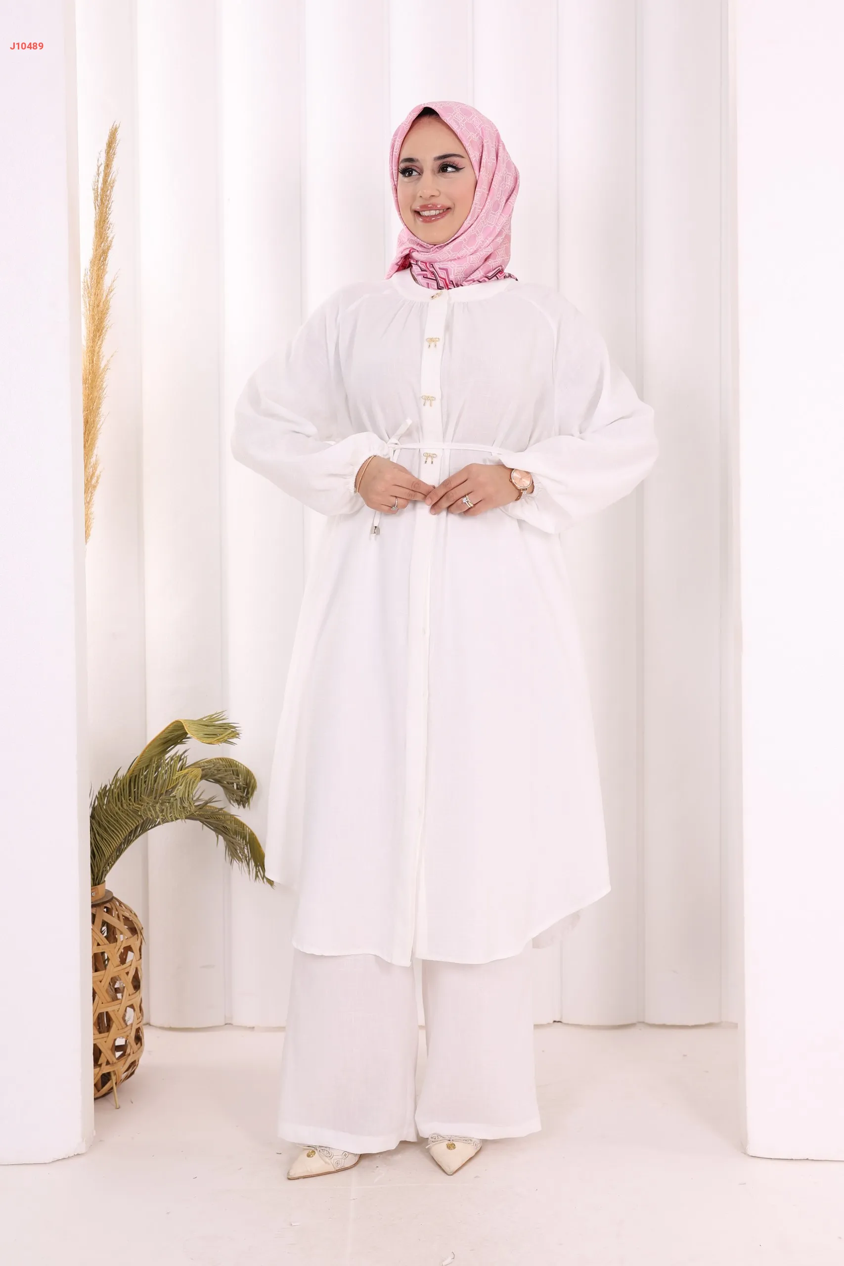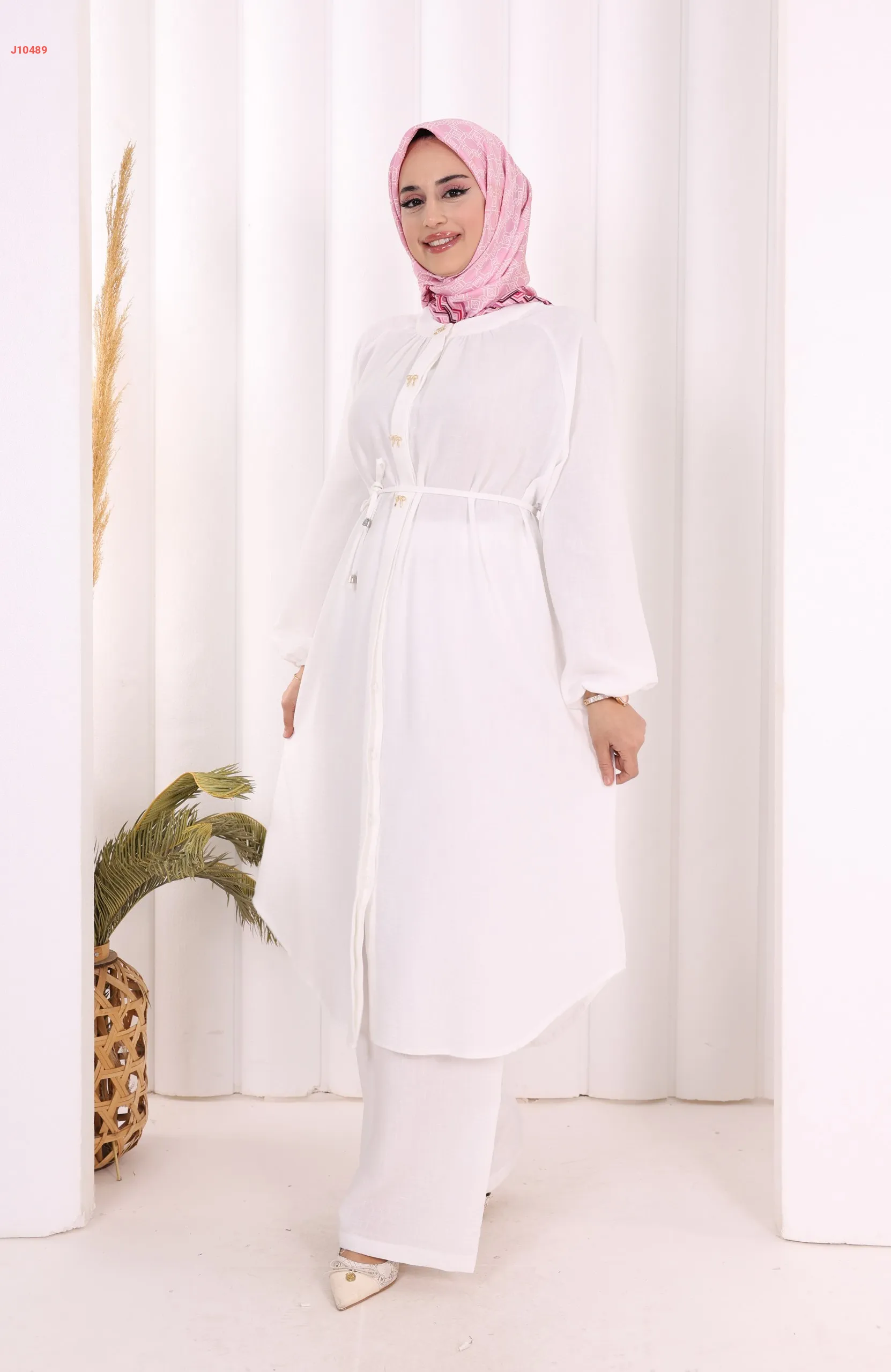 طقم تونيك قطعتين سادة بأزرار مخفية مع ربطة خصر