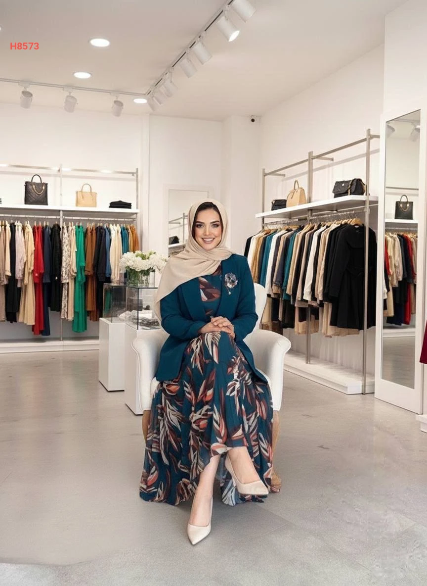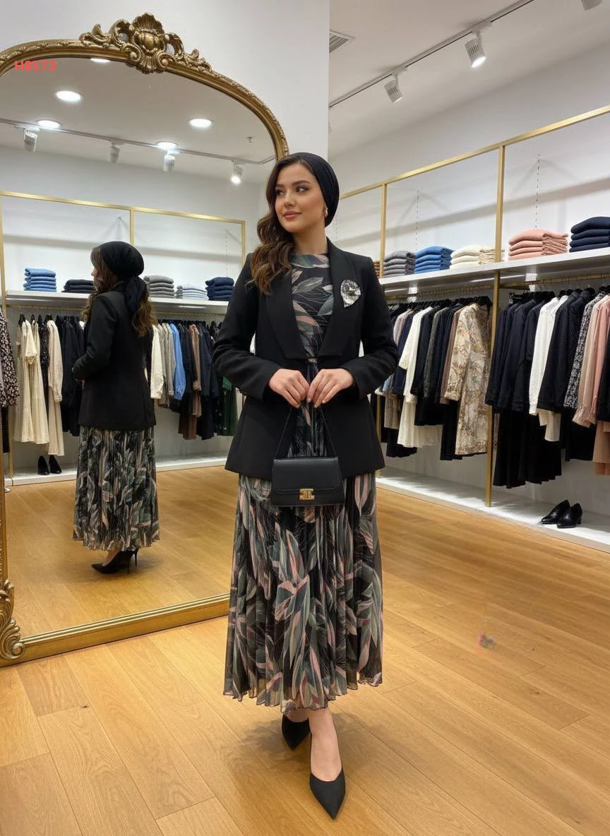 فستان قطعتين معرق مع جاكيت سادة مبطن