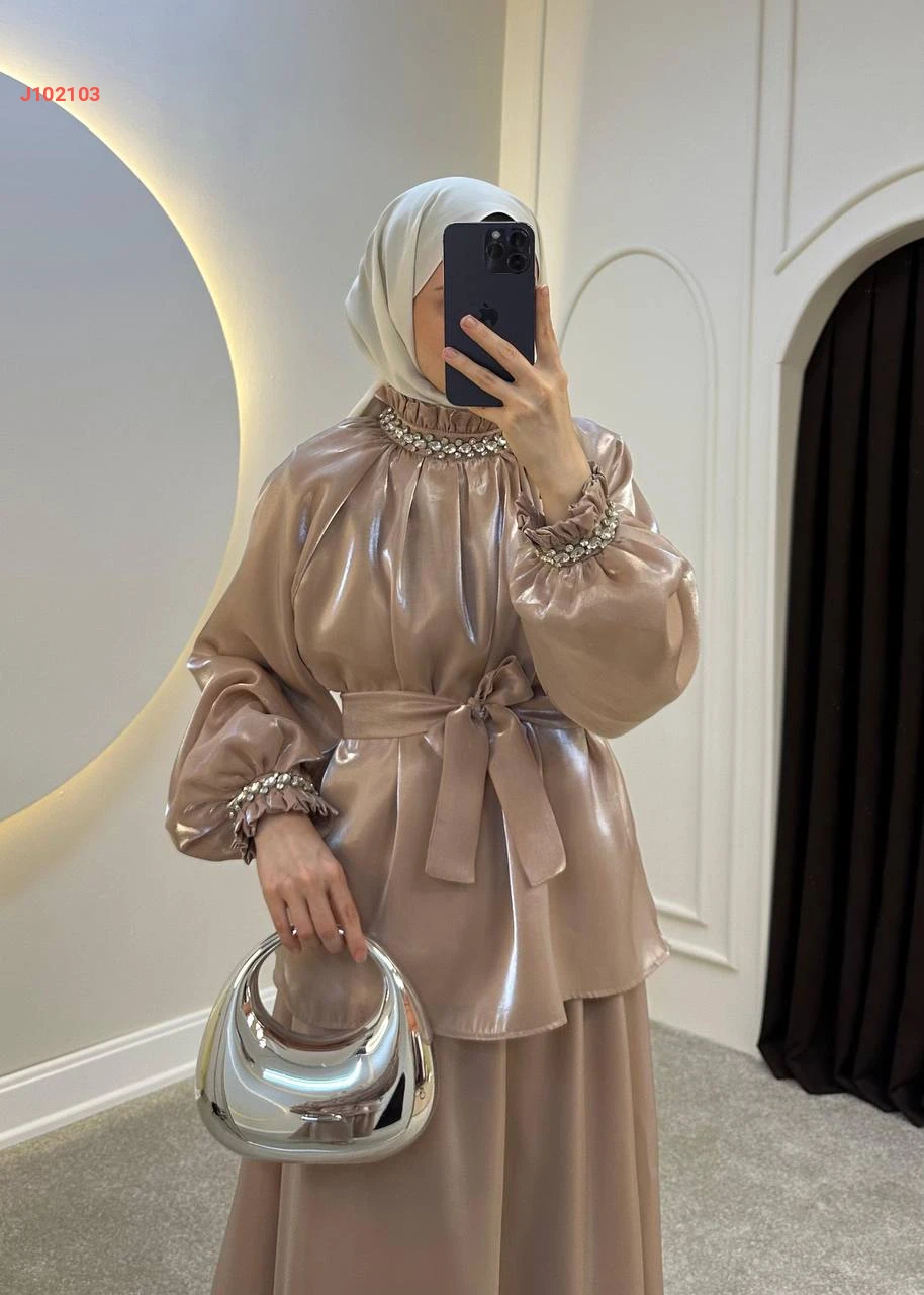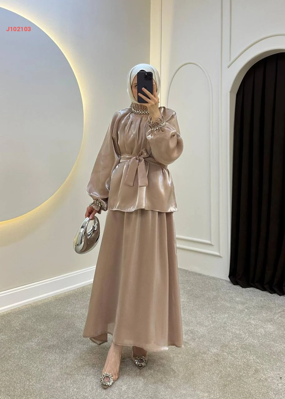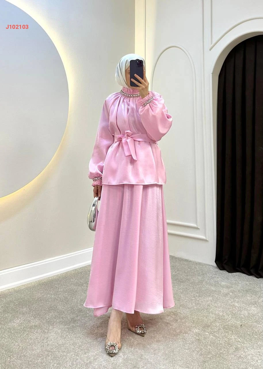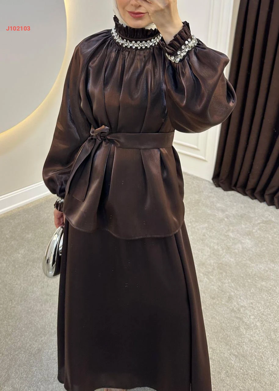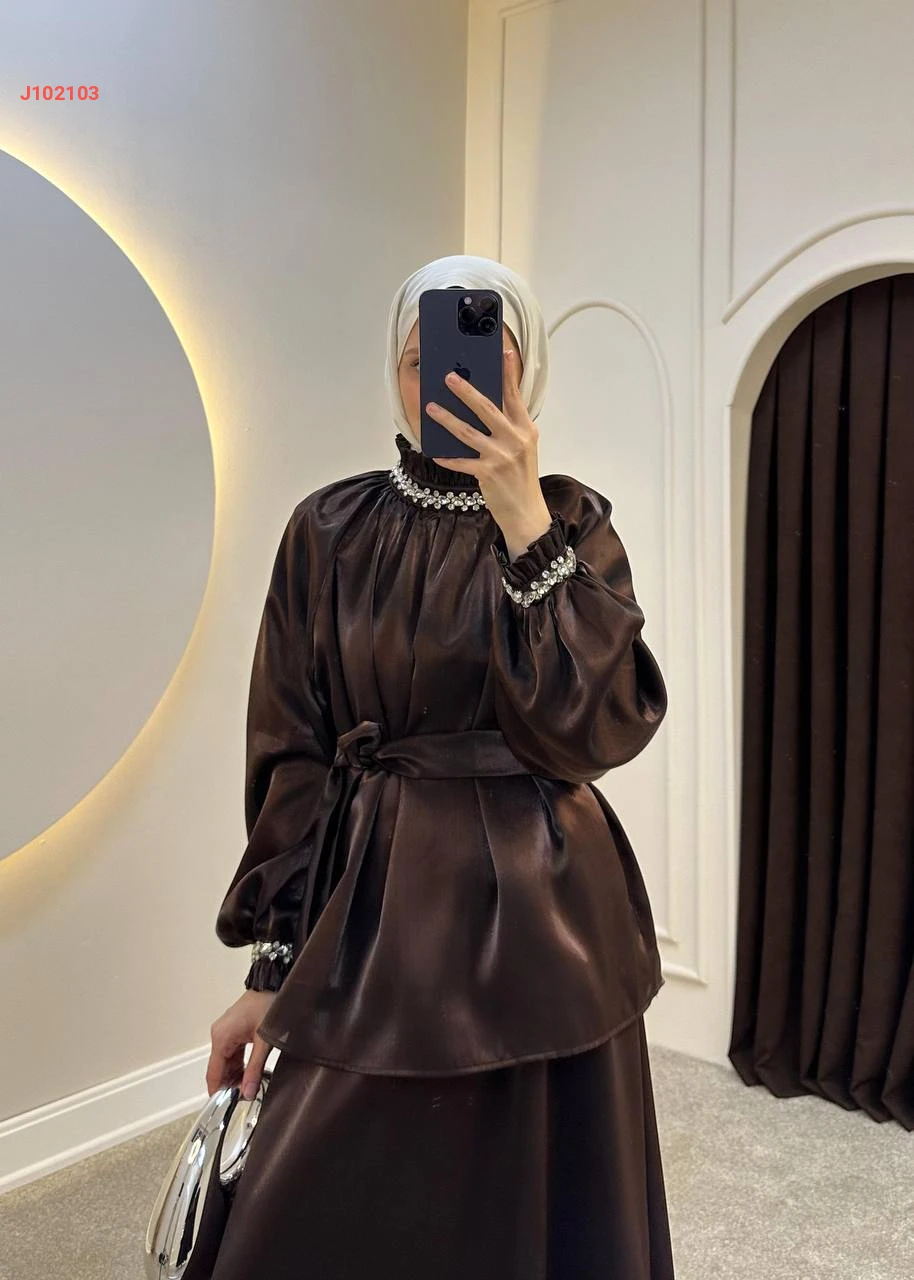 طقم تنورة قطعتين ساتان بياقة مرتفعة بالكريستال