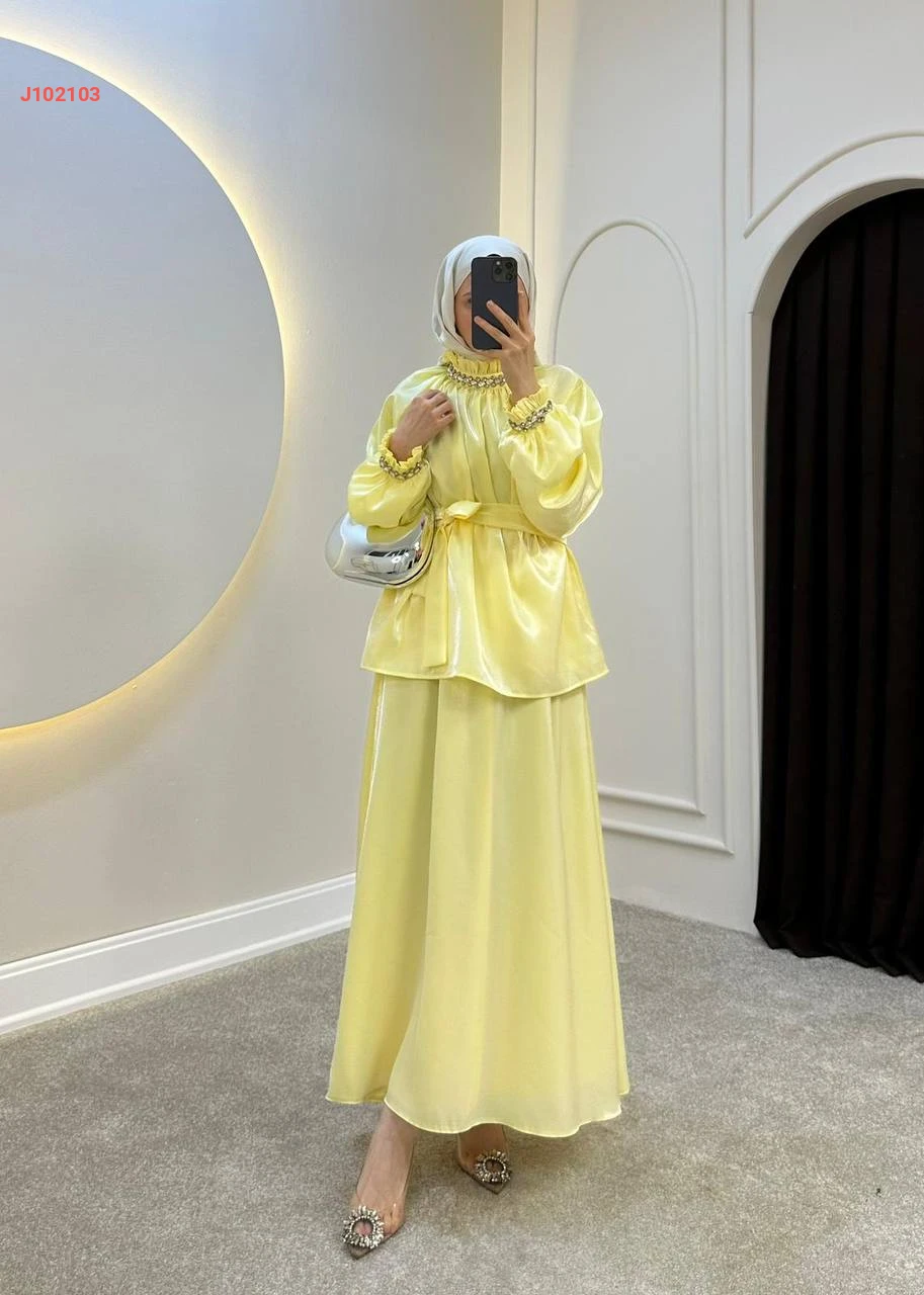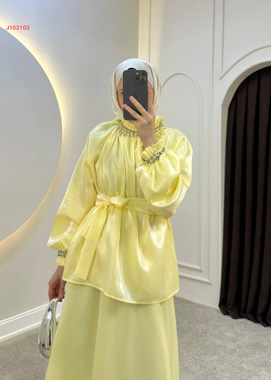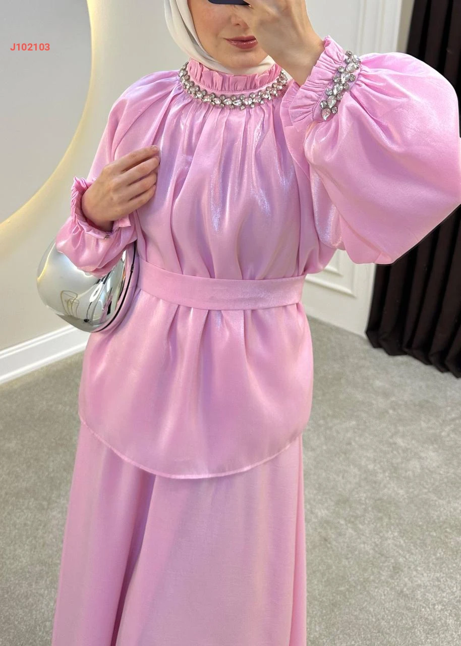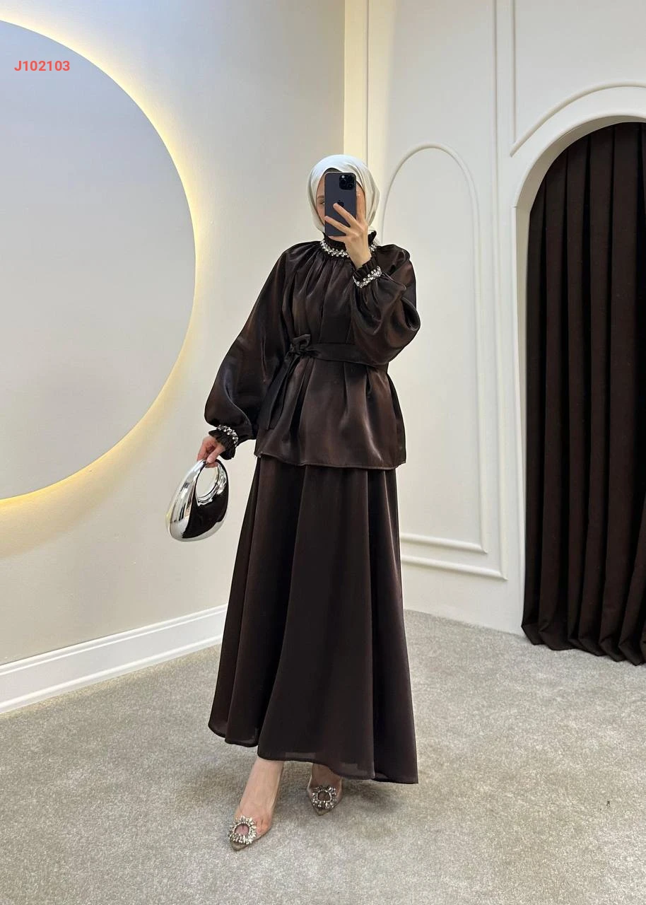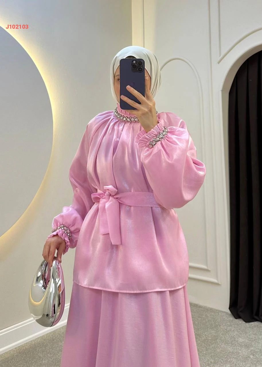 طقم تنورة قطعتين ساتان بياقة مرتفعة بالكريستال
