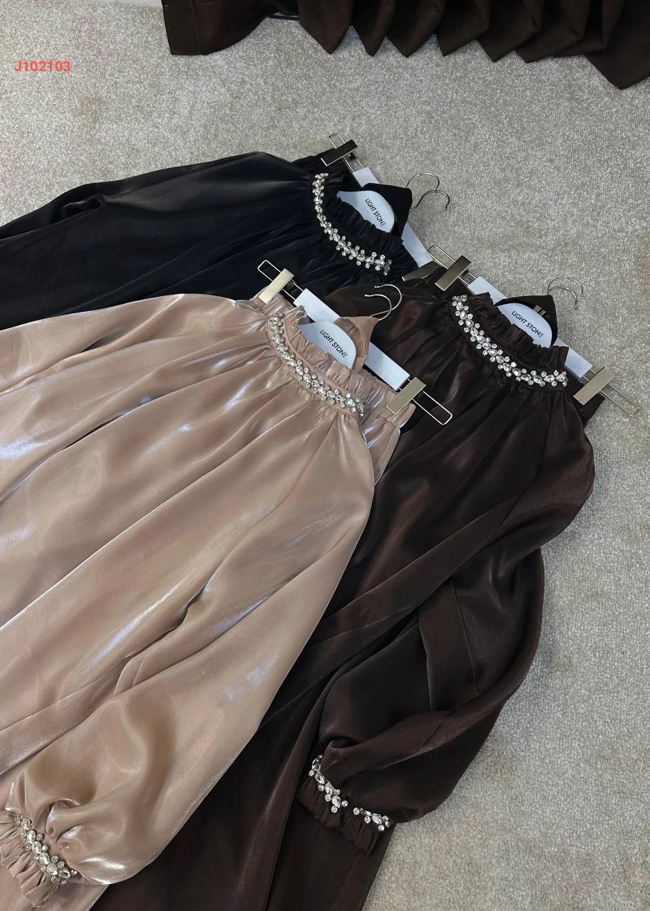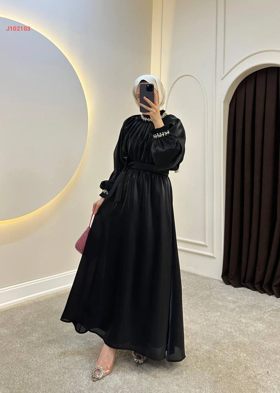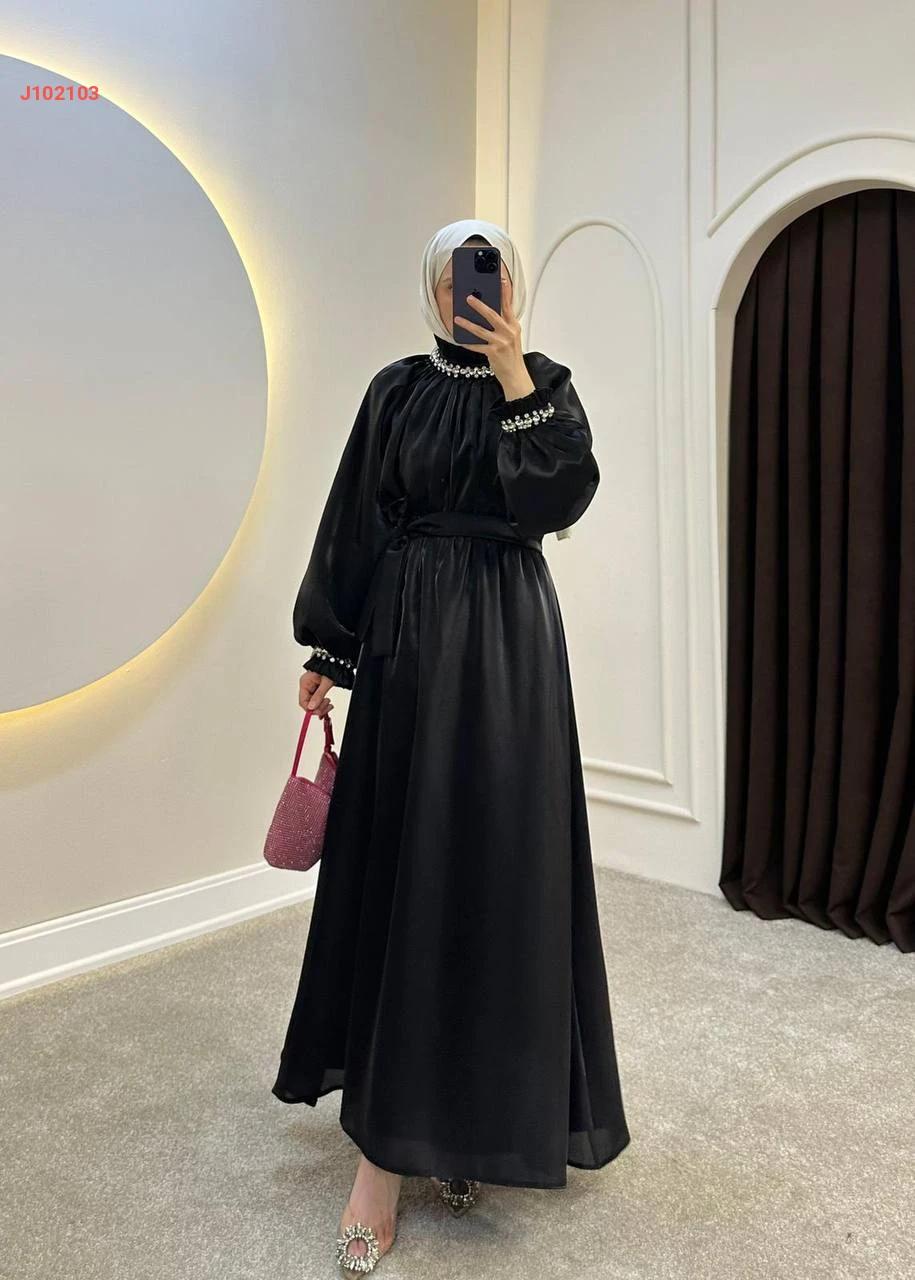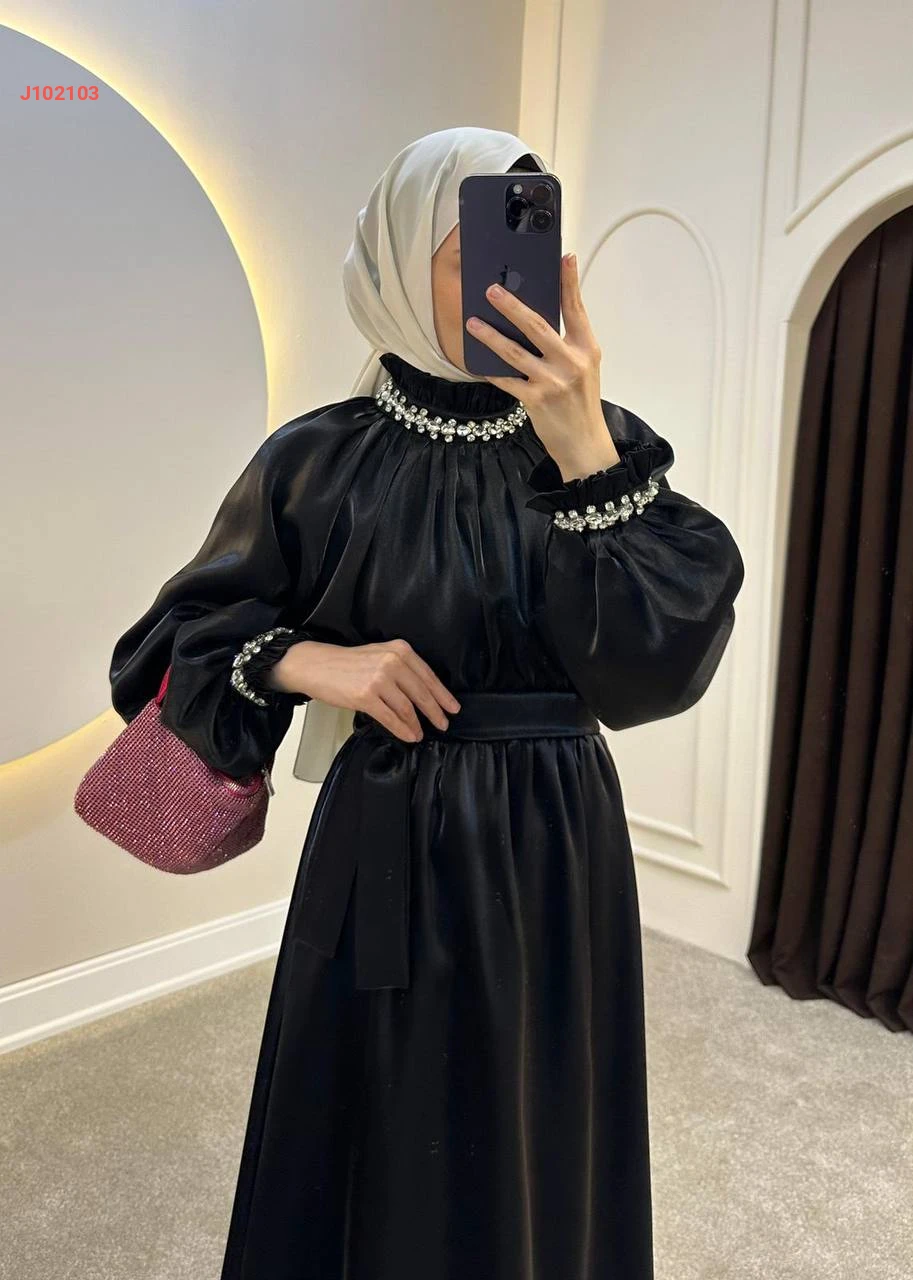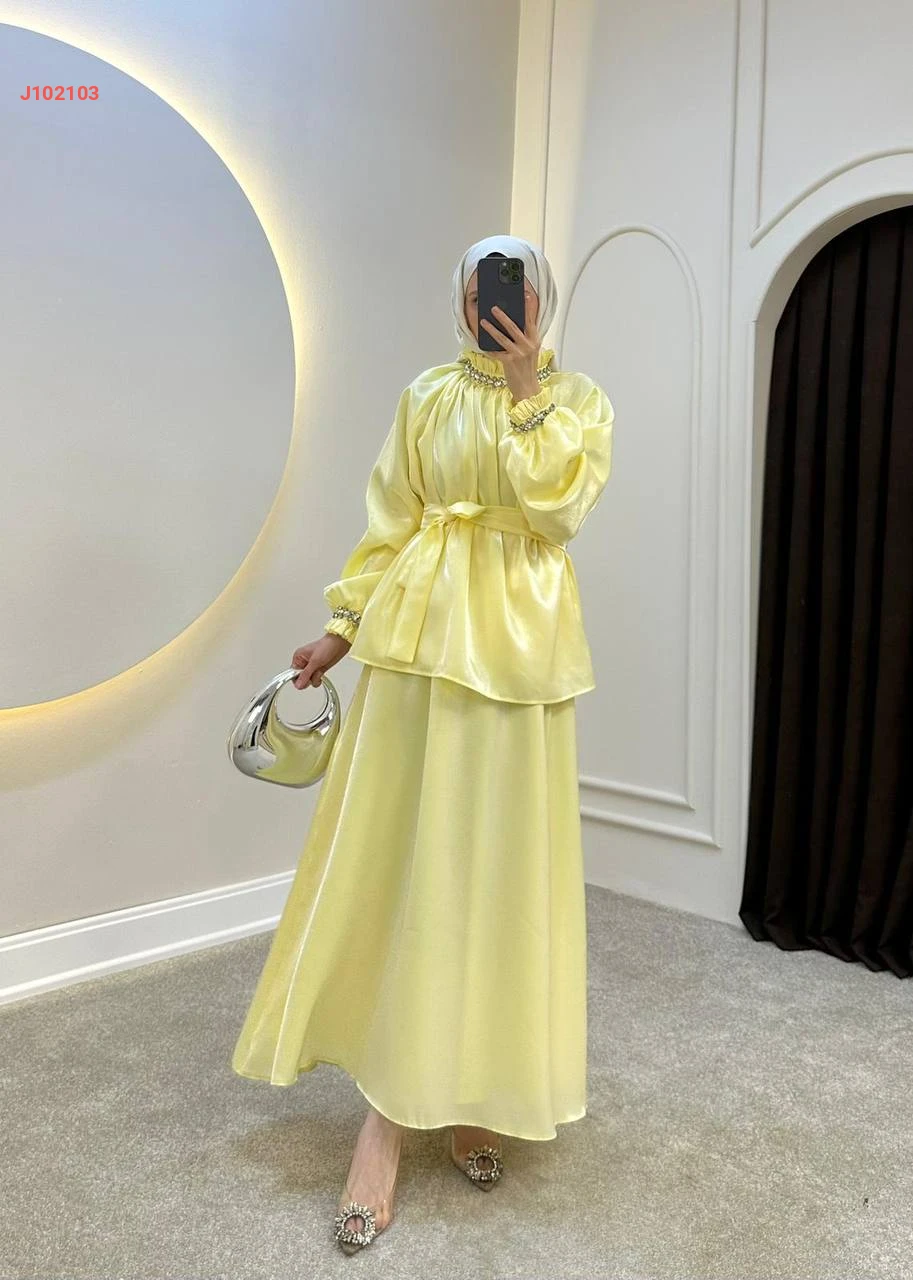طقم تنورة قطعتين ساتان بياقة مرتفعة بالكريستال