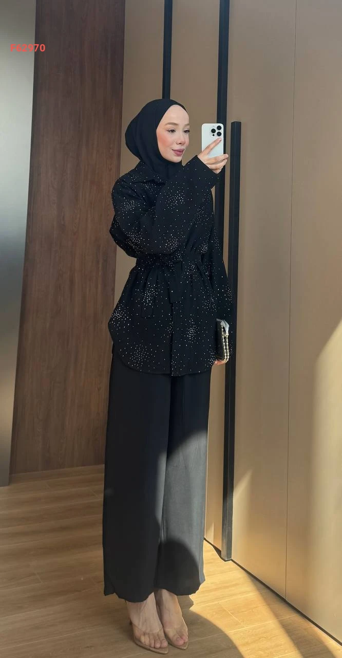 طقم قطعتين مزين بالستراس مع حزام خصر