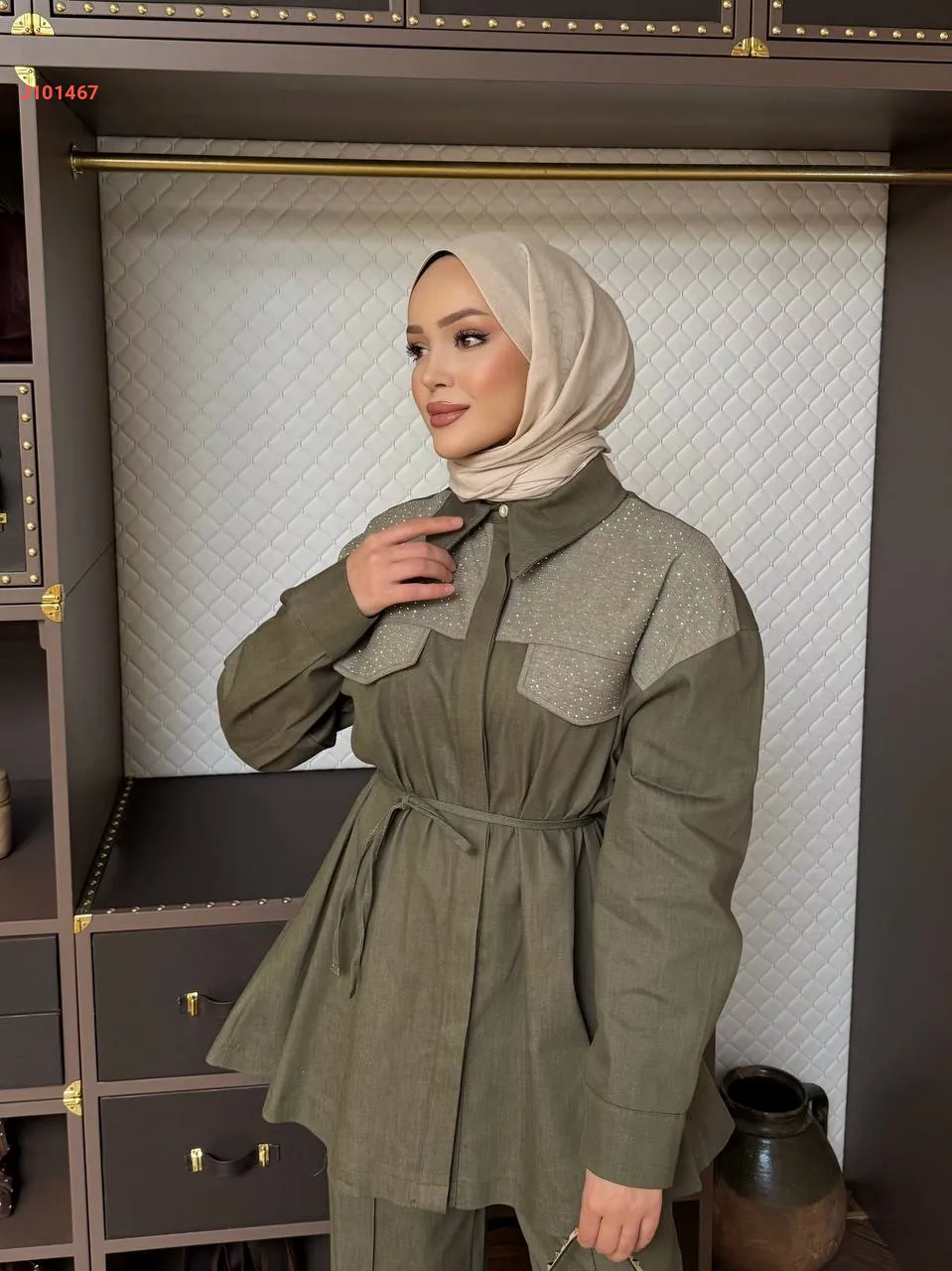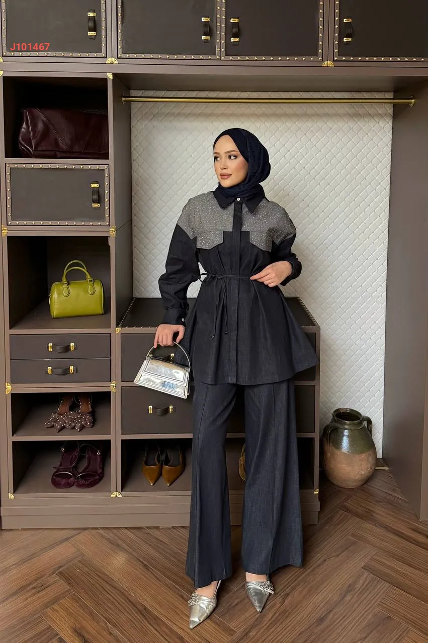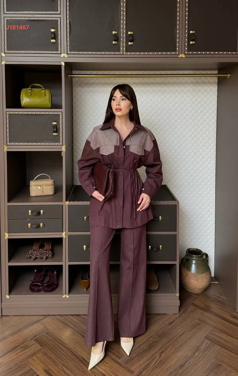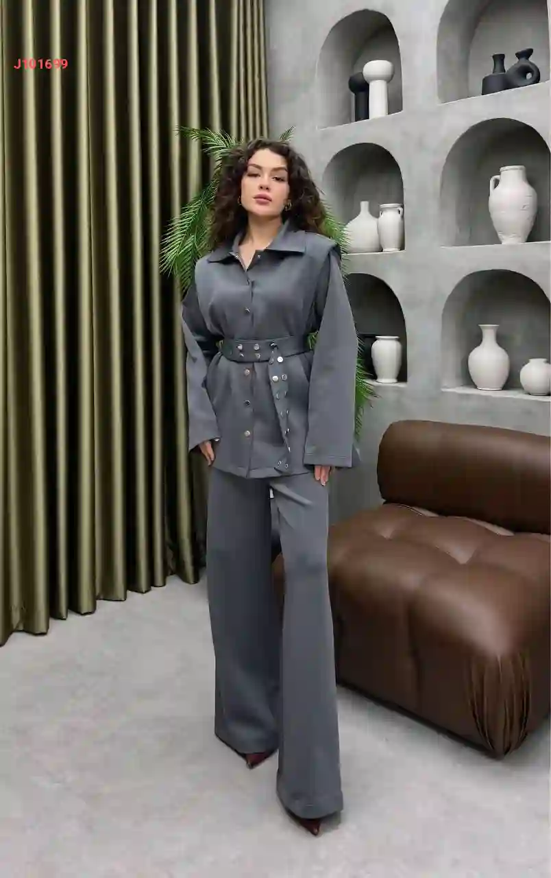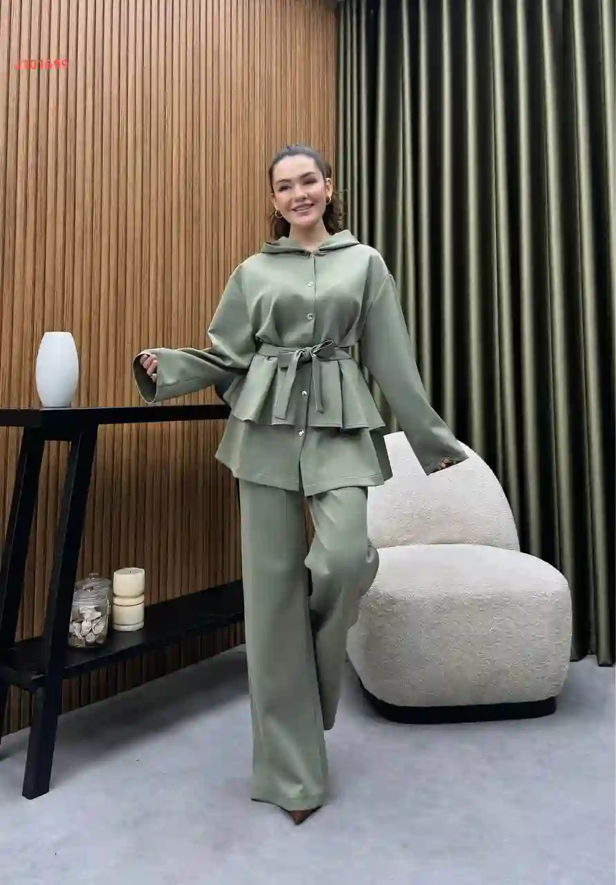 طقم قطعتين بأزرار مخفية، مع ربطة خصر