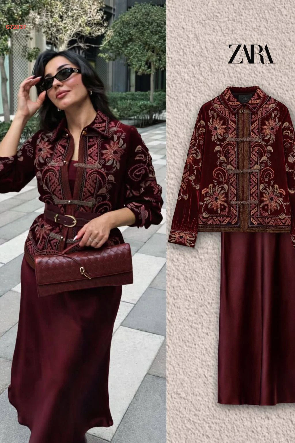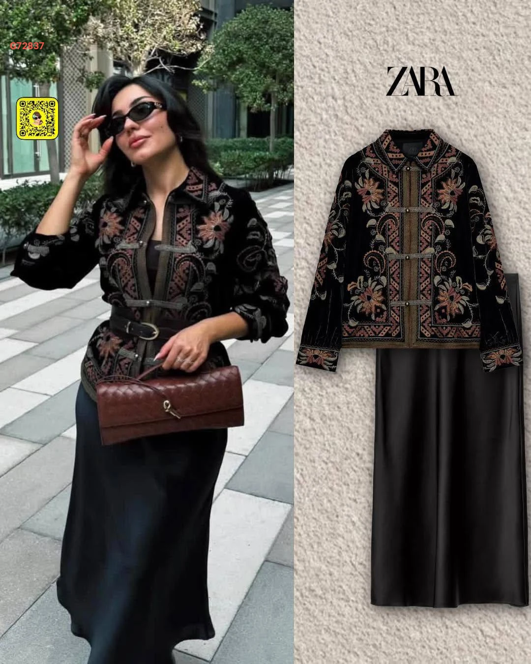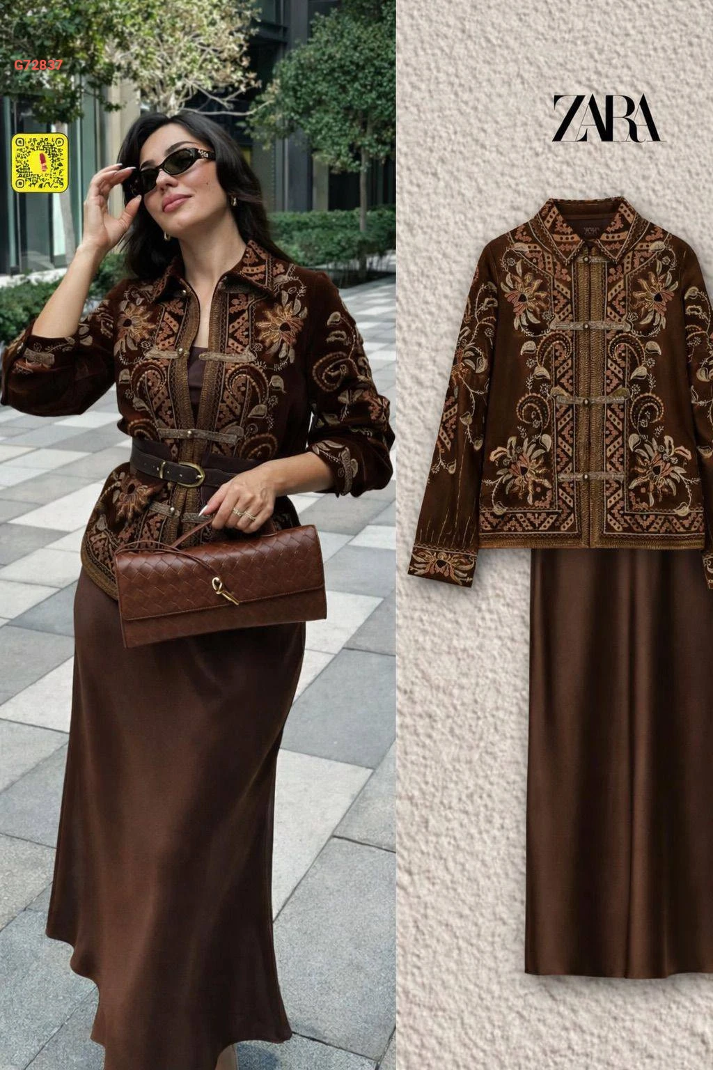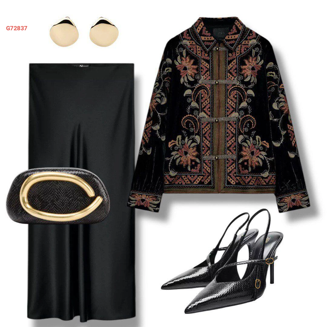 طقم قطعتين تنورة سادة ساتان، جاكيت مطرزة بأزرار