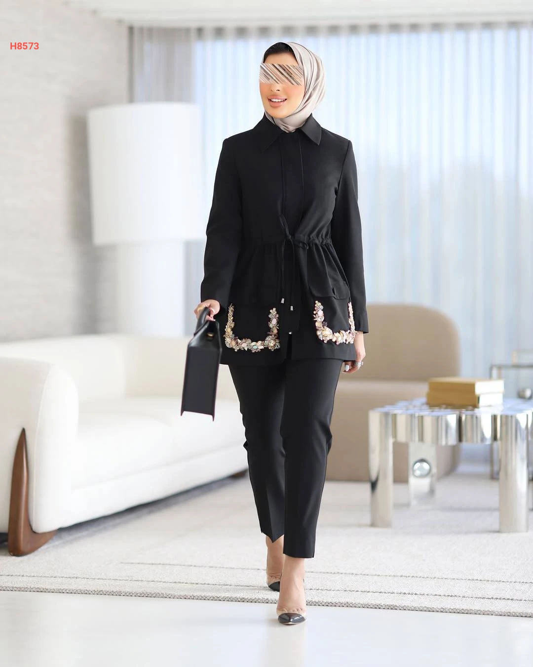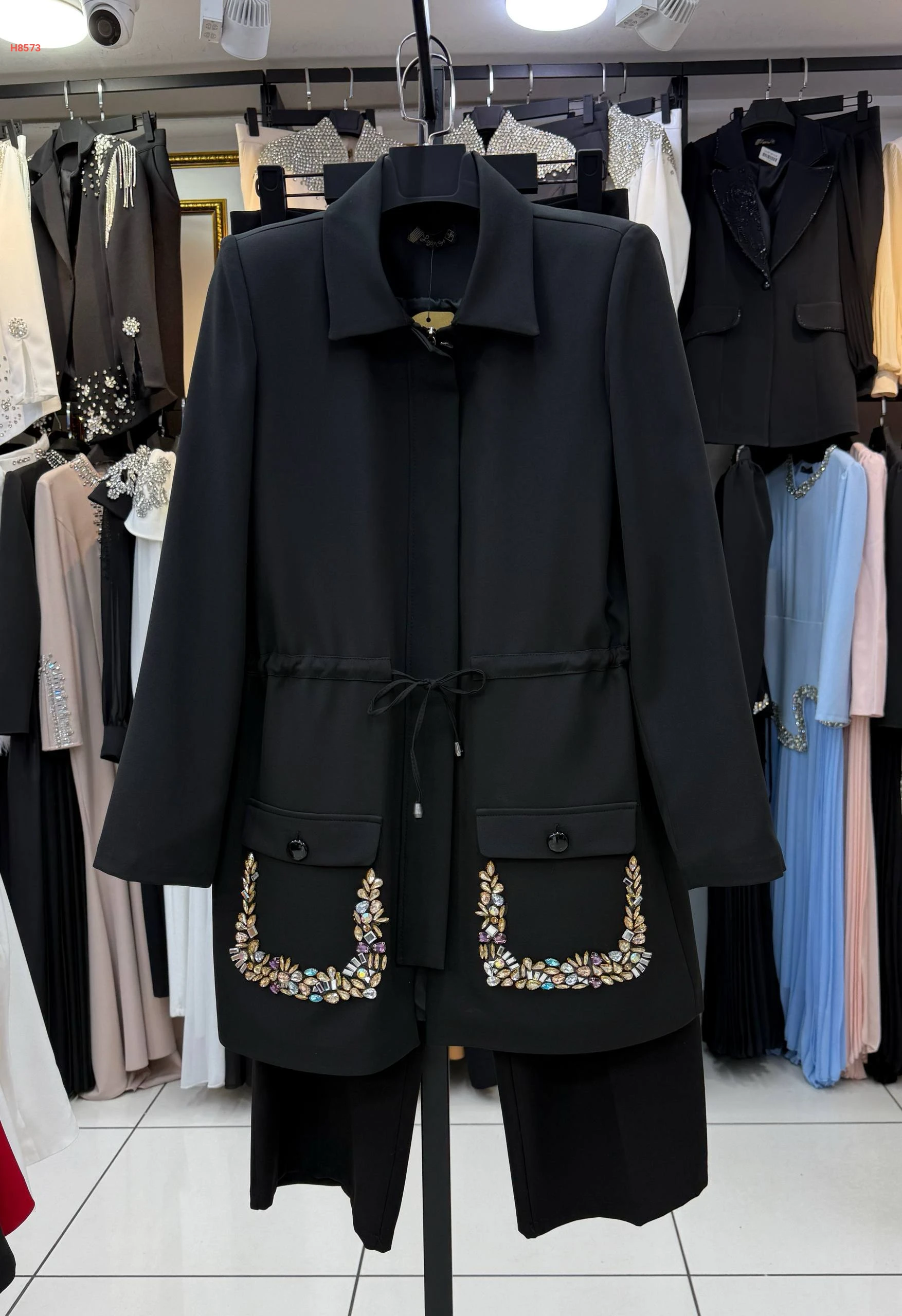 طقم قطعتين بسحاب مخفي مع زمة خصر وجيب مزينة بالكريستال