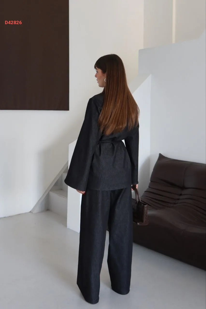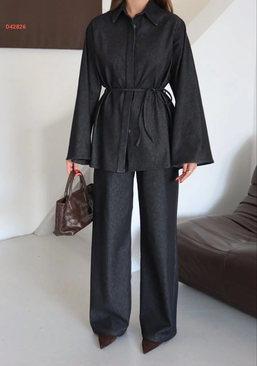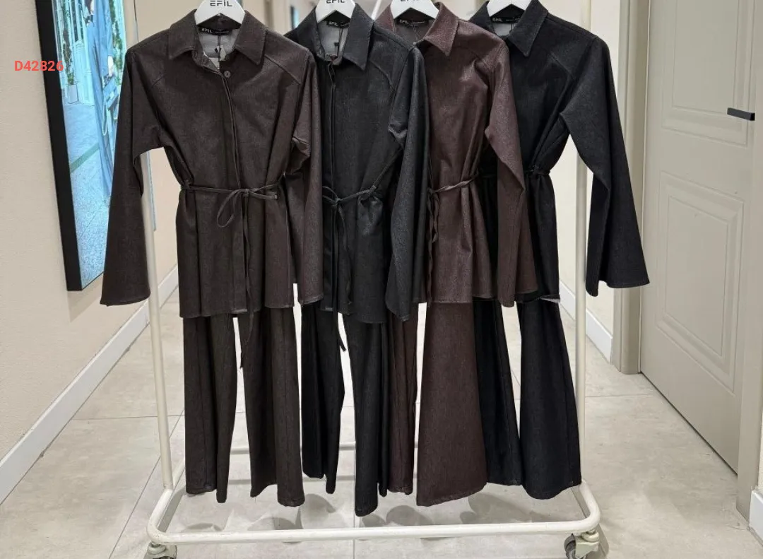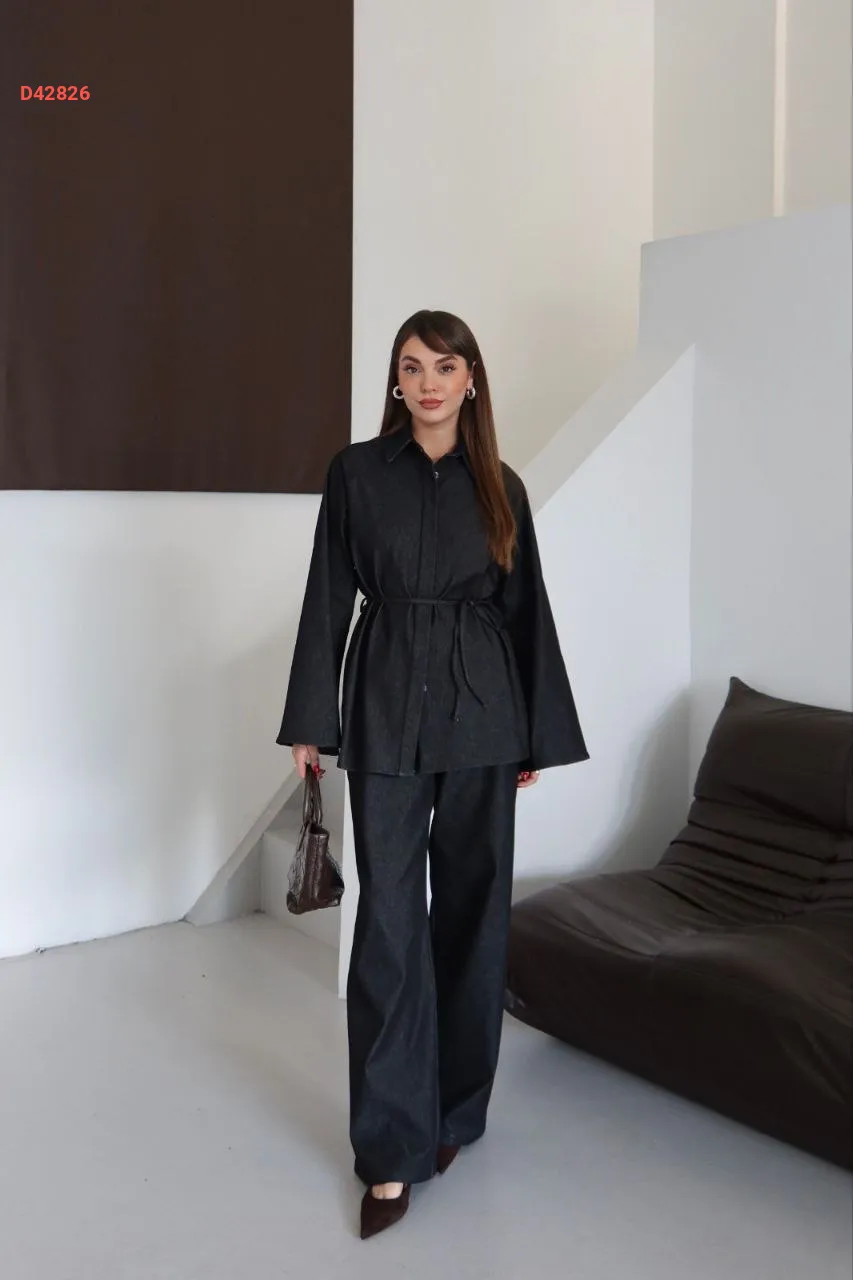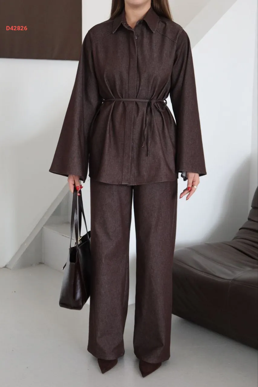 طقم قطعتين ، بأزرار مخفية مع ربطة خصر