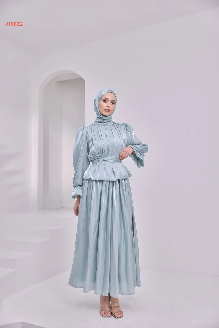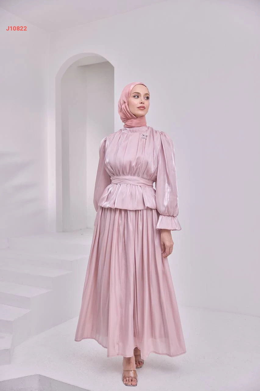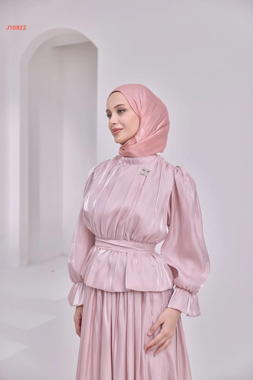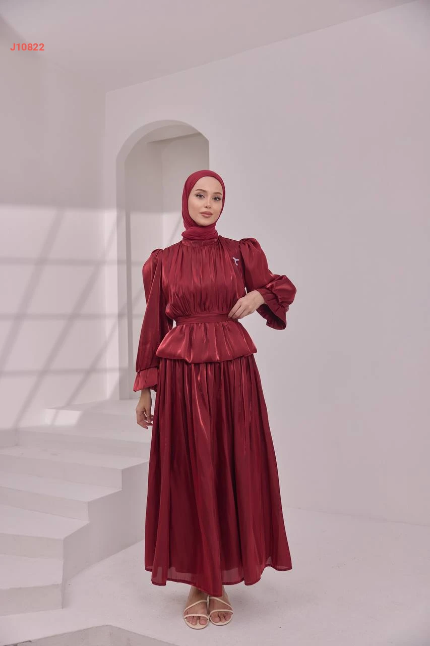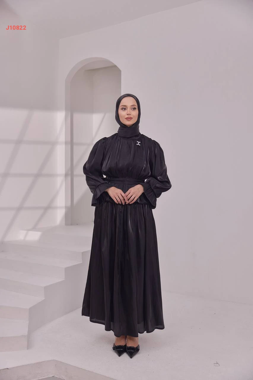 طقم تنورة قطعتين شيفون لامع سادة بياقة دائرية