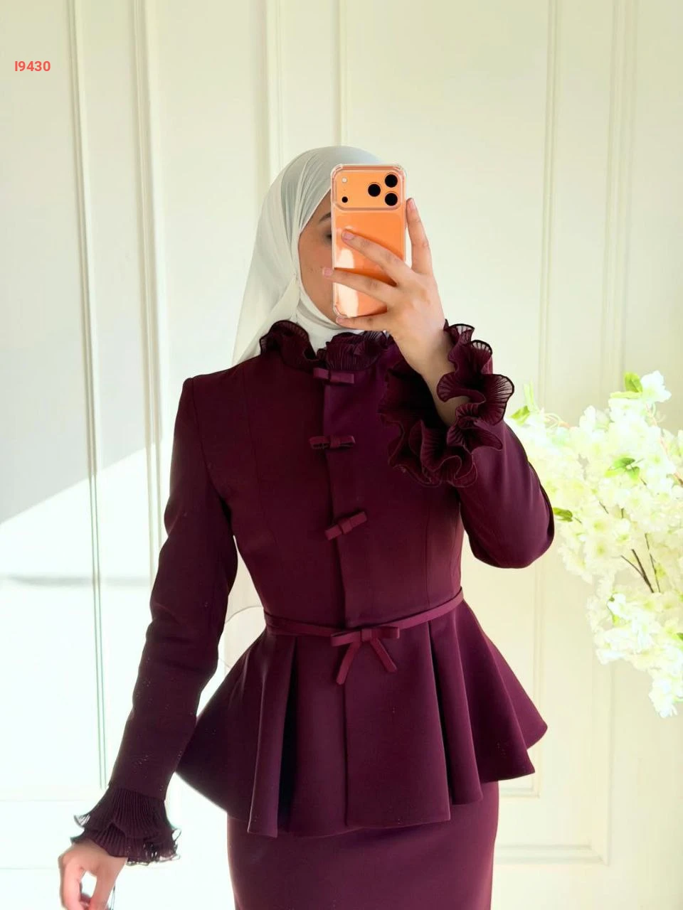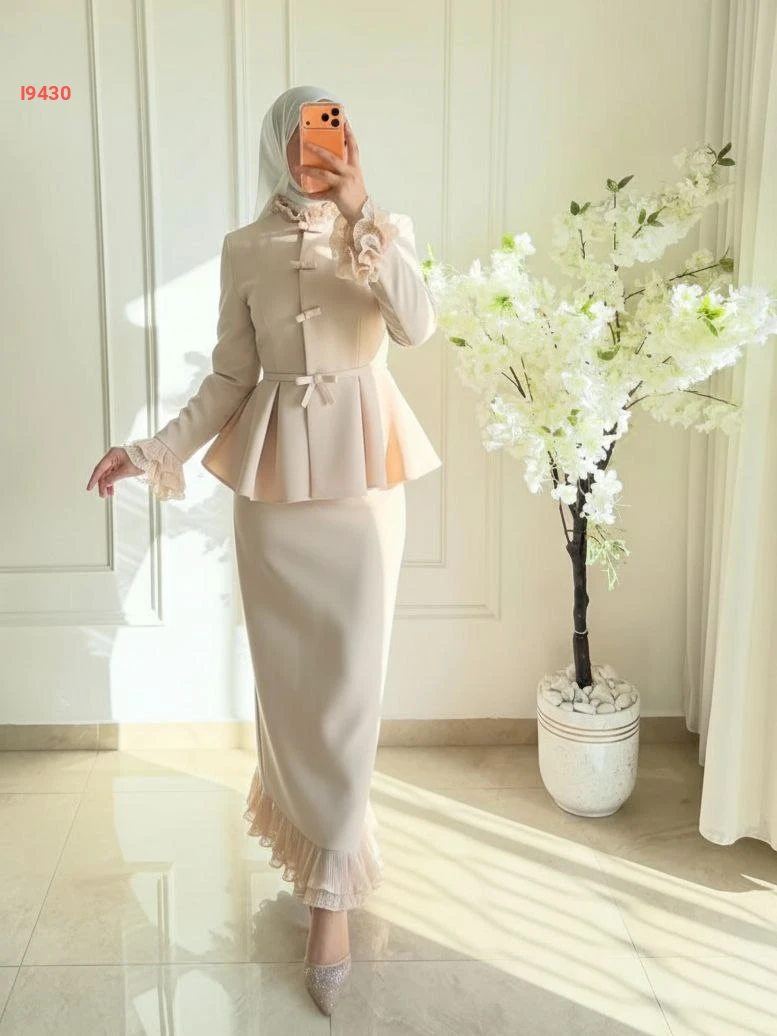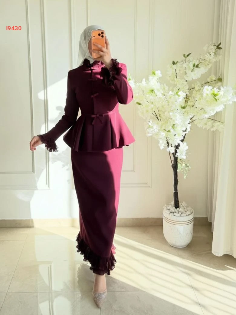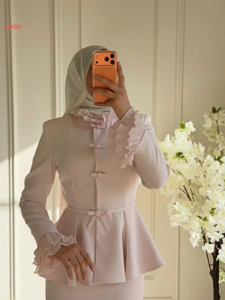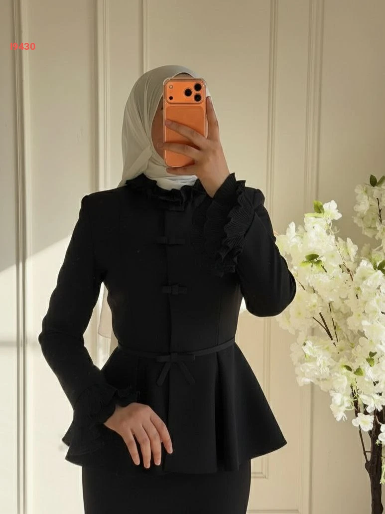 طقم تنورة للمناسبات قطعتين بأزرار مكشكش مع حزام