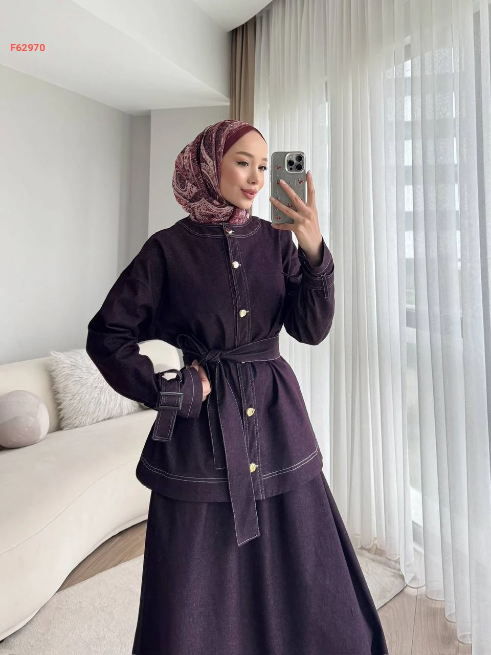 طقم تنورة قطعتين بأزرار مع حزام بياقة دائرية