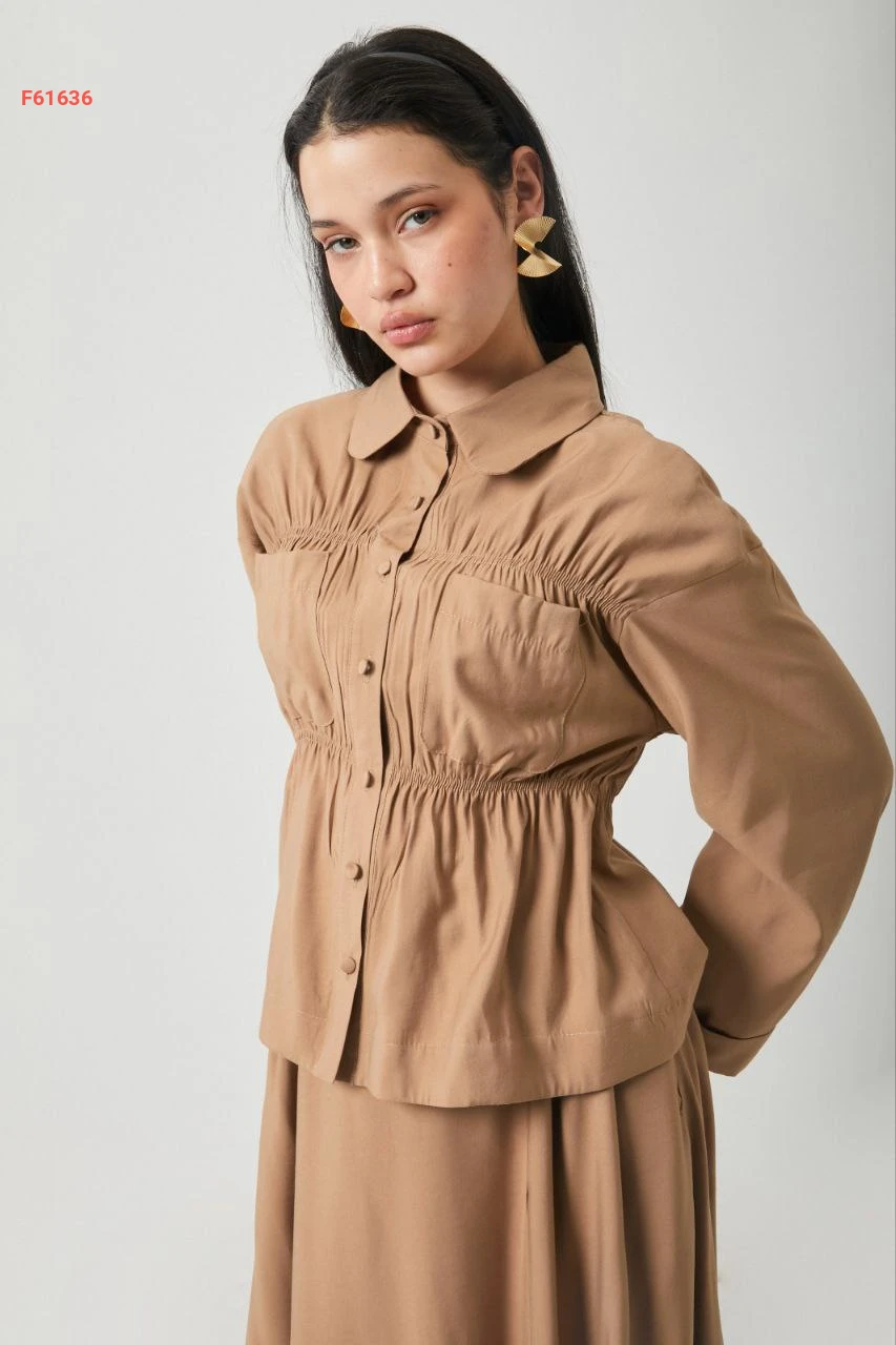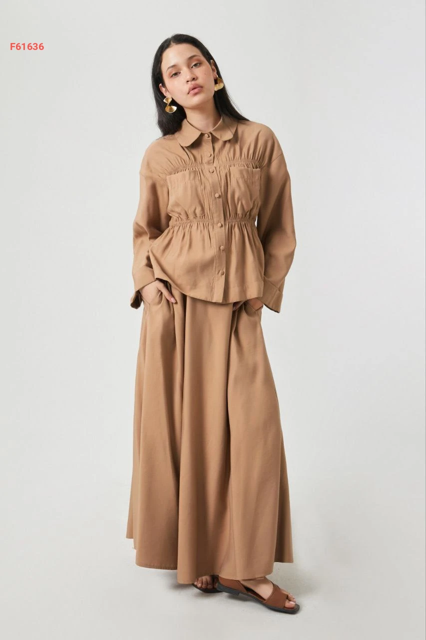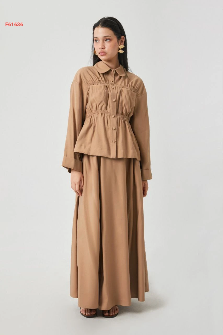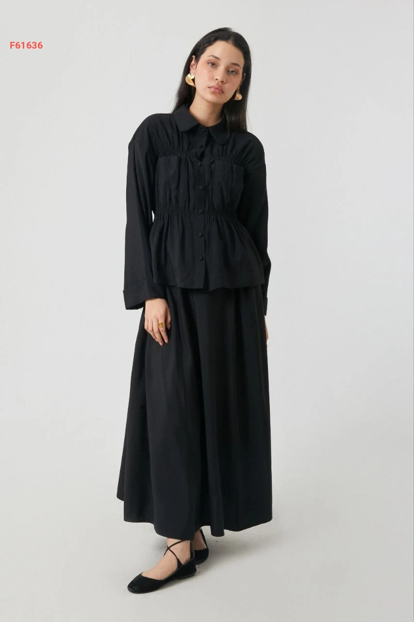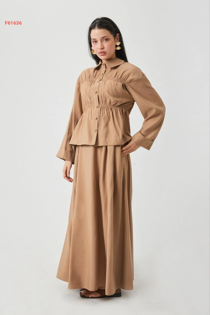 طقم تنورة قطعتين بأزرار مع زمة عند الخصر والصدر مع جيب