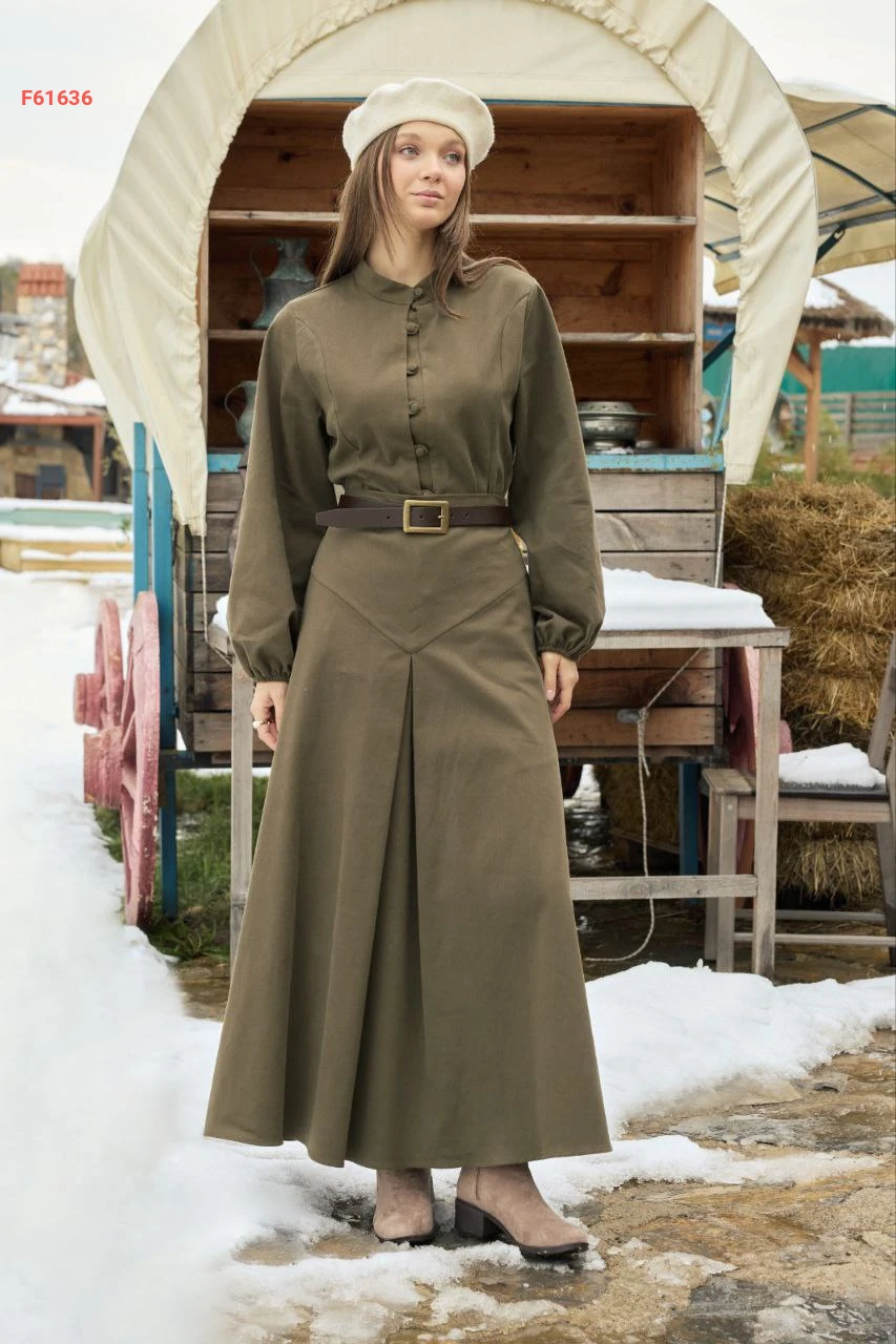 طقم تنورة قطعتين بأزرار سادة مع حزام بكسرات من الامام