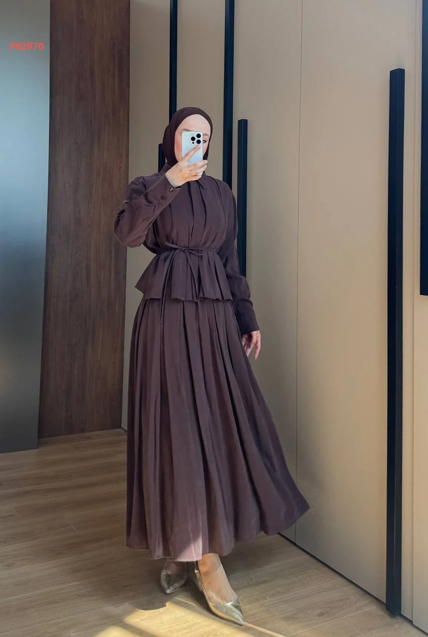 طقم تنورة قطعتين بكسرات مع ربطة خصر