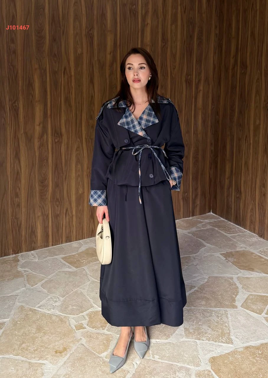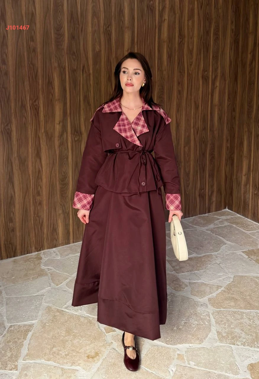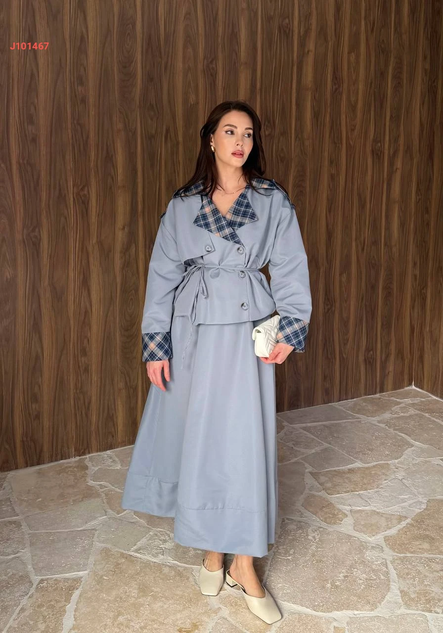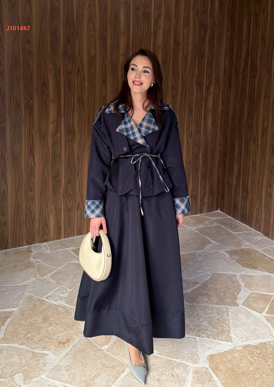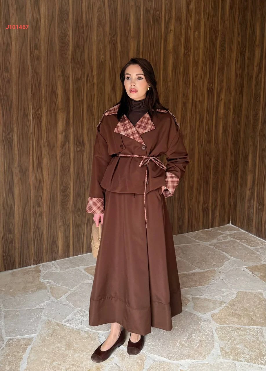 طقم تنورة قطعتين بأزرار جانبية مع ياقة كاروهات