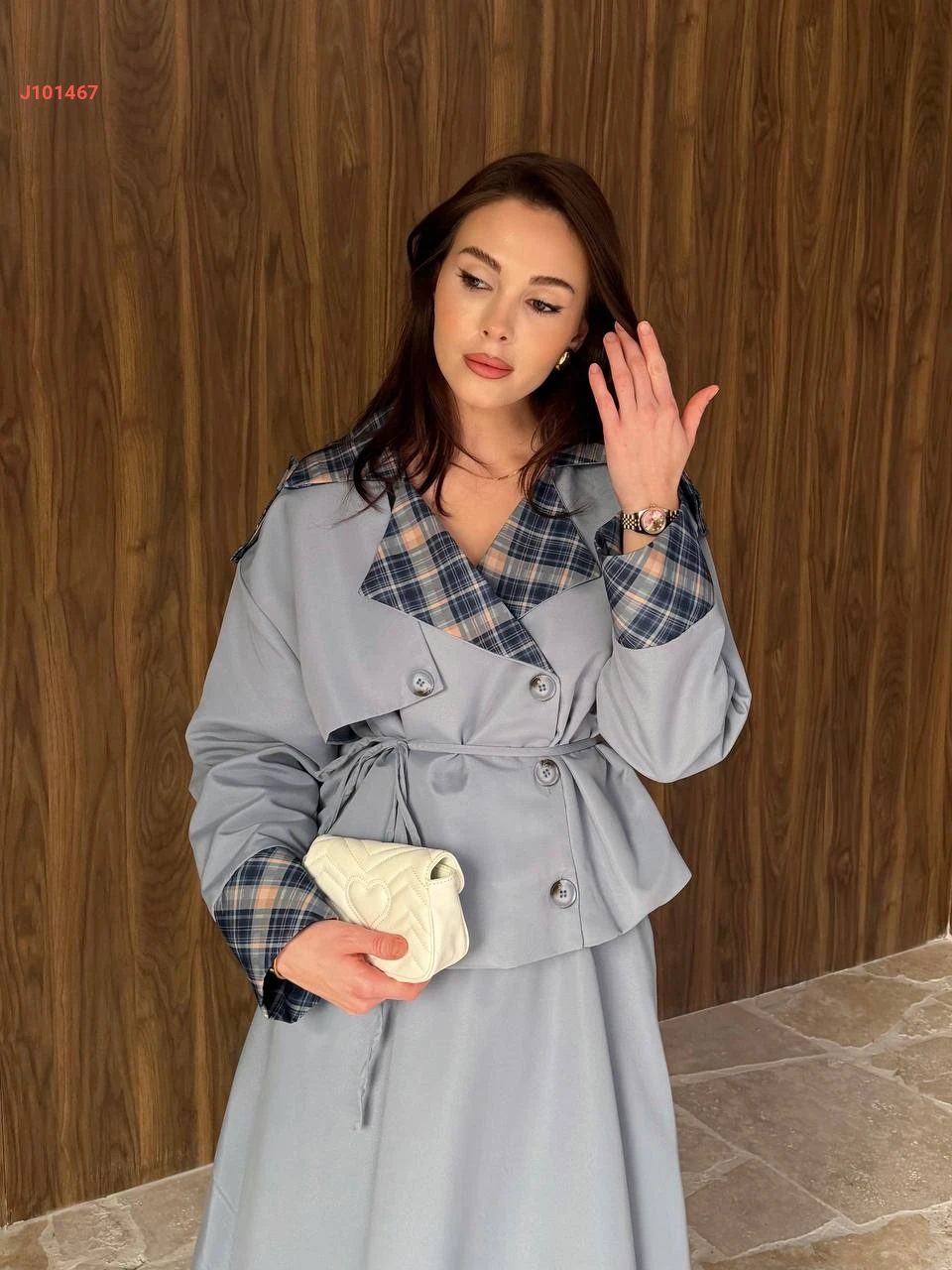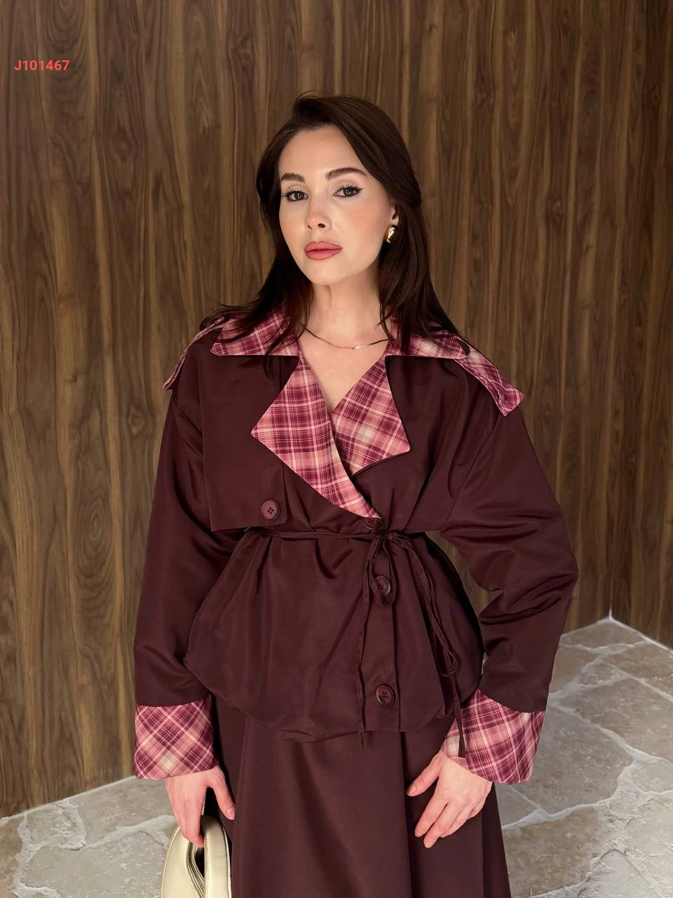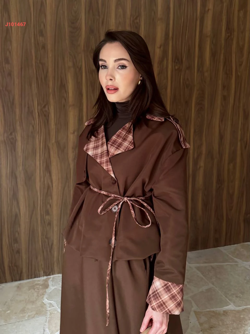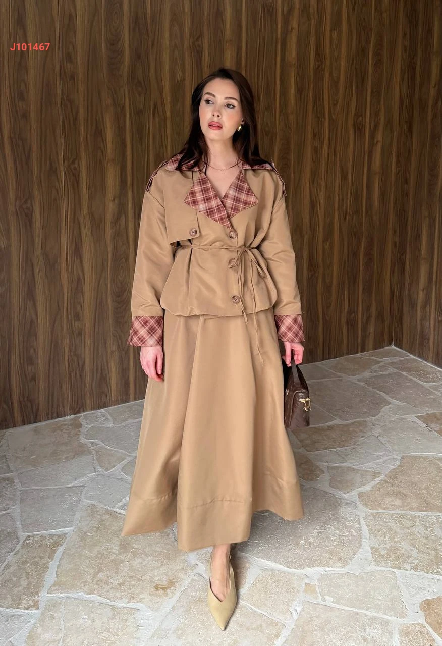 طقم تنورة قطعتين بأزرار جانبية مع ياقة كاروهات