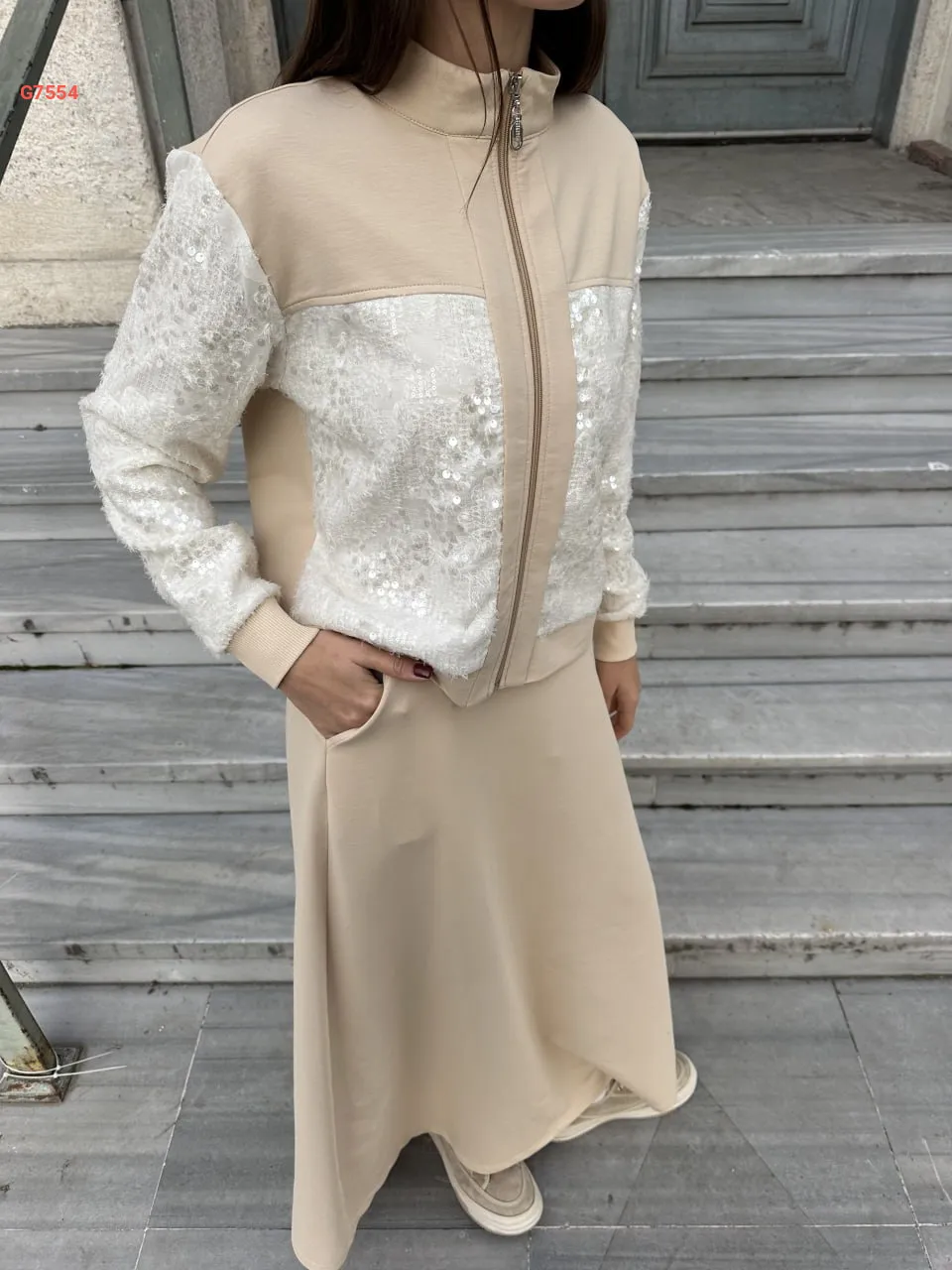 طقم تنورة قطعتين بسحاب مع برق عند الصدر و الأكمام