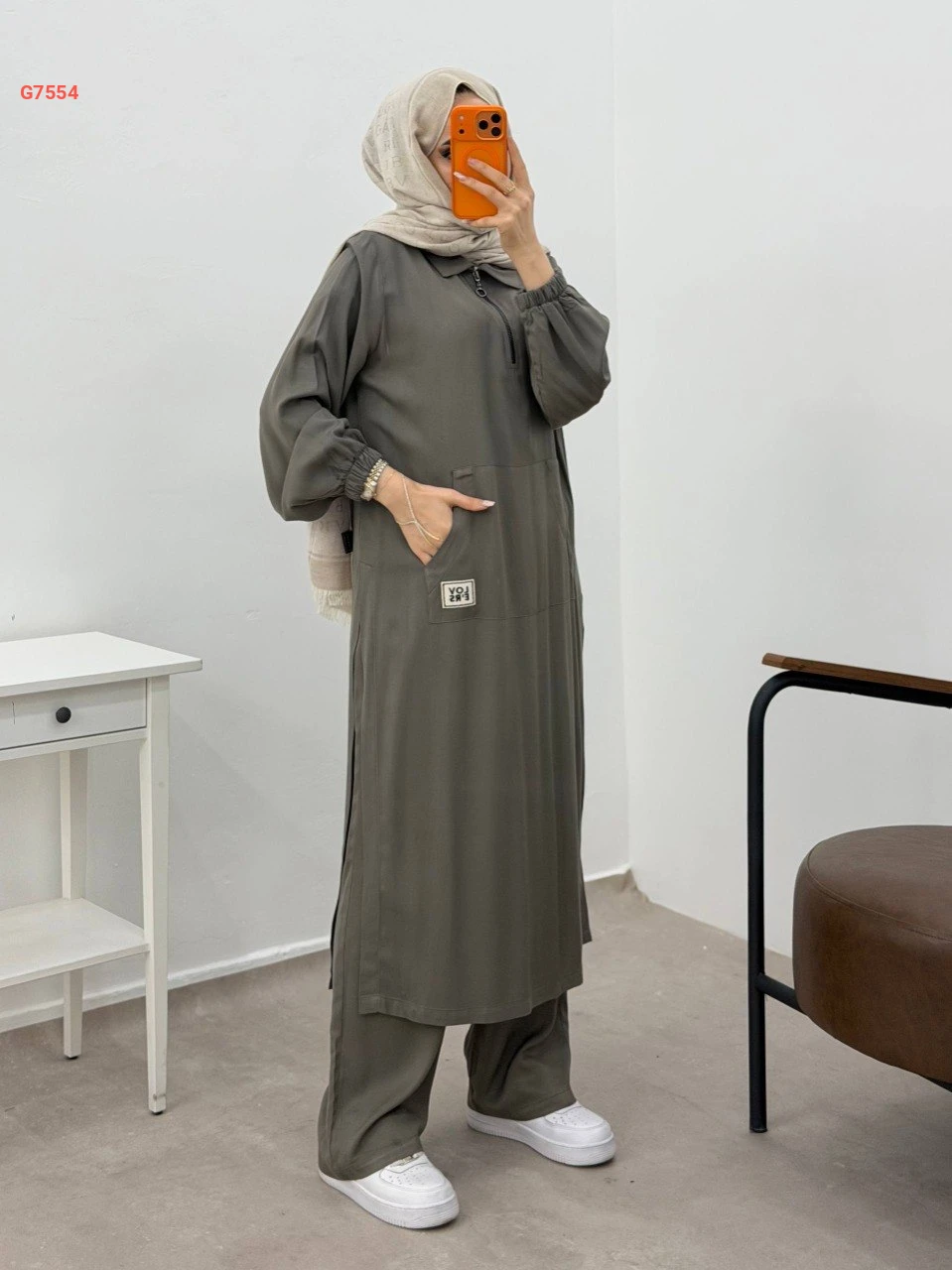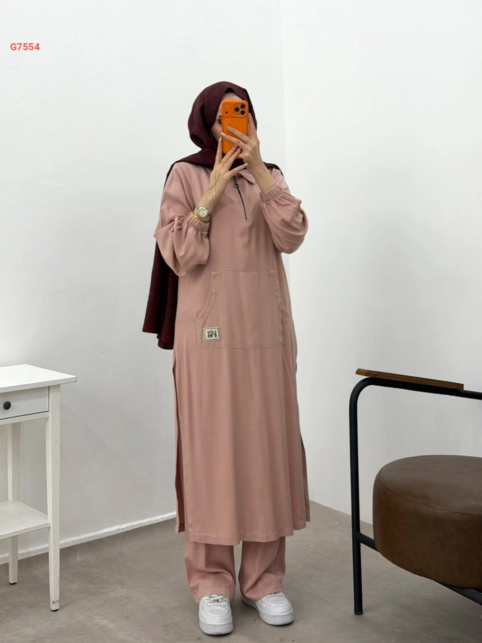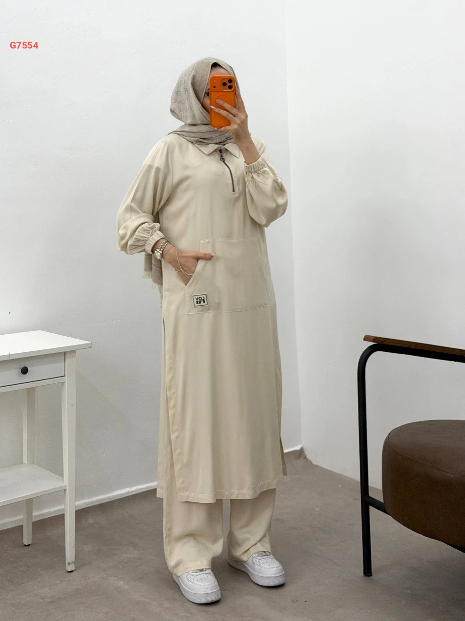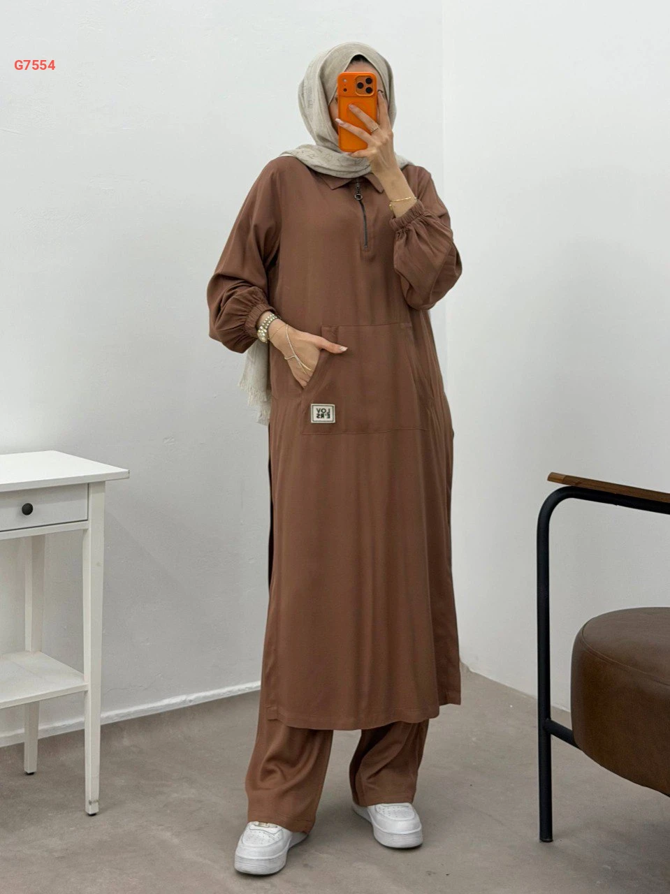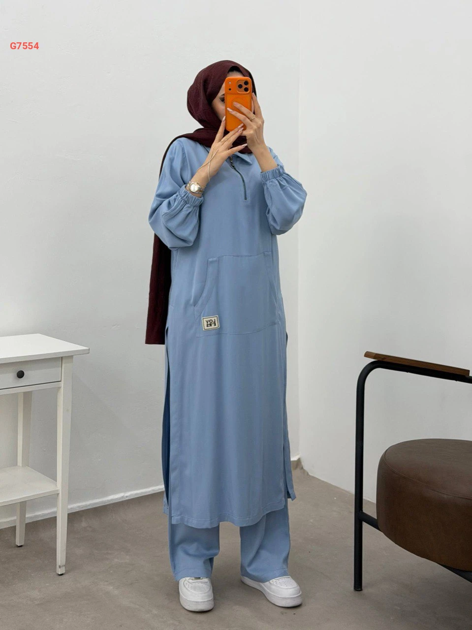 بيجامة سادة قطعتين بياقة مرتفعة مع سحاب وجيب